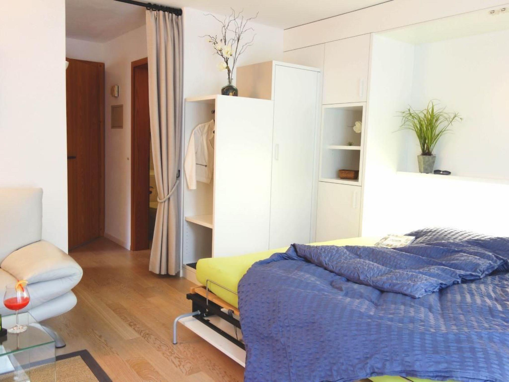 The outdoor area of the studio is characterised by its charming garden seating area, which is accessible from the ground floor via an arched doorway and is bathed in sunshine in the evening. There is also a private parking space in the underground car park, which is a significant convenience factor, especially for guests arriving by car.