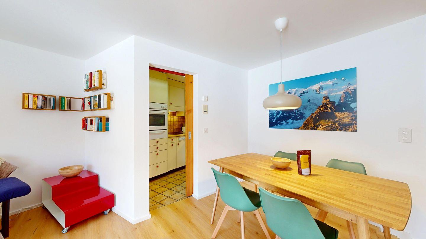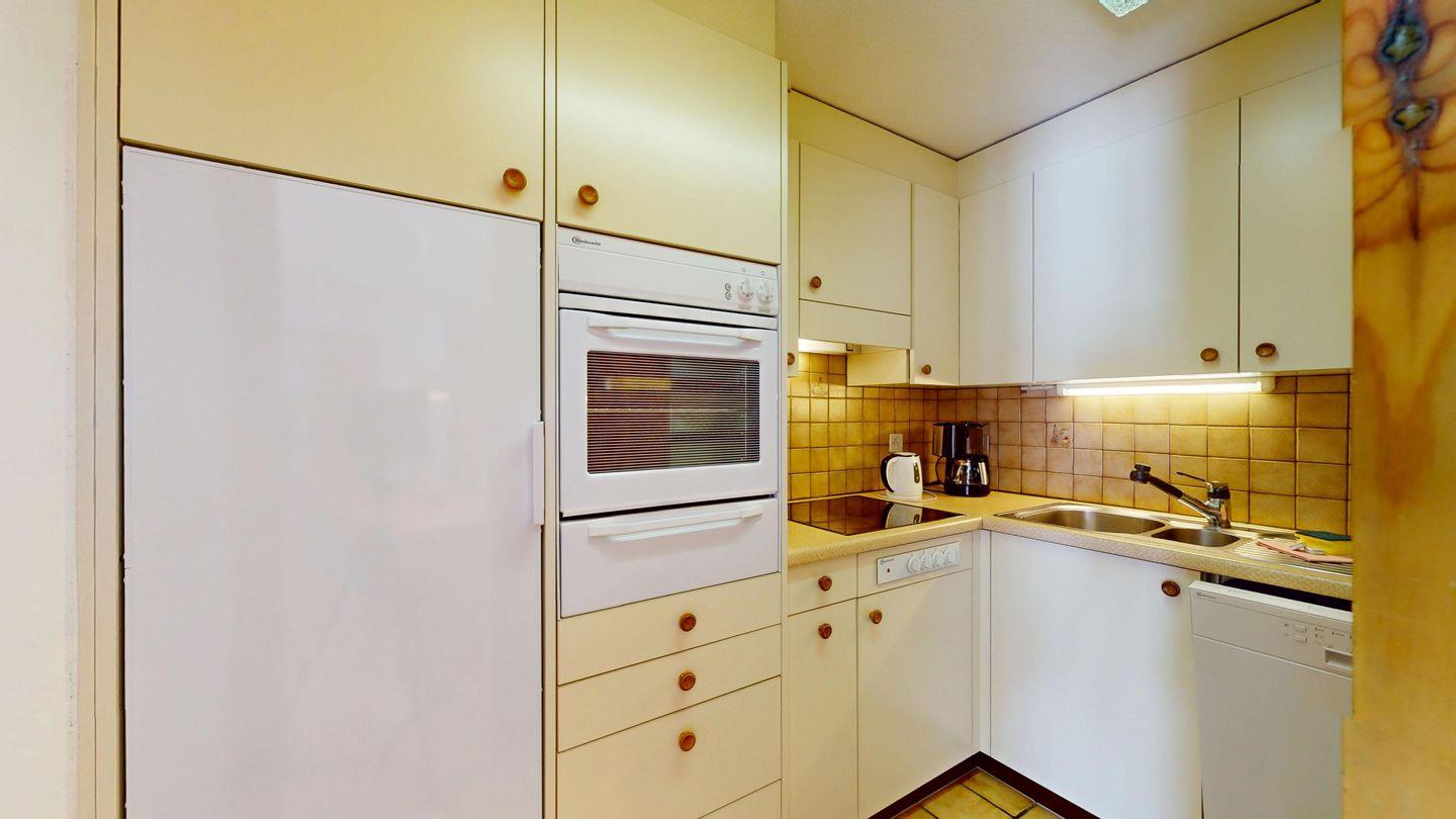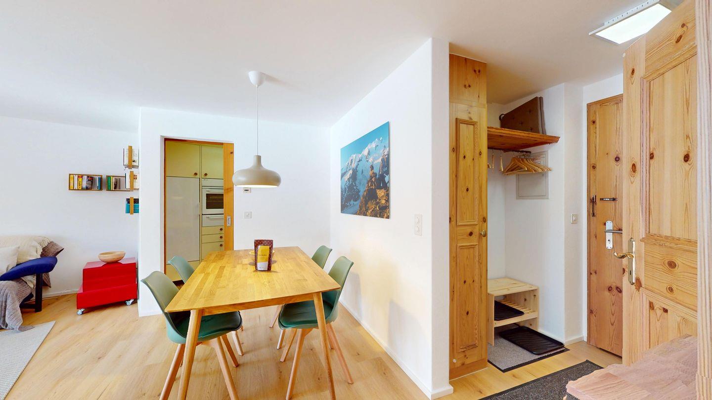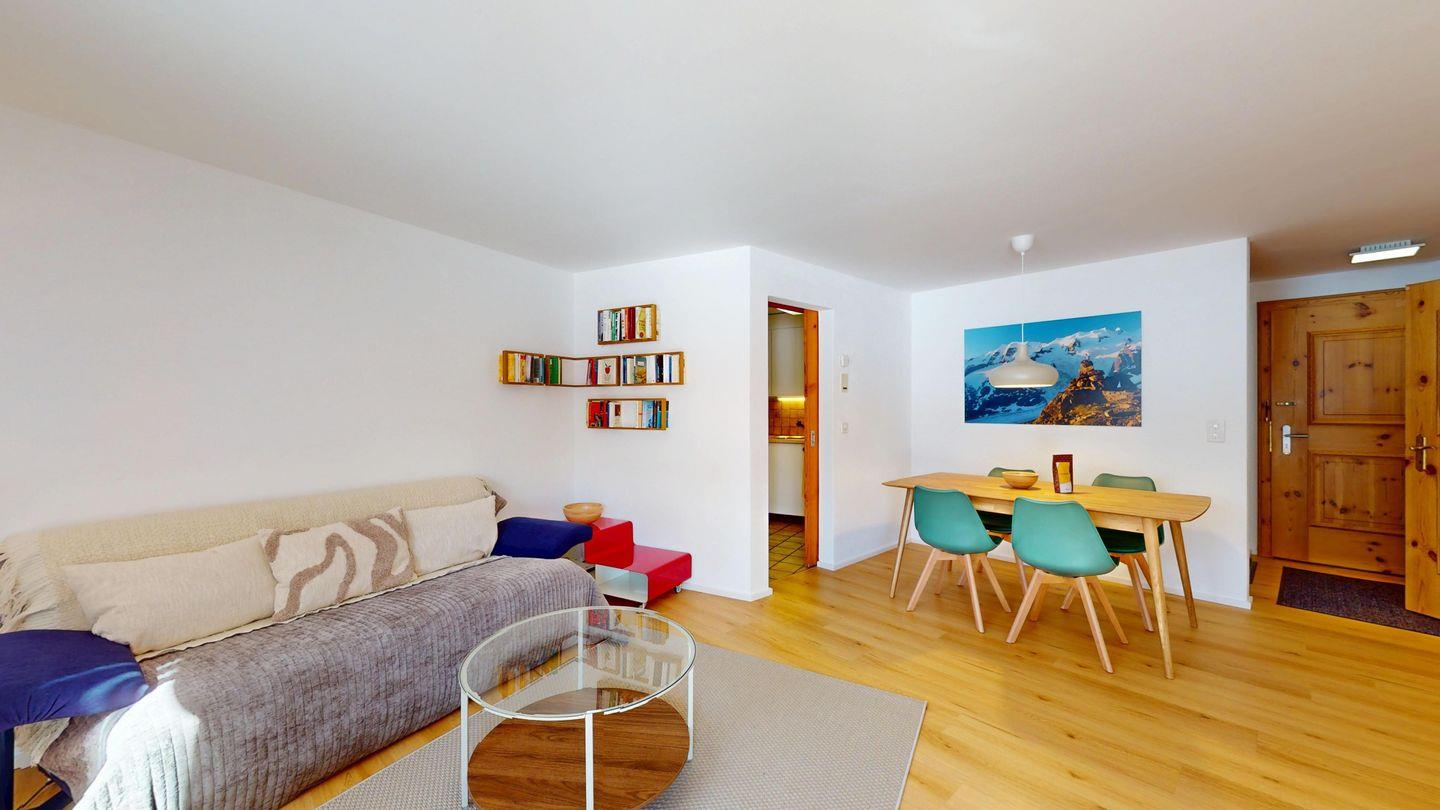 Helle 2-Zimmerwohnung im Erdgeschoss, 59 m², mit Wohn-/Esszimmer, Essecke, TV, Internet und sonniger Terrasse mit Bergblick. Geschlossene Küche mit Backofen und Geschirrspüler. Ein Doppelzimmer. Badezimmer mit Dusche/WC/Lavabo. Separates WC. Ein Garagenplatz. Haustiere sind erlaubt. Gemeinschaftlicher Skikeller und Waschküche.