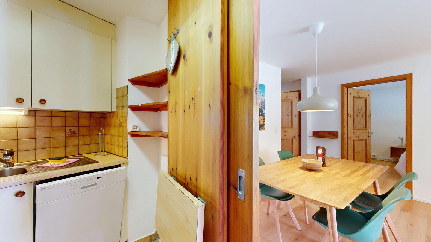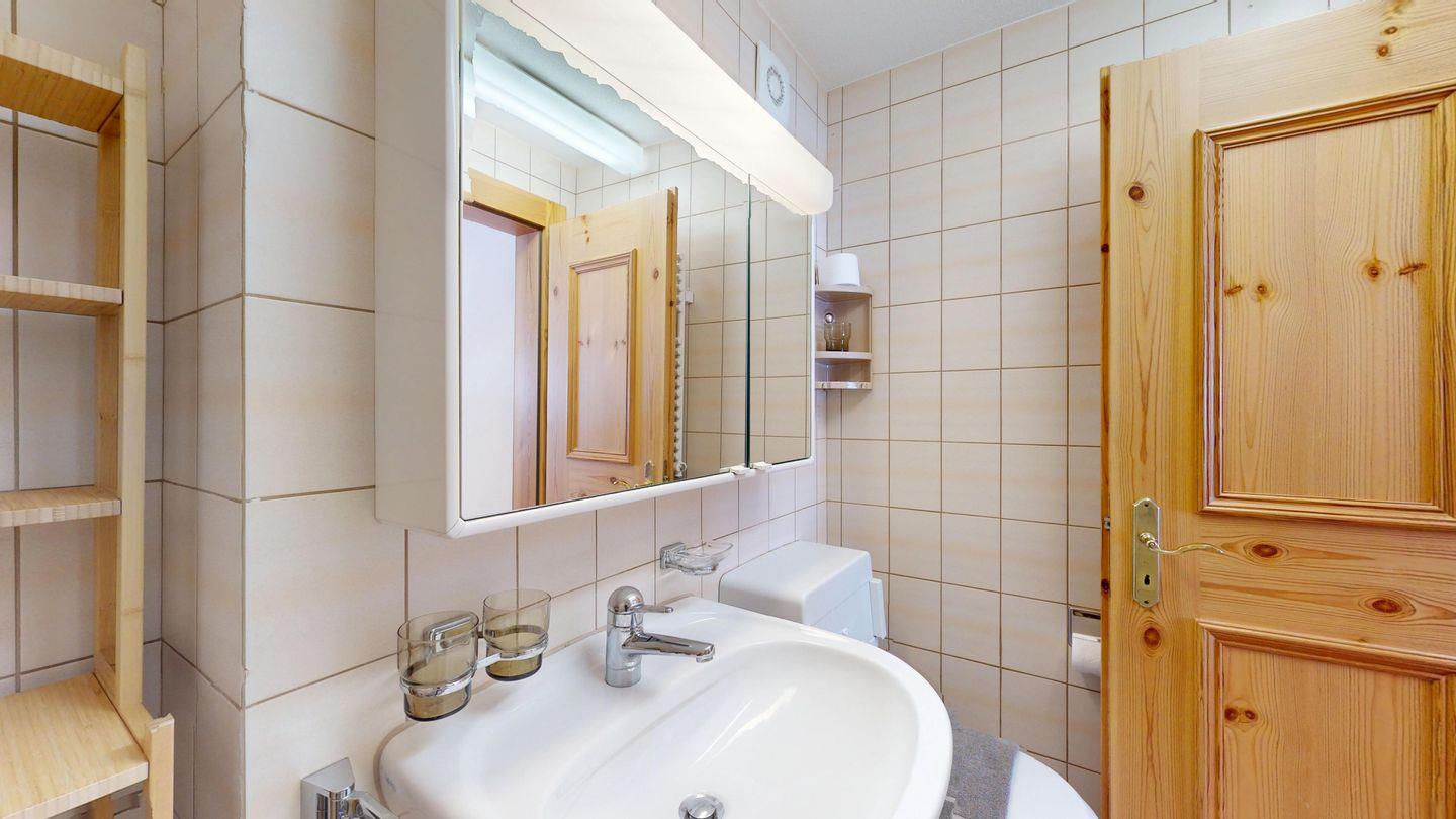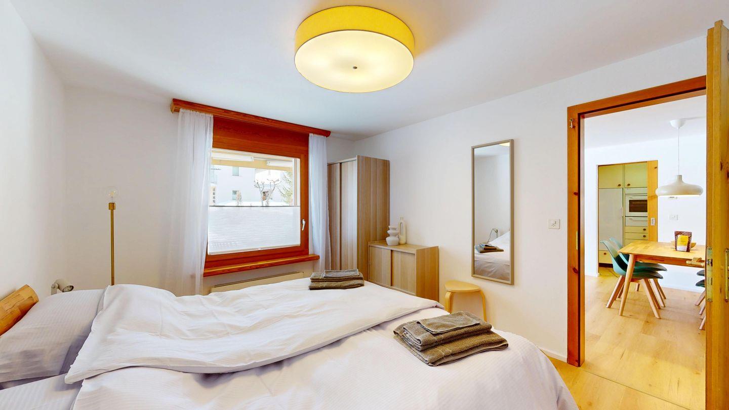 Helle 2-Zimmerwohnung im Erdgeschoss, 59 m², mit Wohn-/Esszimmer, Essecke, TV, Internet und sonniger Terrasse mit Bergblick. Geschlossene Küche mit Backofen und Geschirrspüler. Ein Doppelzimmer. Badezimmer mit Dusche/WC/Lavabo. Separates WC. Ein Garagenplatz. Haustiere sind erlaubt. Gemeinschaftlicher Skikeller und Waschküche.