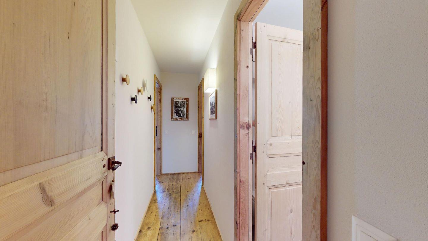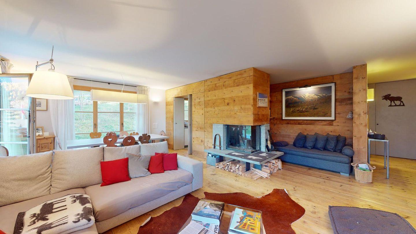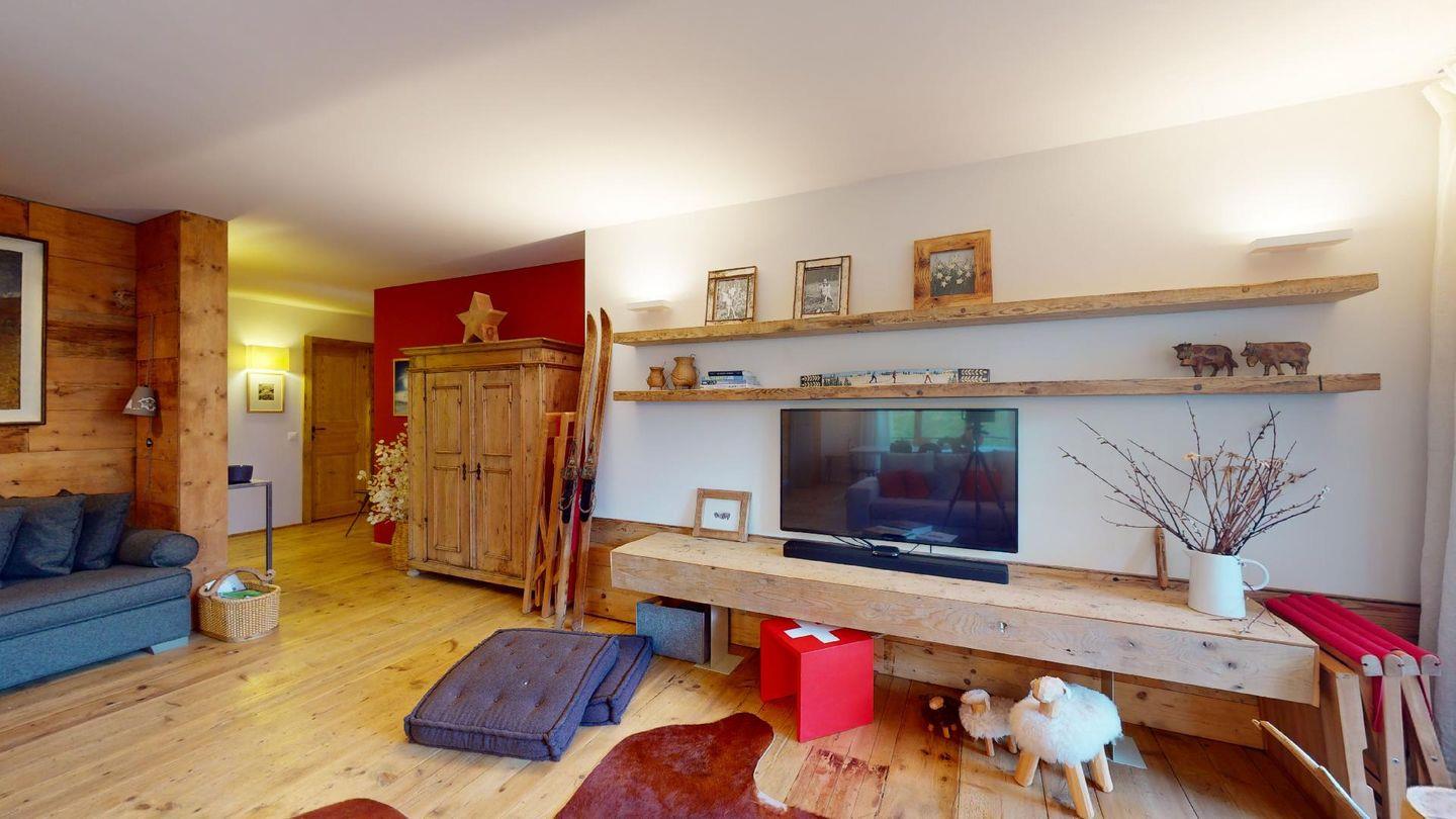 Eingang mit Garderobe. Sehr grosses helles Wohnzimmer mit Kamin, Ausgang auf die ausladende Terrasse, Esstisch. TV, Radio und Internet. Schliessbare Küche mit Backofen, Kühlschrank, Gefrierfach, Geschirrspülmaschine, Nespresso Kaffeemaschine. Ein Doppelzimmer mit Bad mit Wanne/WC/Bidet und Lavabo. Ein Gäste-Bad mit Dusche/WC/Lavabo und Handtuchwärmer. Ein Bad mit Dusche/WC/Bidet und Lavabo. Ein Doppelzimmer mit 2 Einzelbetten. Ein Zimmer mit Etagenbett und Sofa. Zwei Garagenparkplätze. Skiraum zur Mitbenutzung. Haustiere nicht erlaubt. Nichtraucher Wohnung. Keine Waschmaschine vorhanden. Cheminée nicht nutzbar.