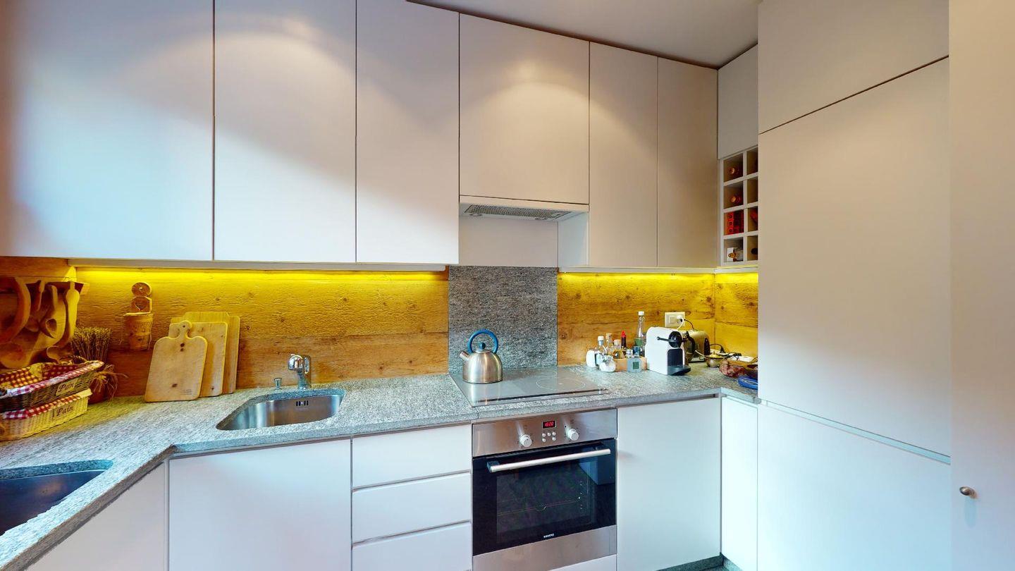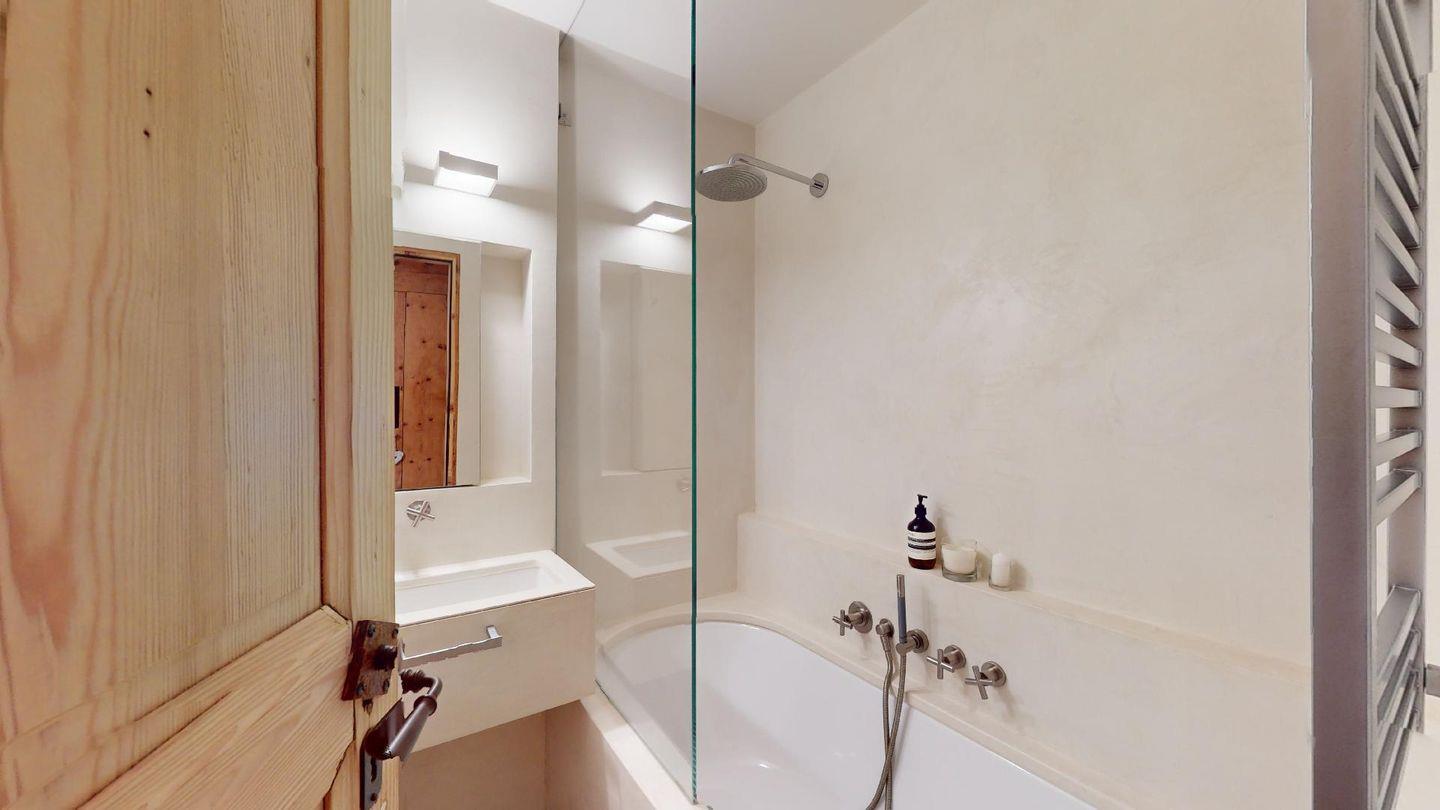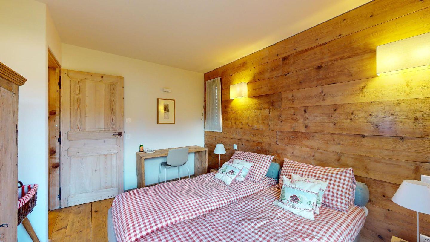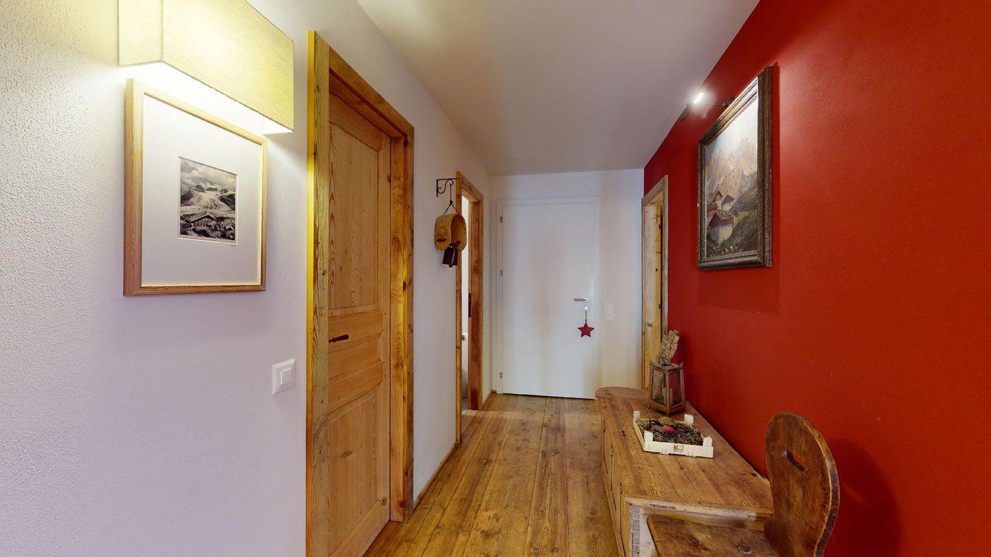 Eingang mit Garderobe. Sehr grosses helles Wohnzimmer mit Kamin, Ausgang auf die ausladende Terrasse, Esstisch. TV, Radio und Internet. Schliessbare Küche mit Backofen, Kühlschrank, Gefrierfach, Geschirrspülmaschine, Nespresso Kaffeemaschine. Ein Doppelzimmer mit Bad mit Wanne/WC/Bidet und Lavabo. Ein Gäste-Bad mit Dusche/WC/Lavabo und Handtuchwärmer. Ein Bad mit Dusche/WC/Bidet und Lavabo. Ein Doppelzimmer mit 2 Einzelbetten. Ein Zimmer mit Etagenbett und Sofa. Zwei Garagenparkplätze. Skiraum zur Mitbenutzung. Haustiere nicht erlaubt. Nichtraucher Wohnung. Keine Waschmaschine vorhanden. Cheminée nicht nutzbar.