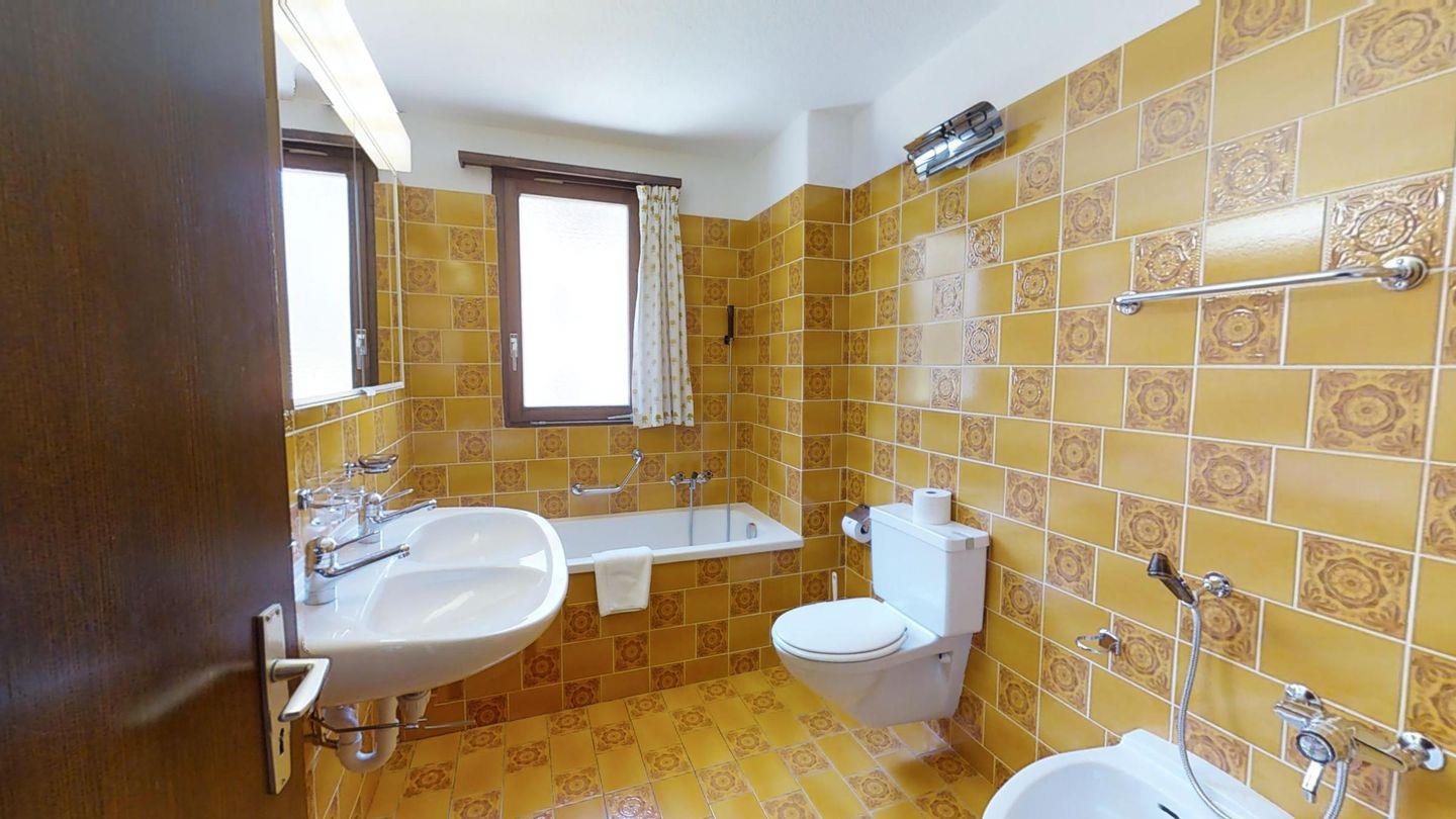 Teil renovierte 4½-Zimmerwohnung im zweiten Stock, ca. 120m2. Eingang mit Garderobe. Wohn-/ Esszimmer mit Kamin und Südbalkon mit Bergsicht. Fernsehnische. Radio/Internet und Telefon. Neue separate Küche mit Backofen, Kühlschrank, Geschirrspülmaschine, Kaffeemaschine (De Longhi u. Chicco d'Oro), Toaster und Fondue. Renovierte Zimmer. Ein Doppelzimmer (2x90x200) mit Bad Wanne/WC/Doppellavabo/Bidet. Ein Zimmer mit Kajüttenbett (90x200). Dusche/WC/Lavabo. Ein Doppelzimmer (2x80x200). Gäste-WC. Bügeleisen und Bügelbrett. Komfortable Einrichtung. Waschküche und Skiraum zur gemeinsamen Benützung. Haustiere sind nicht erlaubt.