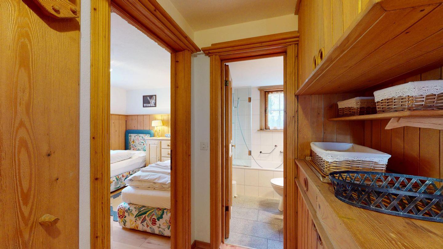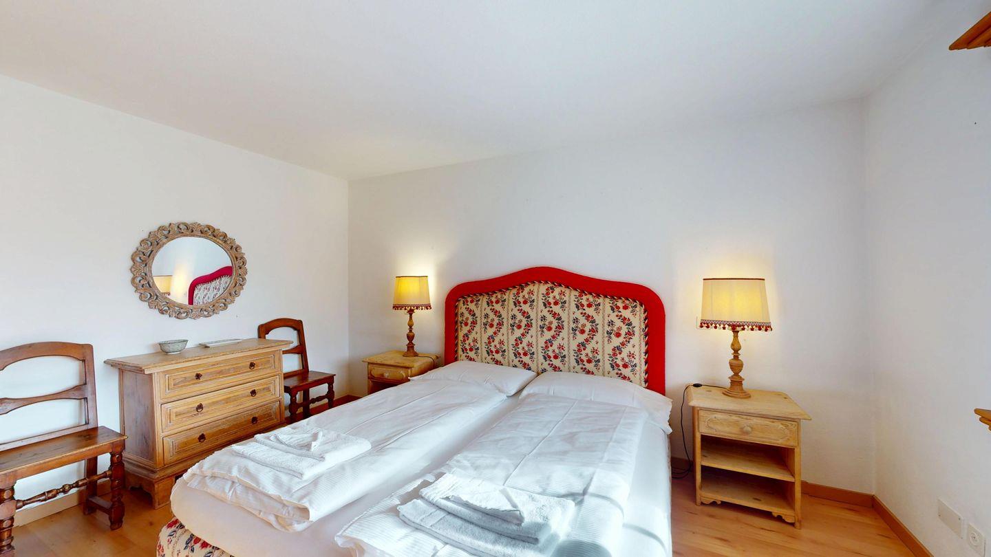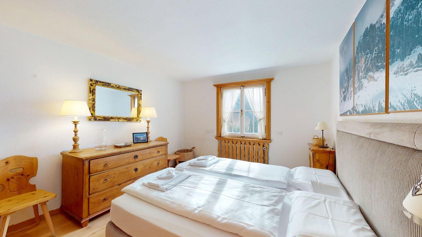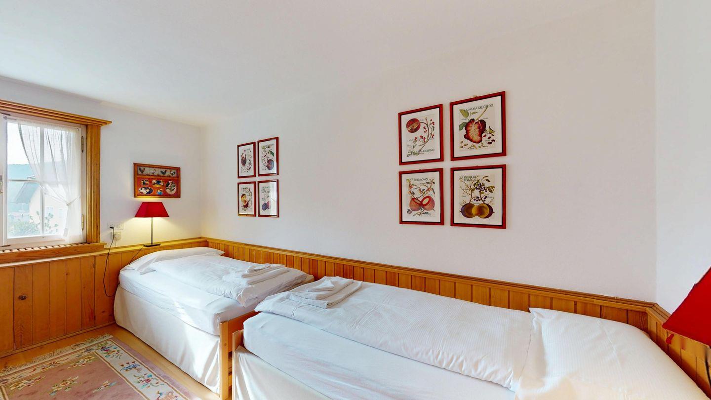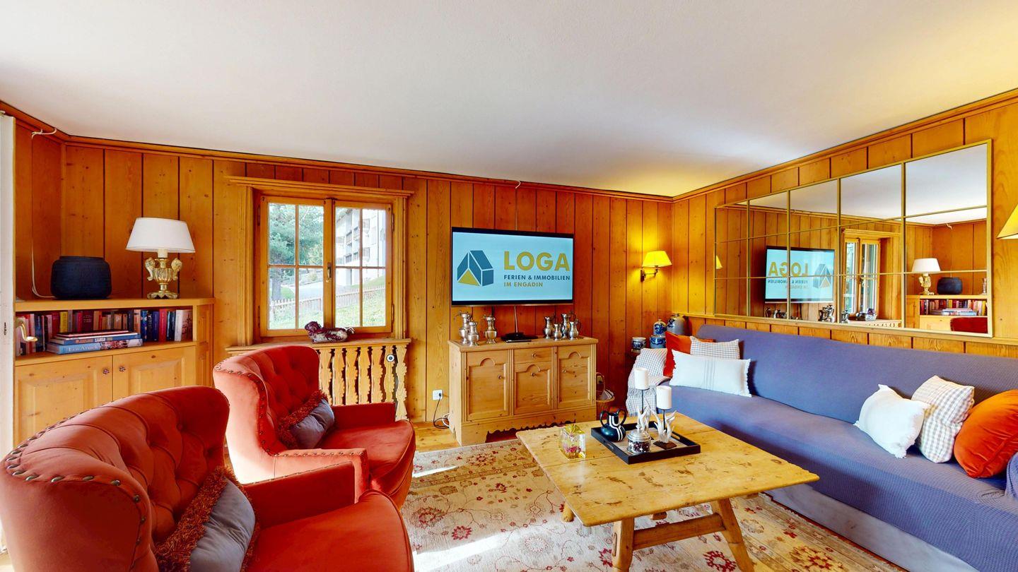 6-Zimmerwohnung im Erdgeschoss. Entree mit Garderobe. Wohn-/ Esszimmer mit Terrasse und Bergsicht, separate Küche mit Backofen, Kühlschrank, Chicco d'Oro Kaffeemaschine und Geschirrspülmaschine. Zwei Schlafzimmer mit je einem Doppelbett. Zwei Zimmer mit je zwei Einzelbetten. Ein Zimmer mit zwei Kinderbetten. Drei Badezimmer mit Badewanne/WC/Lavabo. TV und Internet. Holzböden im Schlaf- und Wohnzimmer. Garagenbox für ein Fahrzeug. Garage für ein Fahrzeug. Aussenparkplatz vor der Box. Ski und Skischuhe können im Skiraum oder in der Garage deponiert werden. Nichtraucherwohnung. Haustiere sind nicht erlaubt.