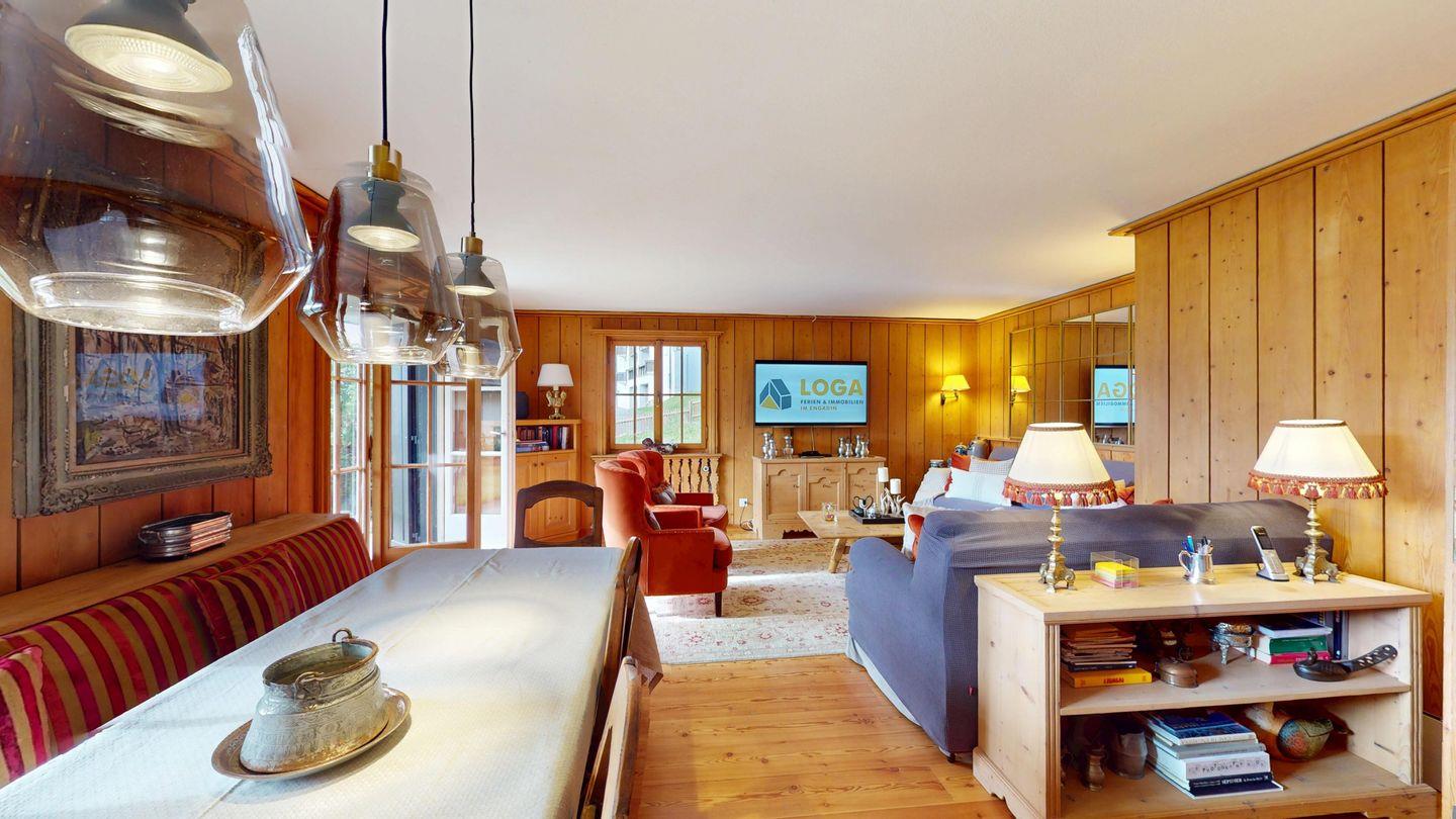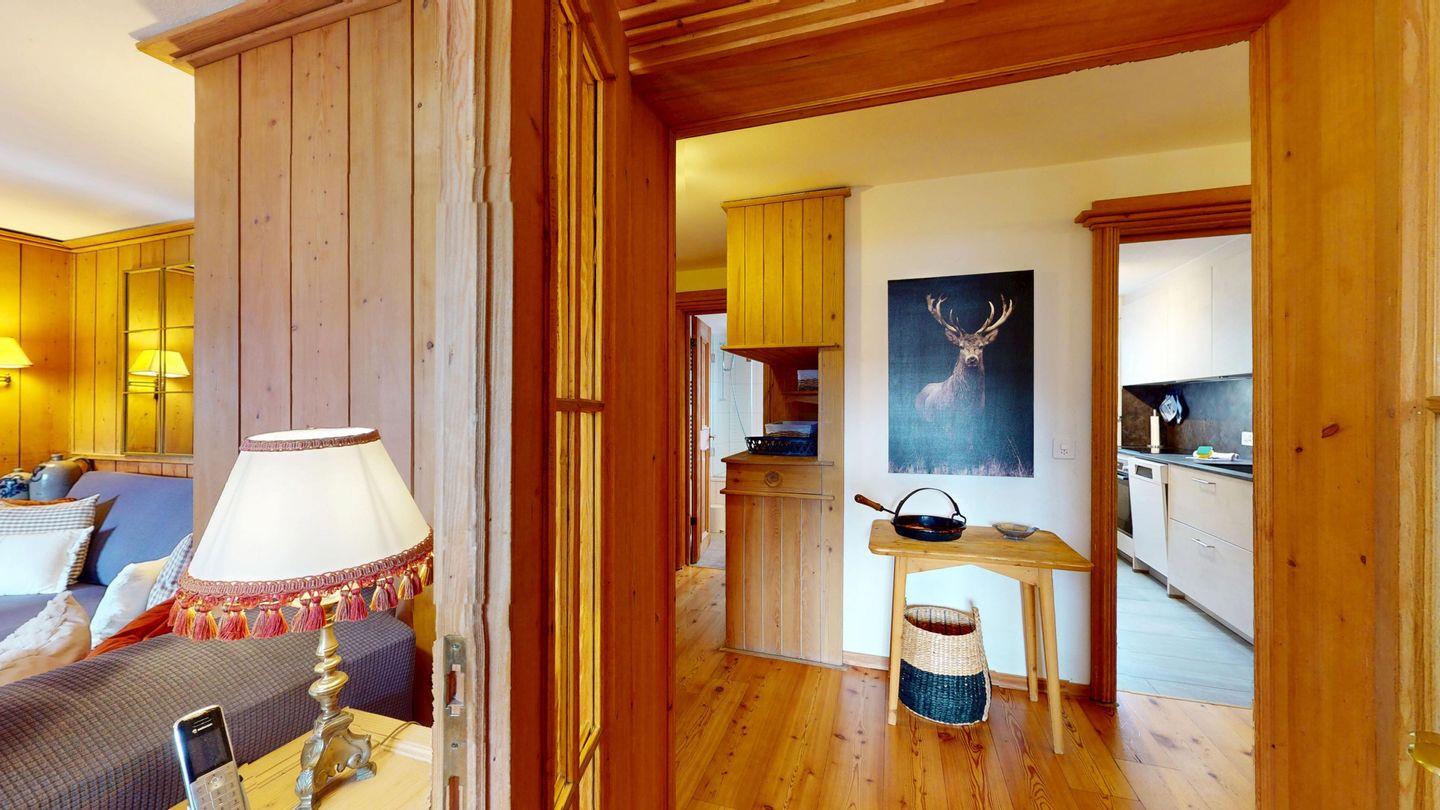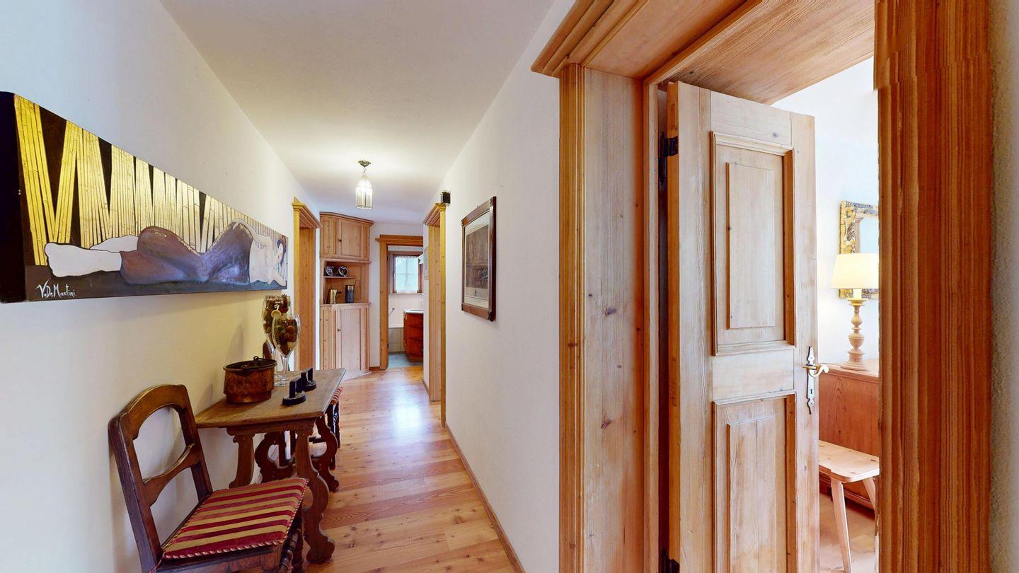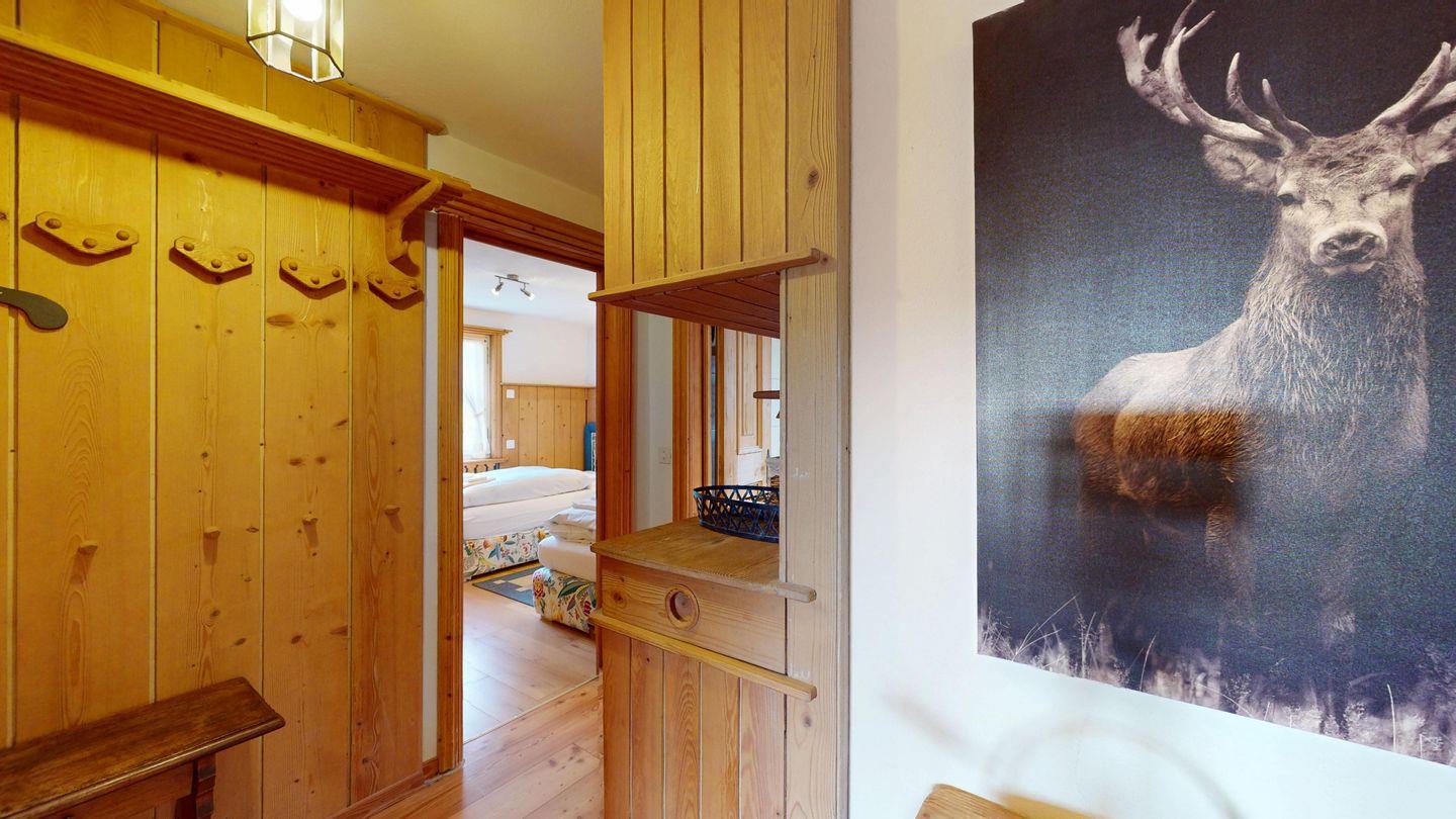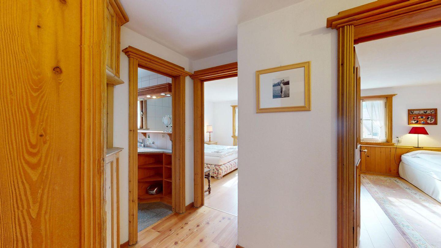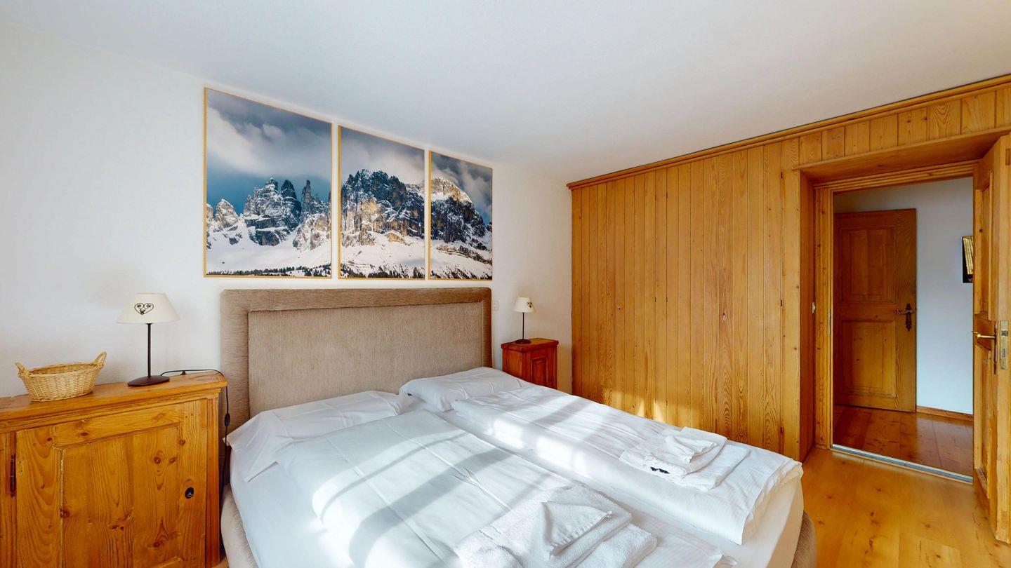 6-Zimmerwohnung im Erdgeschoss. Entree mit Garderobe. Wohn-/ Esszimmer mit Terrasse und Bergsicht, separate Küche mit Backofen, Kühlschrank, Chicco d'Oro Kaffeemaschine und Geschirrspülmaschine. Zwei Schlafzimmer mit je einem Doppelbett. Zwei Zimmer mit je zwei Einzelbetten. Ein Zimmer mit zwei Kinderbetten. Drei Badezimmer mit Badewanne/WC/Lavabo. TV und Internet. Holzböden im Schlaf- und Wohnzimmer. Garagenbox für ein Fahrzeug. Garage für ein Fahrzeug. Aussenparkplatz vor der Box. Ski und Skischuhe können im Skiraum oder in der Garage deponiert werden. Nichtraucherwohnung. Haustiere sind nicht erlaubt.