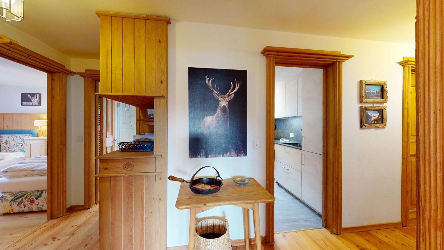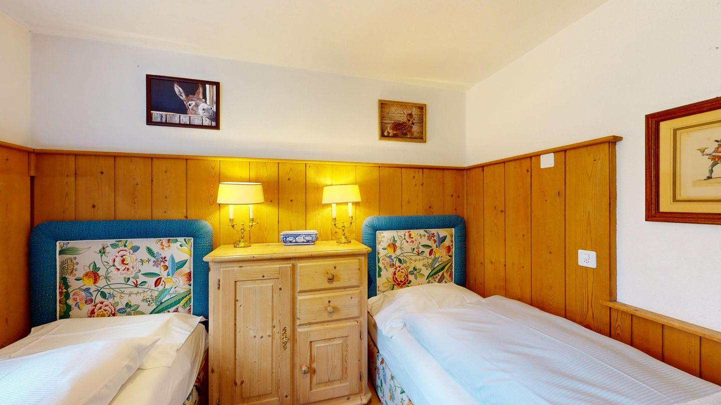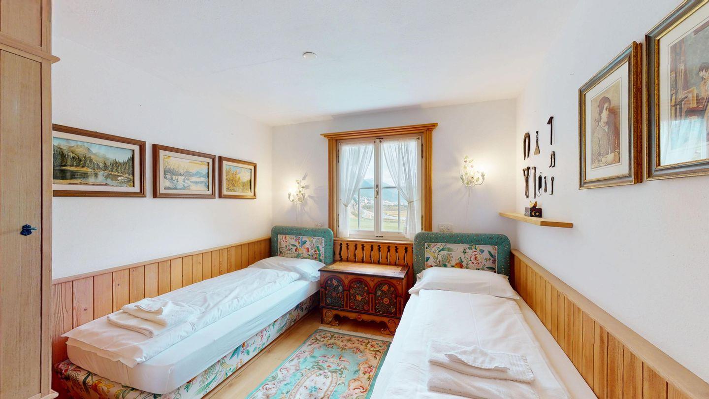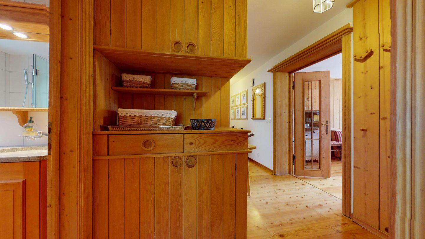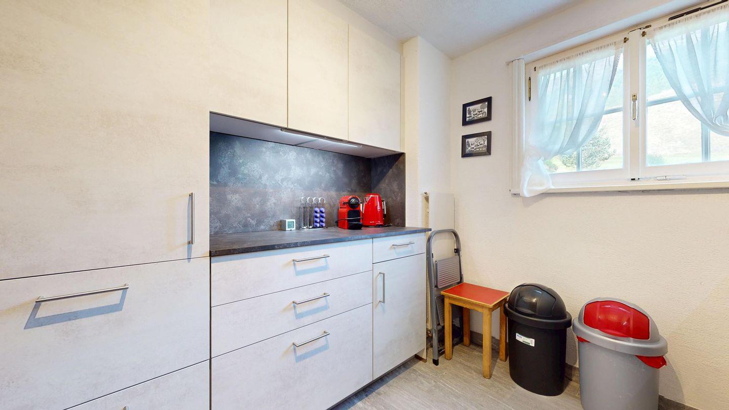 6-Zimmerwohnung im Erdgeschoss. Entree mit Garderobe. Wohn-/ Esszimmer mit Terrasse und Bergsicht, separate Küche mit Backofen, Kühlschrank, Chicco d'Oro Kaffeemaschine und Geschirrspülmaschine. Zwei Schlafzimmer mit je einem Doppelbett. Zwei Zimmer mit je zwei Einzelbetten. Ein Zimmer mit zwei Kinderbetten. Drei Badezimmer mit Badewanne/WC/Lavabo. TV und Internet. Holzböden im Schlaf- und Wohnzimmer. Garagenbox für ein Fahrzeug. Garage für ein Fahrzeug. Aussenparkplatz vor der Box. Ski und Skischuhe können im Skiraum oder in der Garage deponiert werden. Nichtraucherwohnung. Haustiere sind nicht erlaubt.