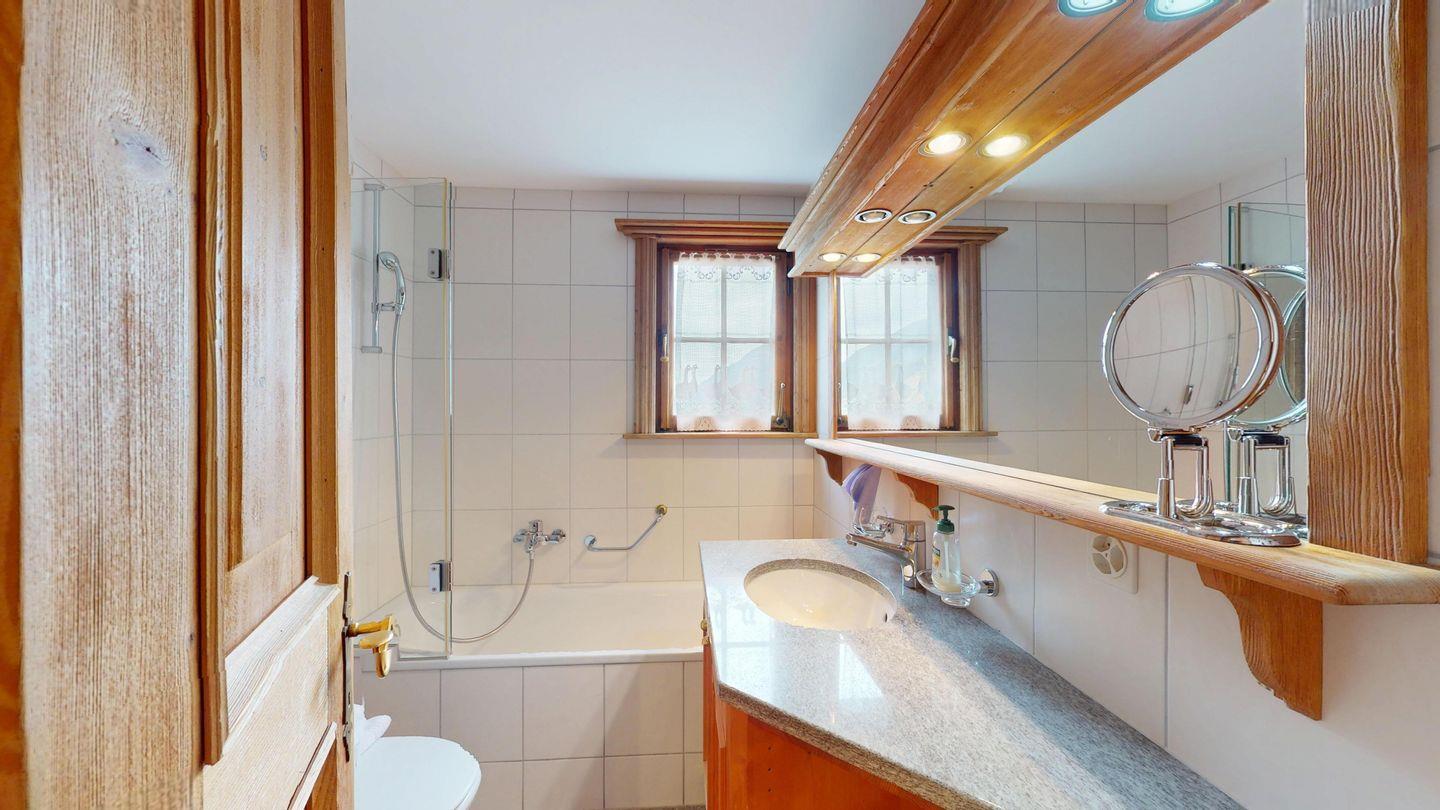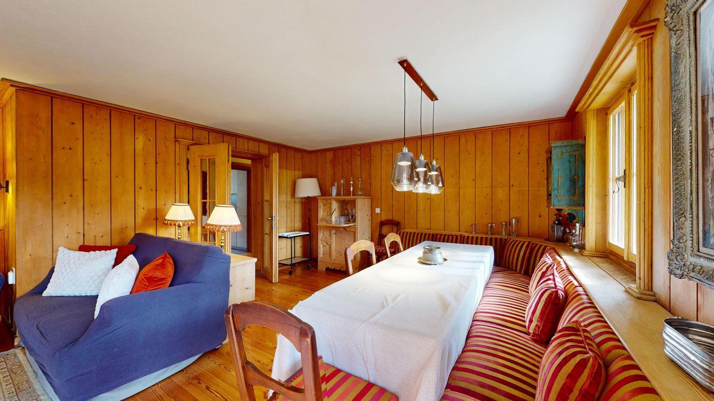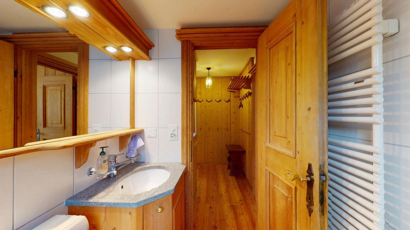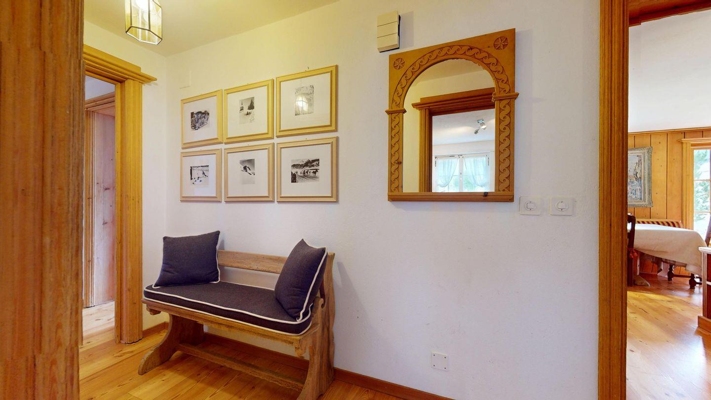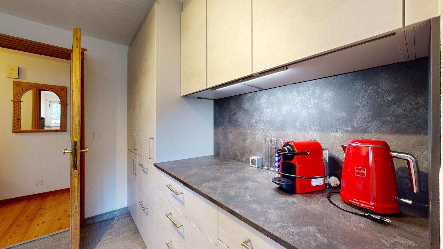 6-Zimmerwohnung im Erdgeschoss. Entree mit Garderobe. Wohn-/ Esszimmer mit Terrasse und Bergsicht, separate Küche mit Backofen, Kühlschrank, Chicco d'Oro Kaffeemaschine und Geschirrspülmaschine. Zwei Schlafzimmer mit je einem Doppelbett. Zwei Zimmer mit je zwei Einzelbetten. Ein Zimmer mit zwei Kinderbetten. Drei Badezimmer mit Badewanne/WC/Lavabo. TV und Internet. Holzböden im Schlaf- und Wohnzimmer. Garagenbox für ein Fahrzeug. Garage für ein Fahrzeug. Aussenparkplatz vor der Box. Ski und Skischuhe können im Skiraum oder in der Garage deponiert werden. Nichtraucherwohnung. Haustiere sind nicht erlaubt.