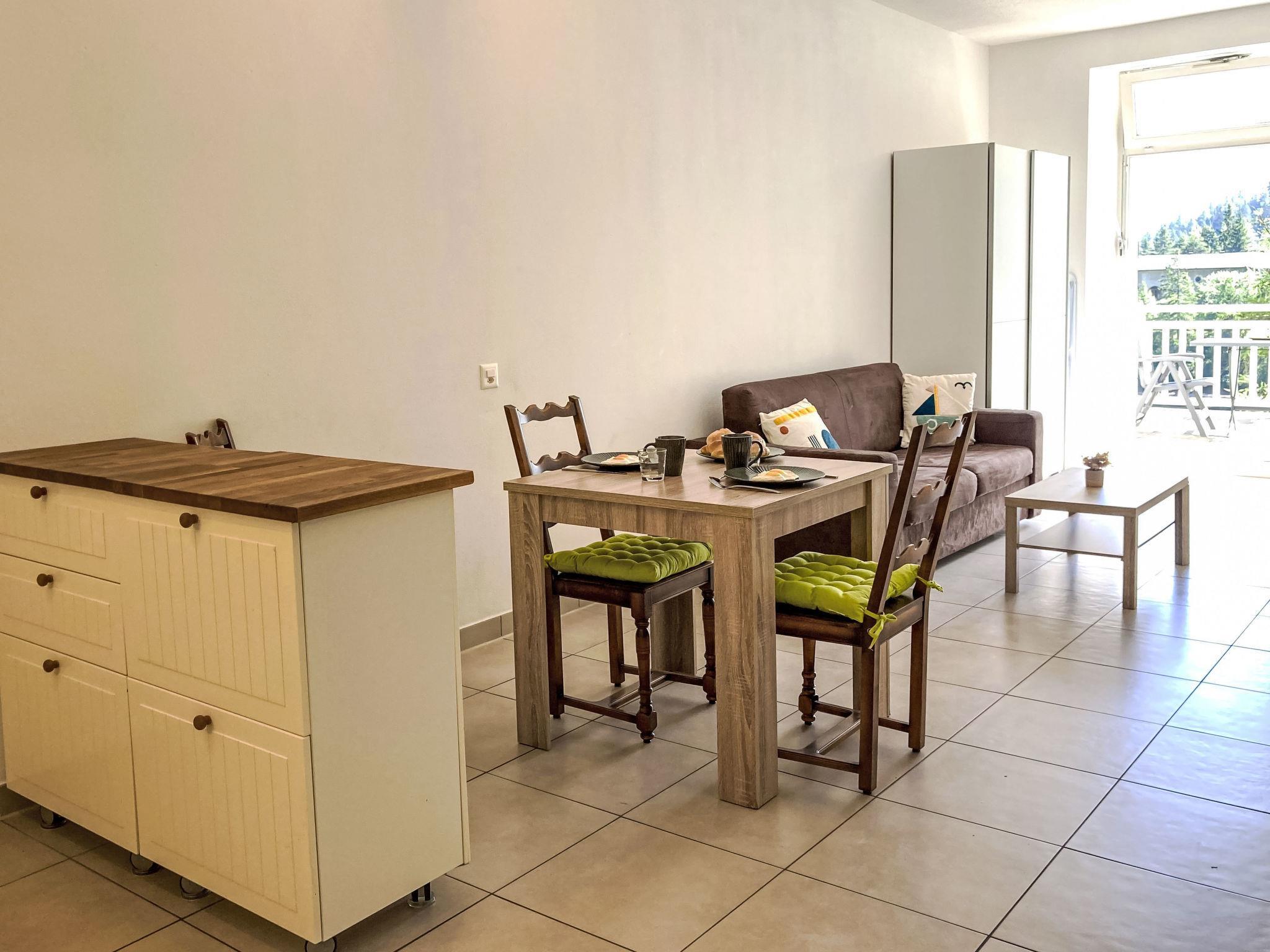 "Alpes et Lac 14", 1-room studio 35 m2 on 1st floor. Practical and comfortable furnishings: large living/dining room with 1 sofabed (160 cm, length 200 cm), cable TV. Exit to the terrace. Kitchenette (oven, 4 ceramic glass hob hotplates, electric coffee machine, raclette grill, fondue Set (cheese)) with open-hearth fireplace. Bath/WC. Very beautiful view of the lake. Facilities: hair dryer. Internet (WiFi, free). Parking (1 car). Please note: non-smokers only.