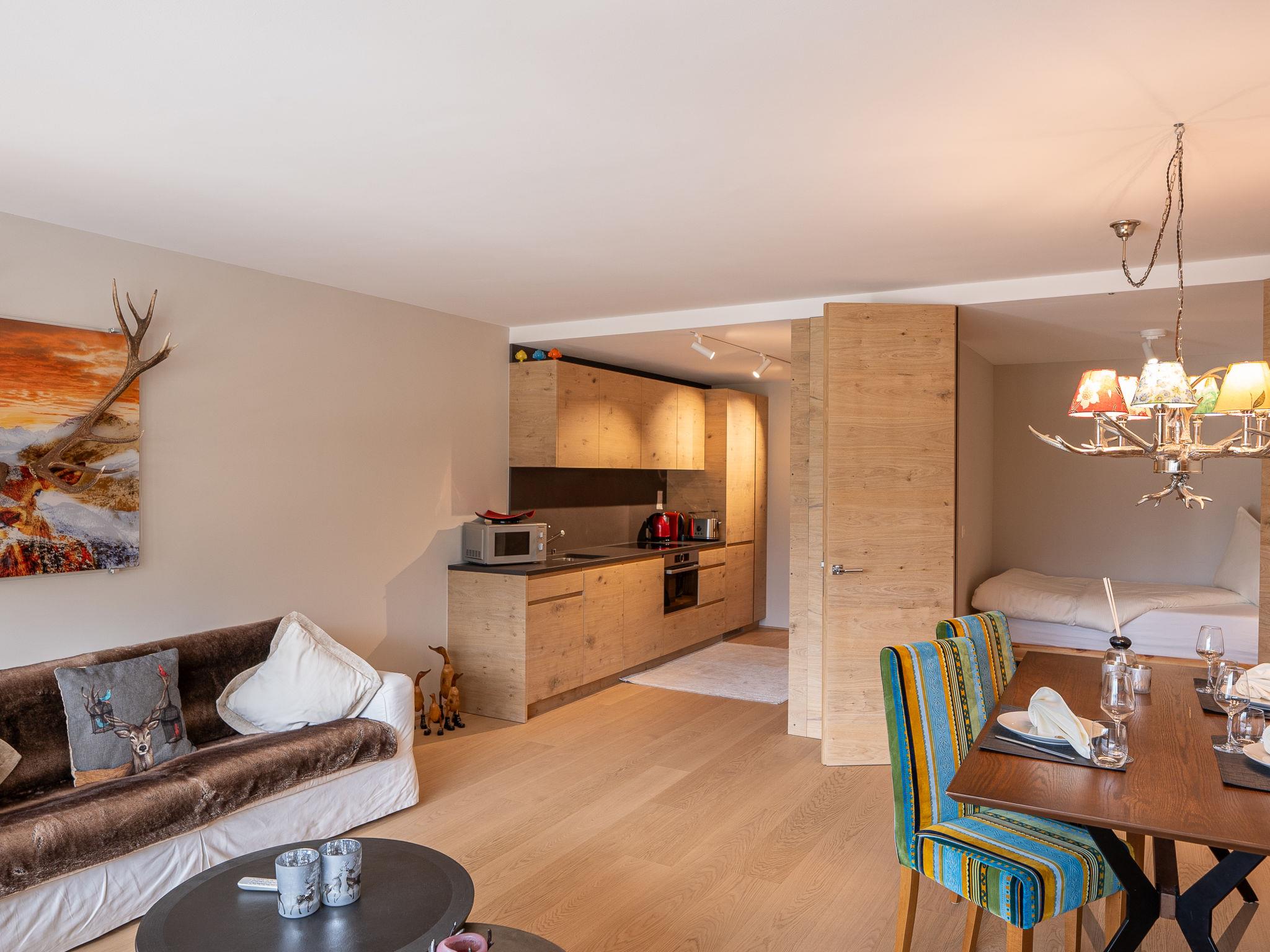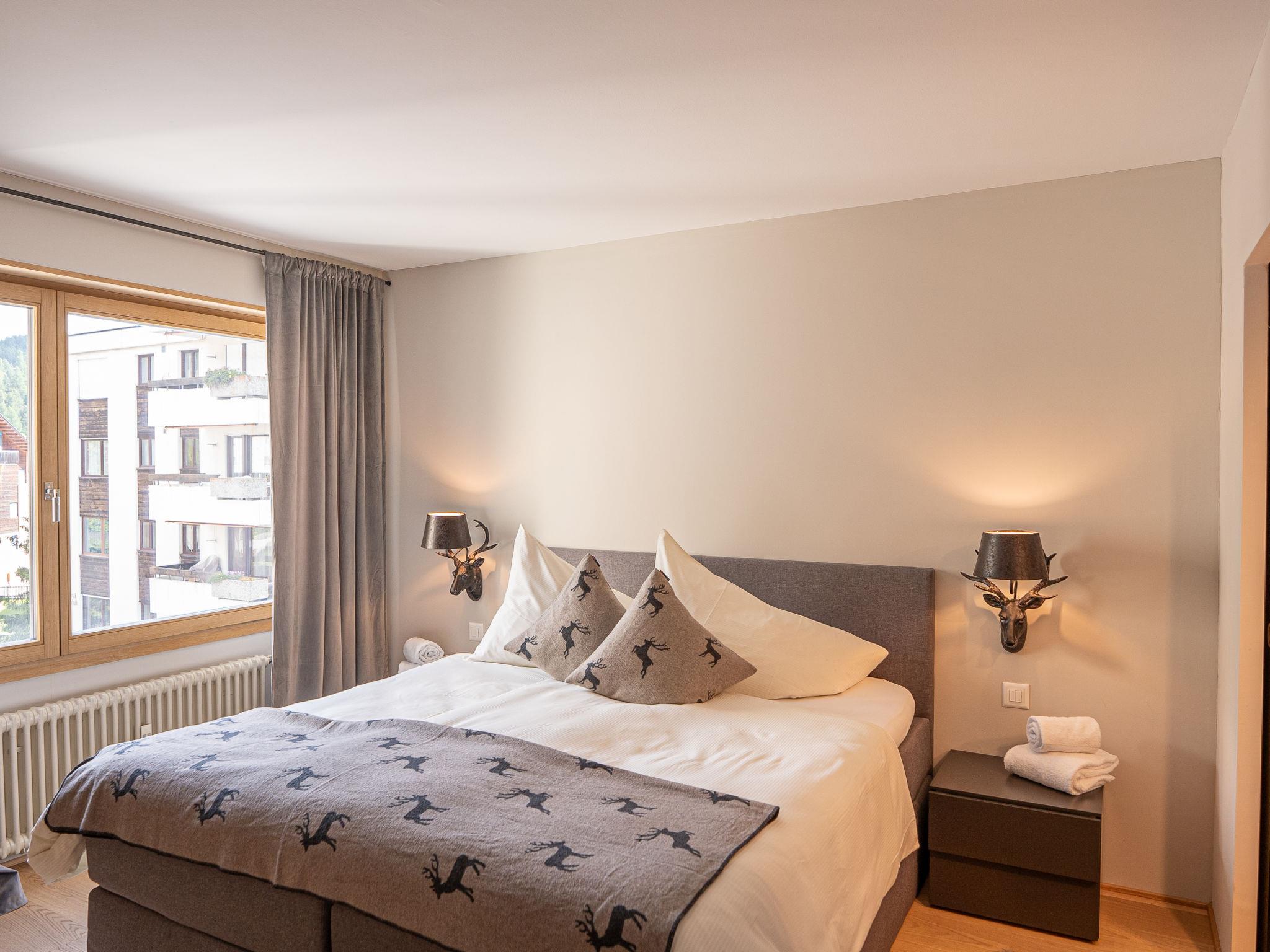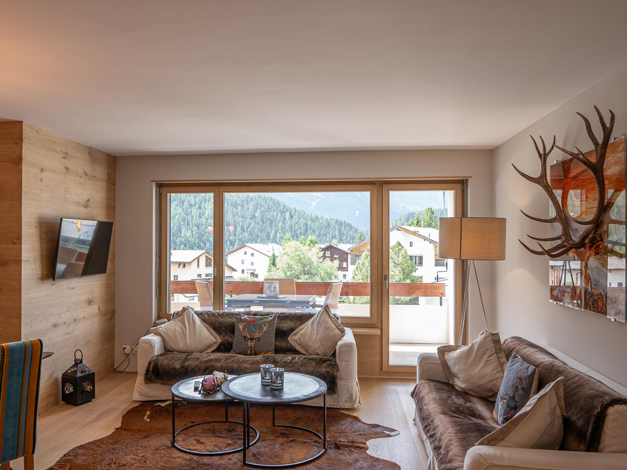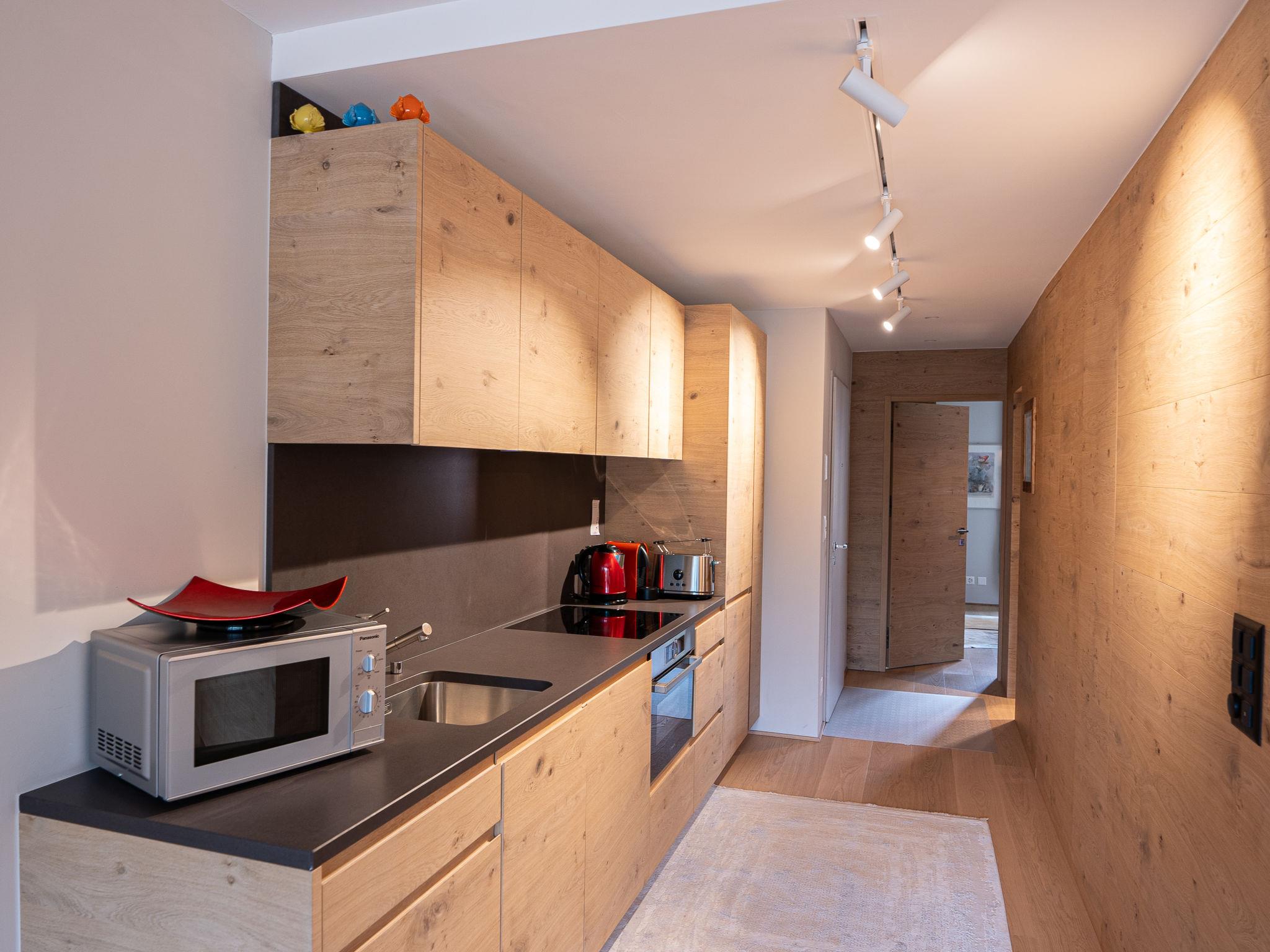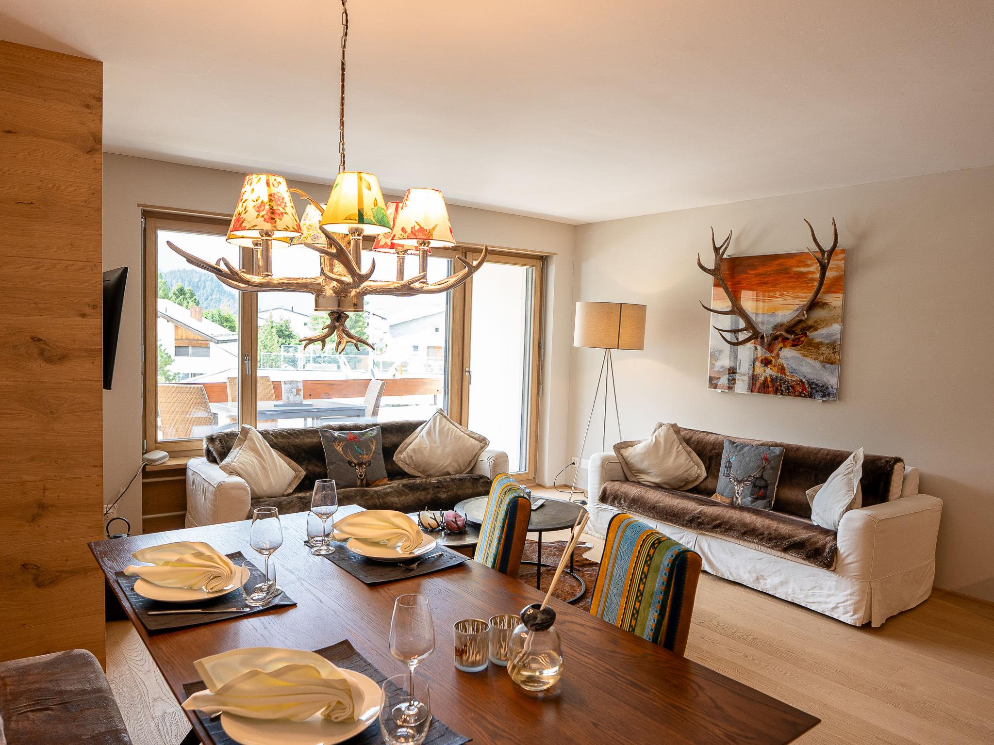 "Chesa Holiday Park - 13", 3-room apartment 70 m2 on 2nd floor. Spacious and bright, fully renovated in 2020, tasteful and cosy furnishings: living/dining room with panoramic window with TV (flat screen). Exit to the loggia. 1 double bedroom with 1 double bed (1 x 180 cm, length 200 cm), bath/WC. 1 small room, without window with 1 bed (90 cm, length 200 cm). Open kitchen (oven, dishwasher, 4 ceramic glass hob hotplates, toaster, kettle, microwave, freezer, electric coffee machine, Capsules for coffee machine (Nespresso) extra, steamer, raclette grill, fondue Set (chinoise, cheese)). Shower/WC. Heating. Wooden floors. Balcony furniture. Beautiful view of the mountains and the resort. Facilities: iron, hair dryer. Internet (WiFi, free). Garage space n 32 on the property (1 car), height 205 cm, width 225 cm. Please note: not suitable for small children. Non-smokers only, non-smoking house.