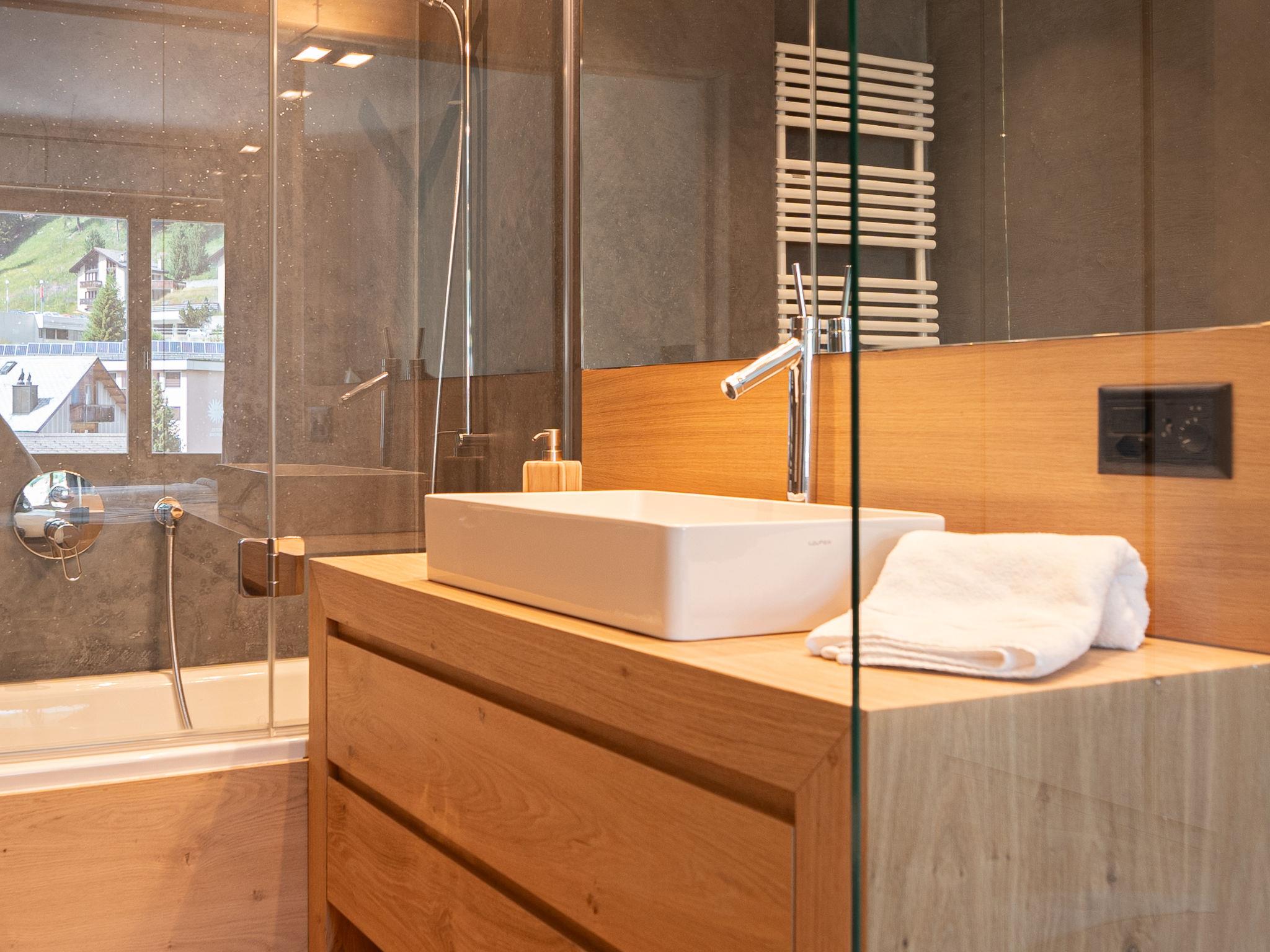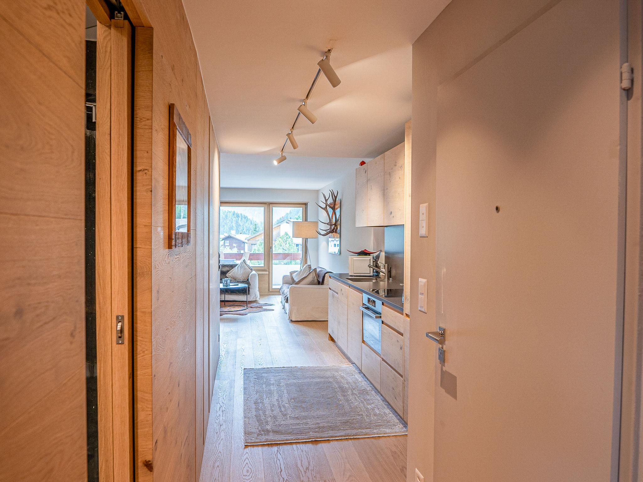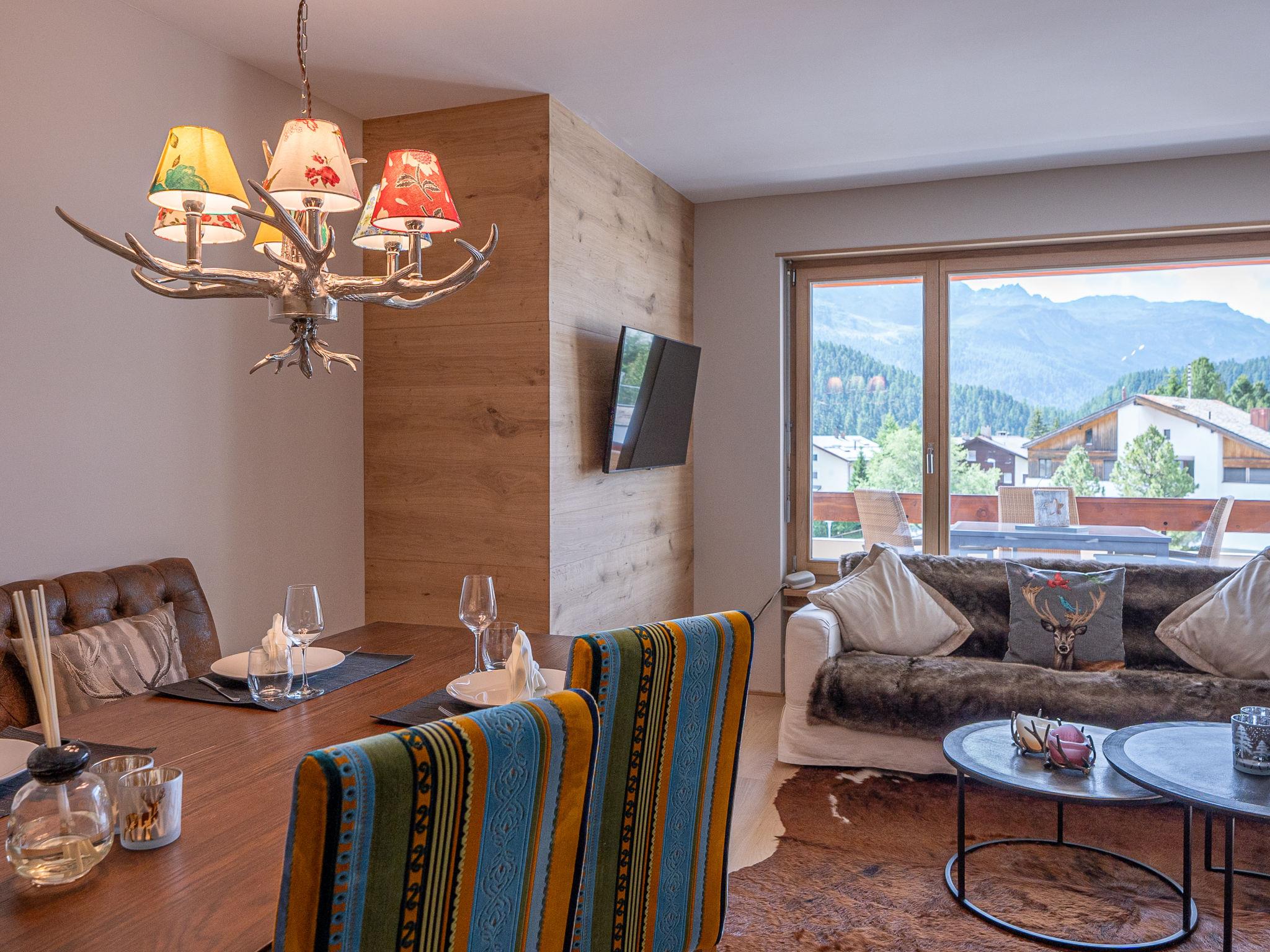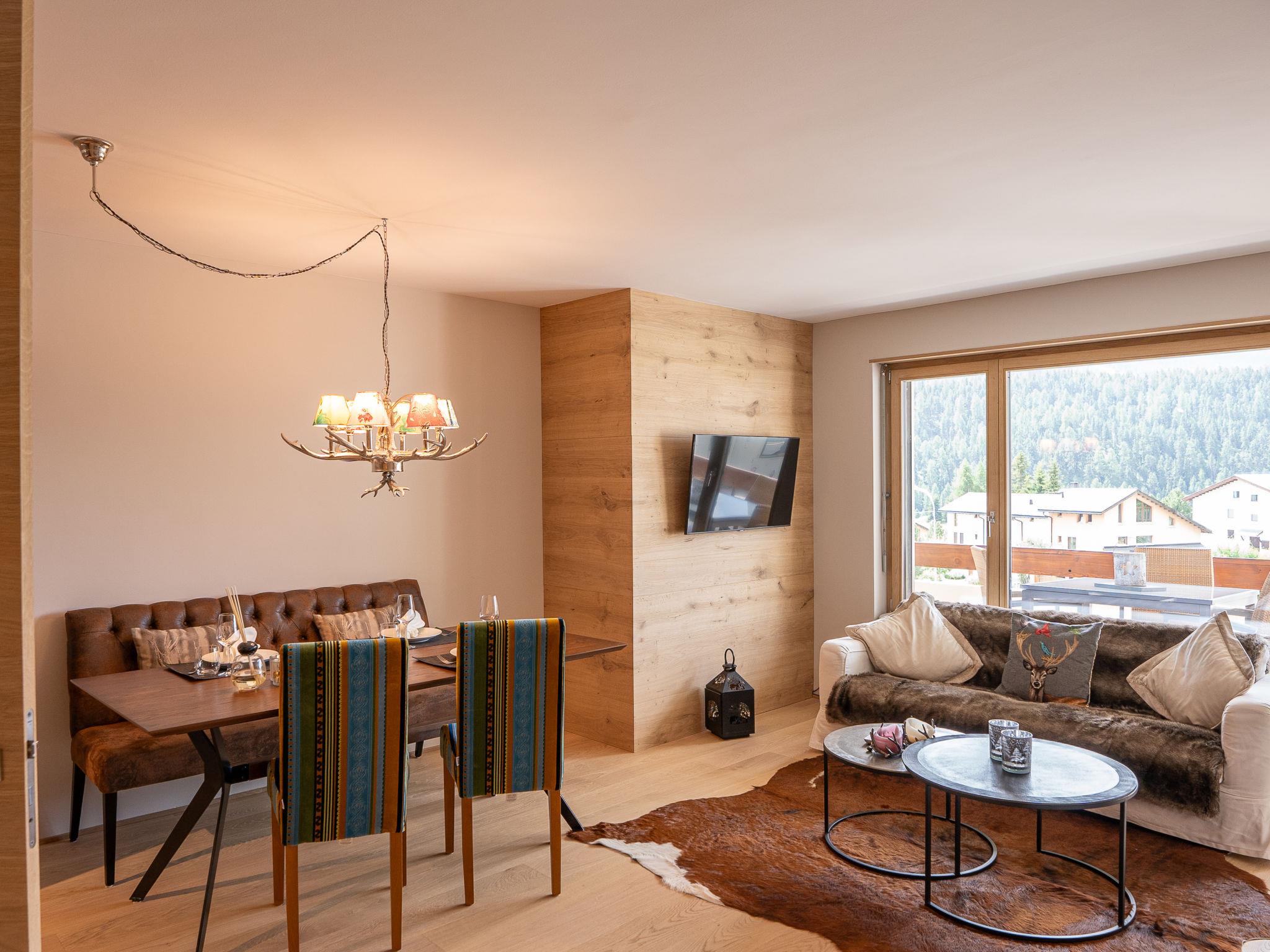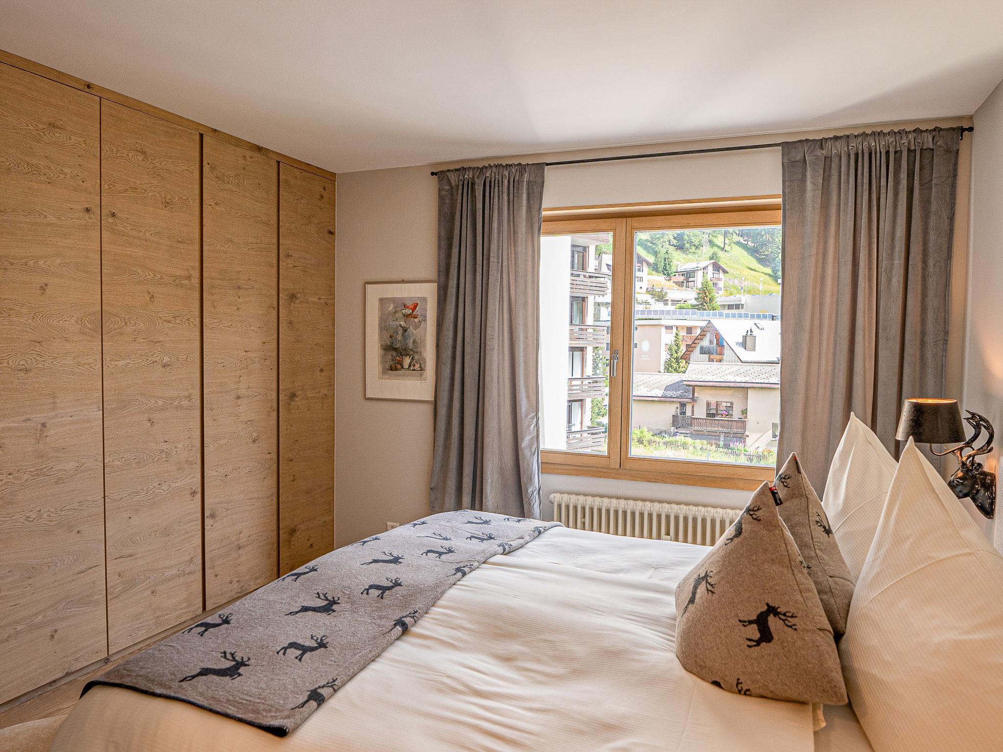 "Chesa Holiday Park - 13", 3-room apartment 70 m2 on 2nd floor. Spacious and bright, fully renovated in 2020, tasteful and cosy furnishings: living/dining room with panoramic window with TV (flat screen). Exit to the loggia. 1 double bedroom with 1 double bed (1 x 180 cm, length 200 cm), bath/WC. 1 small room, without window with 1 bed (90 cm, length 200 cm). Open kitchen (oven, dishwasher, 4 ceramic glass hob hotplates, toaster, kettle, microwave, freezer, electric coffee machine, Capsules for coffee machine (Nespresso) extra, steamer, raclette grill, fondue Set (chinoise, cheese)). Shower/WC. Heating. Wooden floors. Balcony furniture. Beautiful view of the mountains and the resort. Facilities: iron, hair dryer. Internet (WiFi, free). Garage space n 32 on the property (1 car), height 205 cm, width 225 cm. Please note: not suitable for small children. Non-smokers only, non-smoking house.