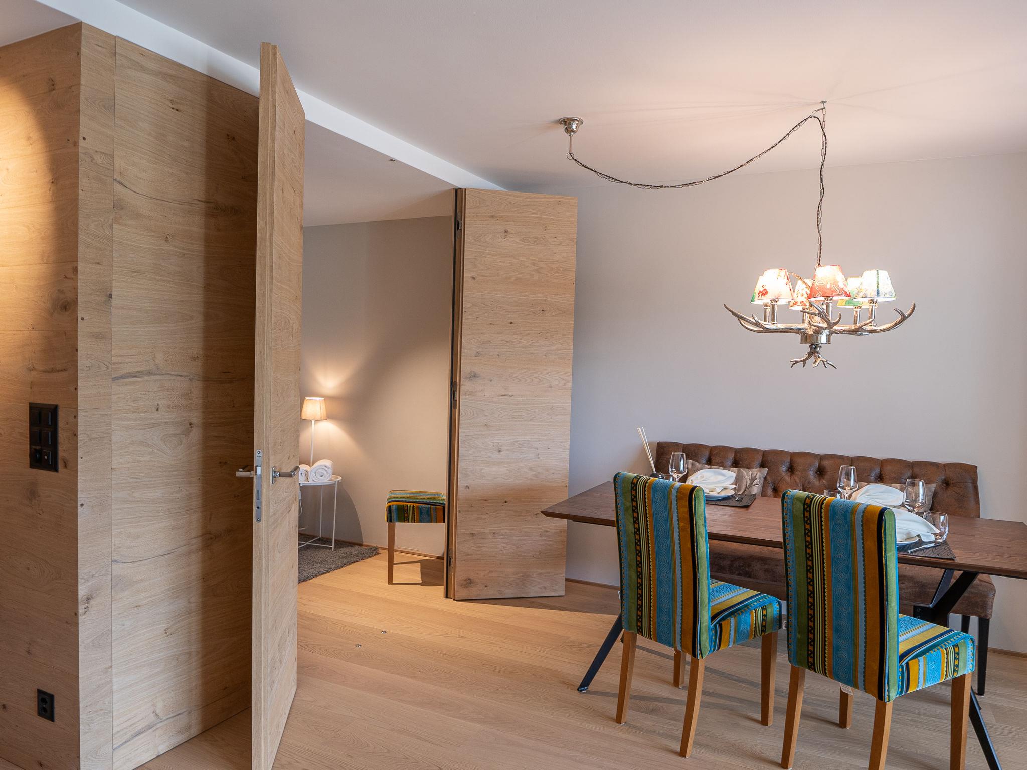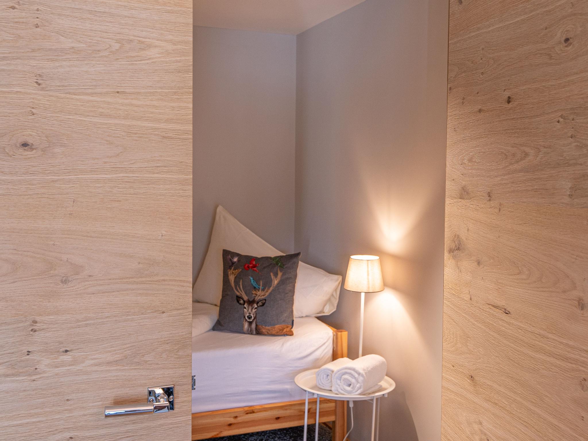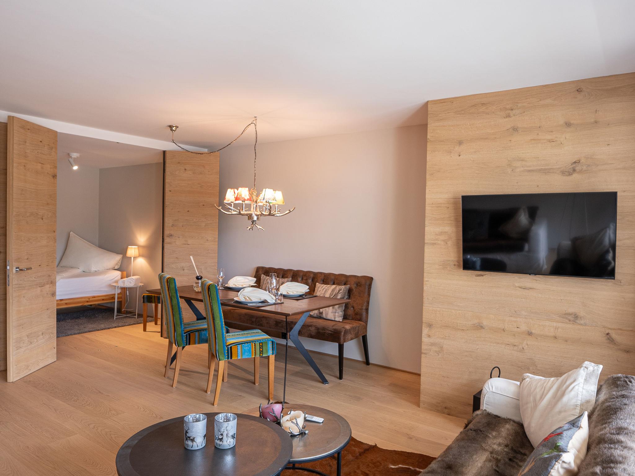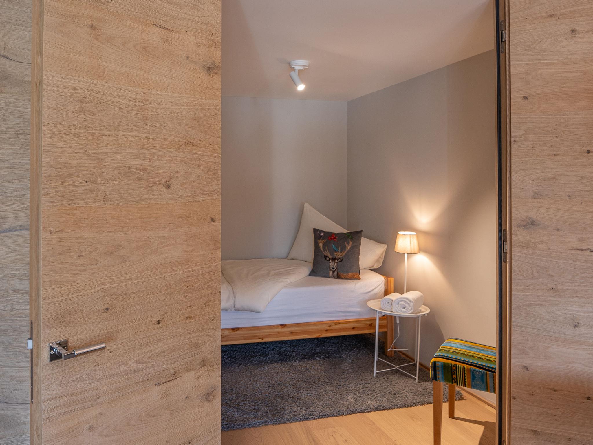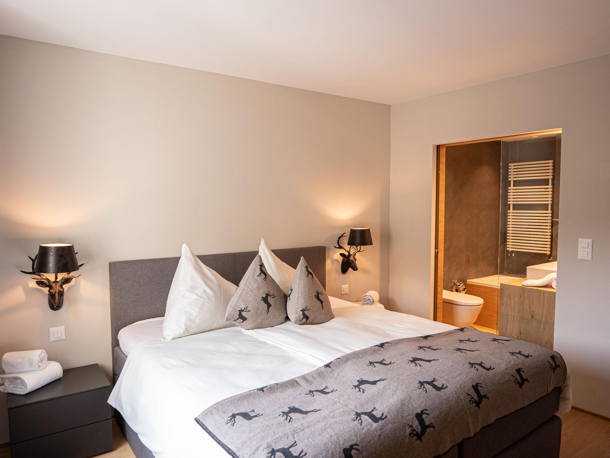 "Chesa Holiday Park - 13", 3-room apartment 70 m2 on 2nd floor. Spacious and bright, fully renovated in 2020, tasteful and cosy furnishings: living/dining room with panoramic window with TV (flat screen). Exit to the loggia. 1 double bedroom with 1 double bed (1 x 180 cm, length 200 cm), bath/WC. 1 small room, without window with 1 bed (90 cm, length 200 cm). Open kitchen (oven, dishwasher, 4 ceramic glass hob hotplates, toaster, kettle, microwave, freezer, electric coffee machine, Capsules for coffee machine (Nespresso) extra, steamer, raclette grill, fondue Set (chinoise, cheese)). Shower/WC. Heating. Wooden floors. Balcony furniture. Beautiful view of the mountains and the resort. Facilities: iron, hair dryer. Internet (WiFi, free). Garage space n 32 on the property (1 car), height 205 cm, width 225 cm. Please note: not suitable for small children. Non-smokers only, non-smoking house.