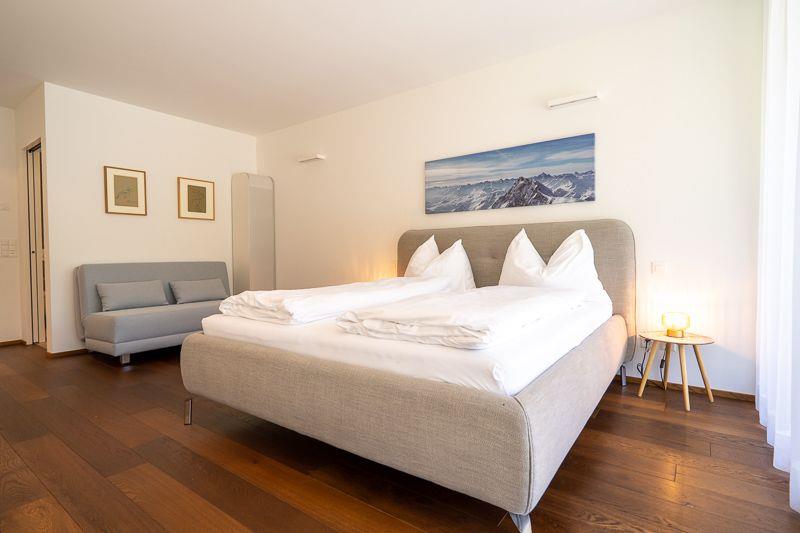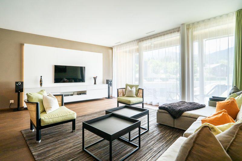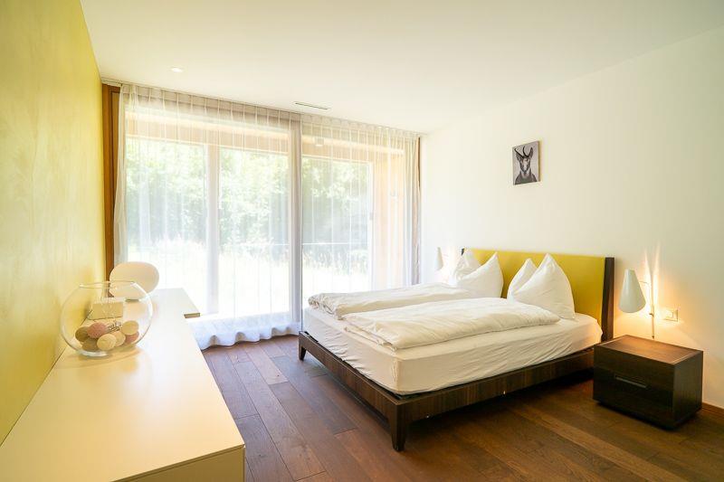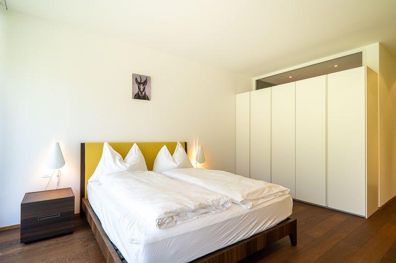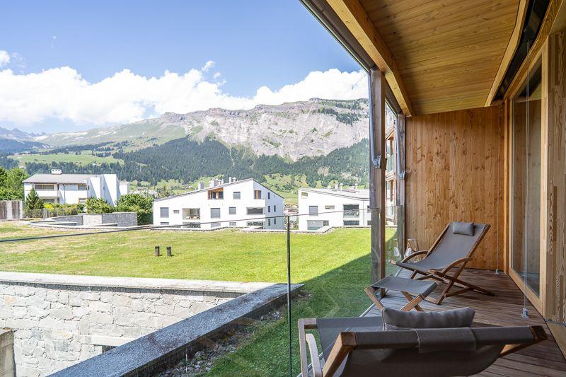 Luxuriöse 3.5-Zimmer-Wohnung (ca. 110?m²) für max. 5 Personen im 1. OG der exklusiven Residenz The Mountain Suites, nur 10 Gehminuten von der Talstation Flims entfernt. Die Wohnung bietet zwei Schlafzimmer: eines mit Doppelbett, eines mit Doppelbett und Schlafsofa. Beide verfügen über ein eigenes Bad (Badewanne oder Dusche) sowie ein separates Gäste-WC. Die Wohnfläche ist durchgehend mit Fussbodenheizung ausgestattet. Grosszügiger Wohn-/Essbereich mit freistehendem Kamin, grossem Esstisch und gemütlicher Couchgarnitur. Hochwertige Küche mit Induktionskochfeld, Backofen, Kühlschrank mit Gefrierfach, Geschirrspüler und Nespresso-Maschine.