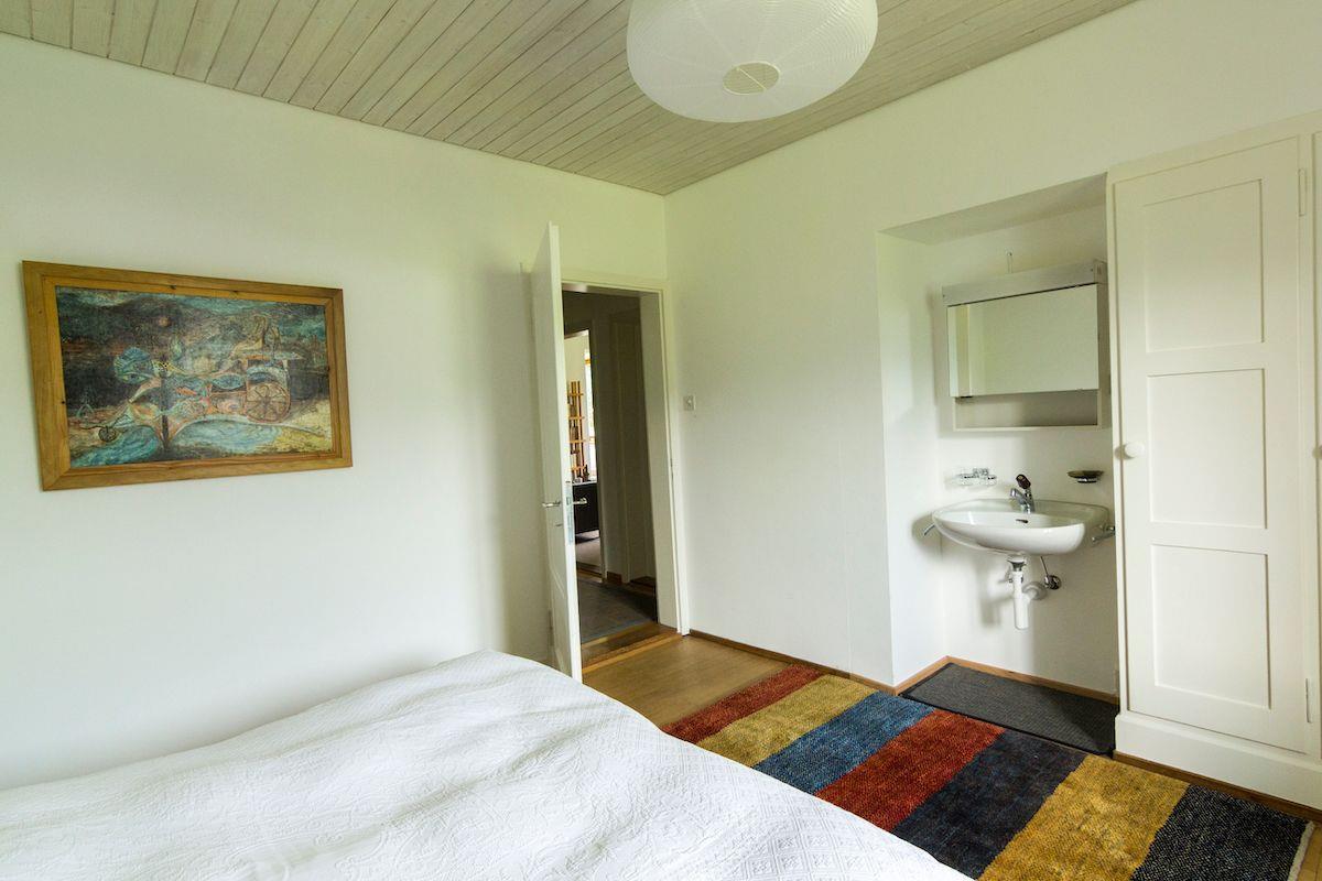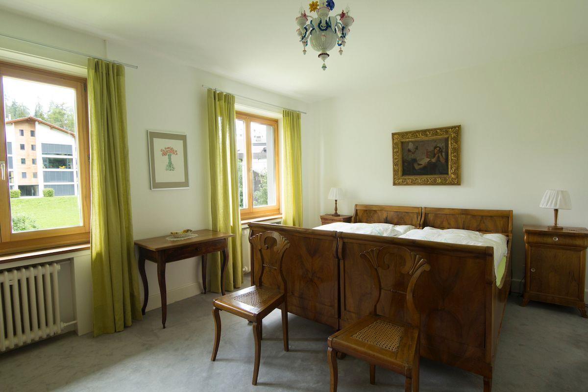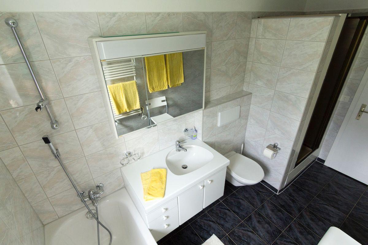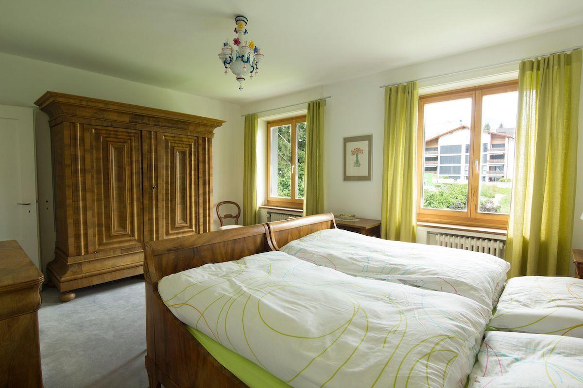Ein Schlafzimmer ist im Biedermeierstil ausgestattet mit Doppelbett (Speziallänge 2.10m) und Teppichboden. Das zweite Schlafzimmer ist mit einem Doppelbett ausgestattet, mit fliessend Wasser und Holzboden. Das Familienbadezimmer mit Tageslicht verfügt über Badewanne, Dusche, WC sowie Haartrockner. Küche mit Geschirrspüler, Herd und Backofen, Cafétiera, Käsefondueset, Mixer und vielen Küchenutensilien.