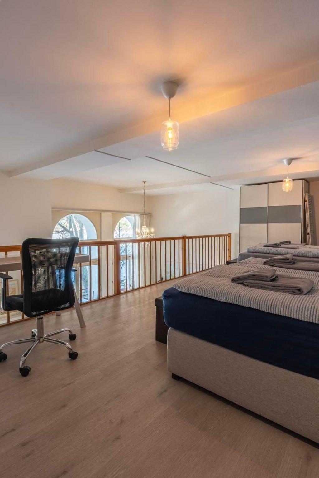 Inside, you will find a spacious living area with an open gallery of 28m² and two comfortable French beds. The tasteful furnishings and appealing room layout create a pleasant atmosphere in which up to four people can live comfortably. Practical amenities such as a kitchen equipped with a 3-ring hob, a coffee machine, an espresso pot and a kettle and a washing machine for communal use in the building make your stay both relaxing and uncomplicated.