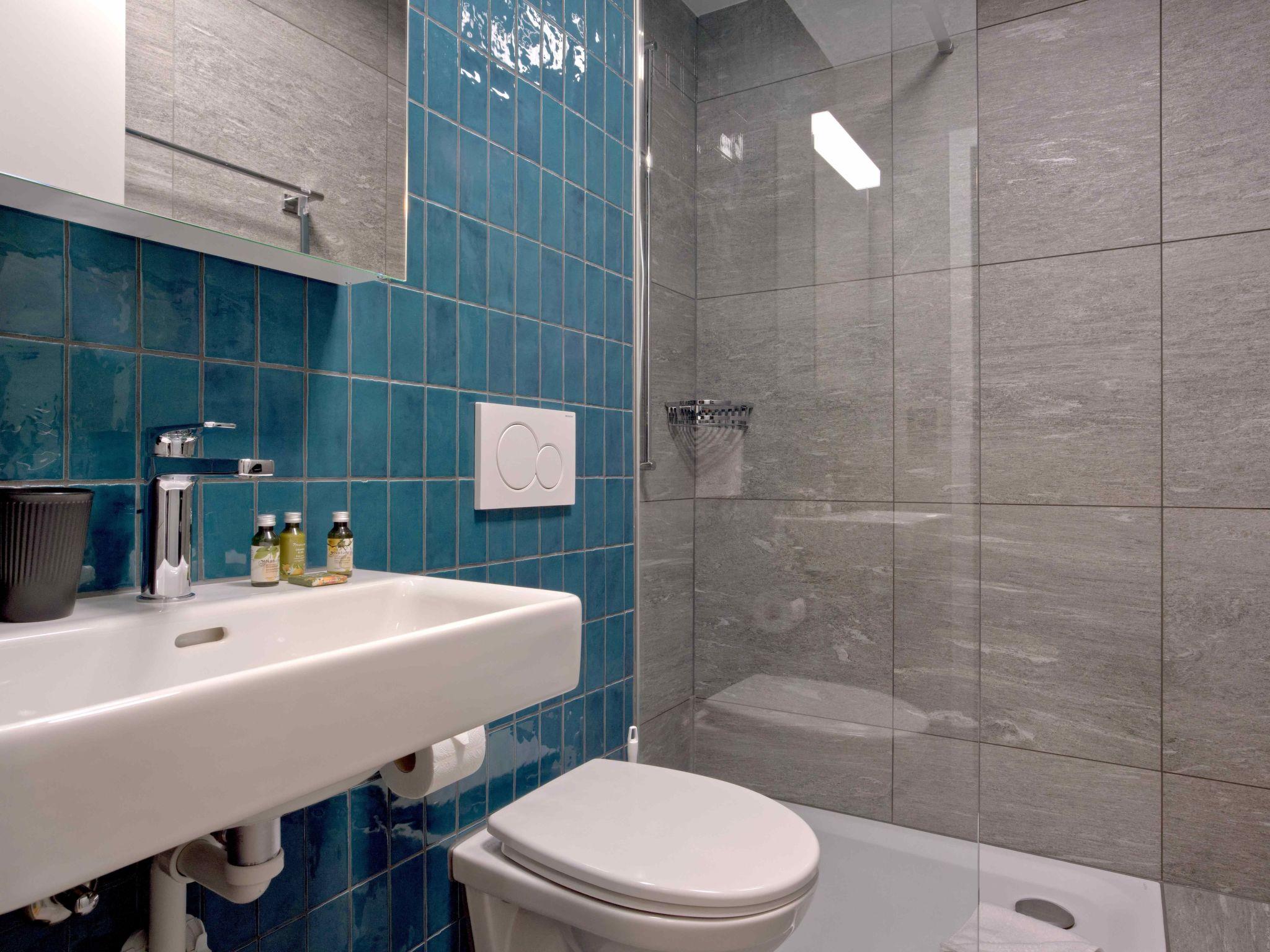 The bathroom is equipped with an elegant shower and WC. The modern tiles and high-quality furnishings give the room a pleasant atmosphere.