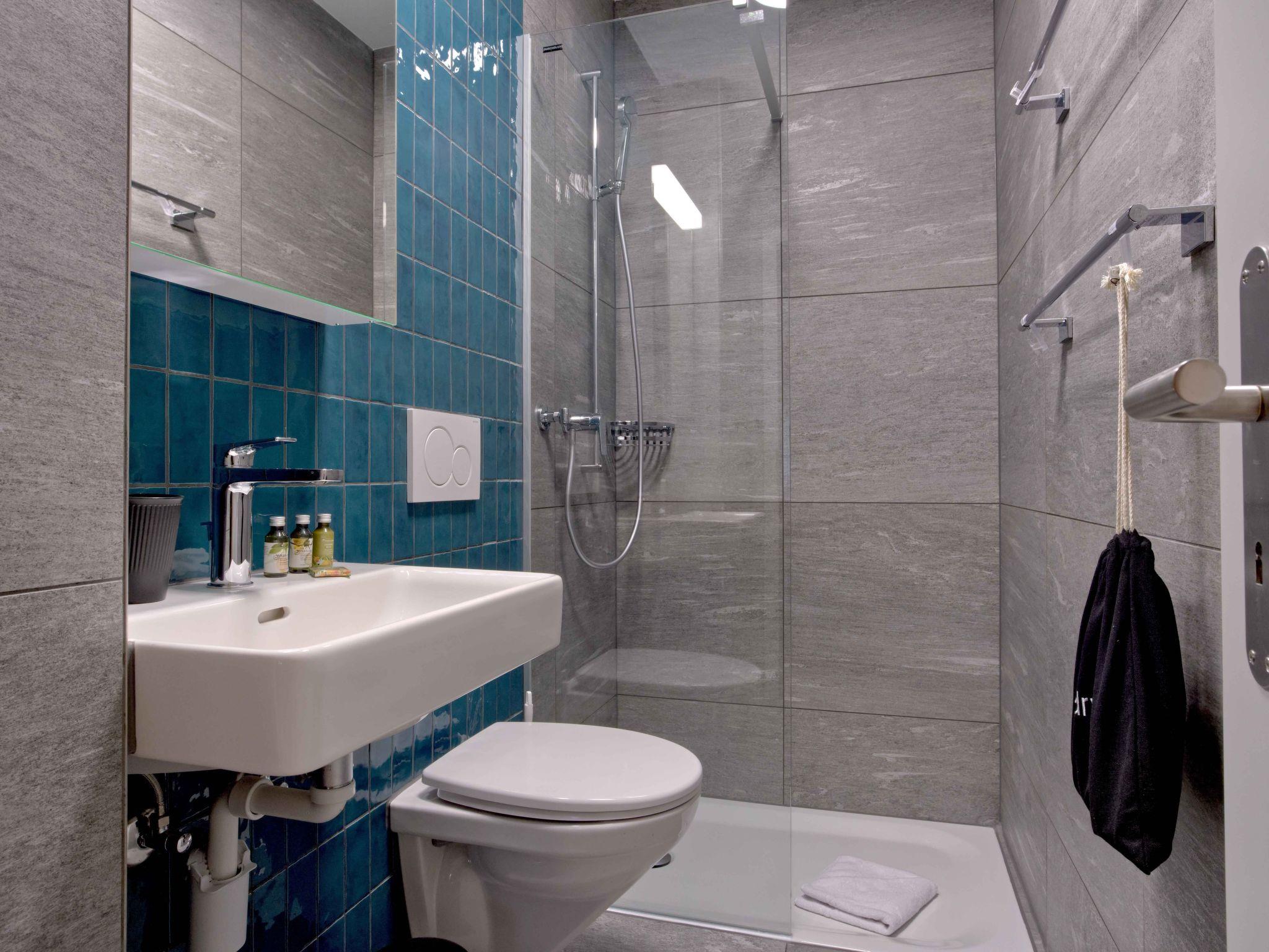 The bathroom is equipped with an elegant shower and WC. The modern tiles and high-quality furnishings give the room a pleasant atmosphere.