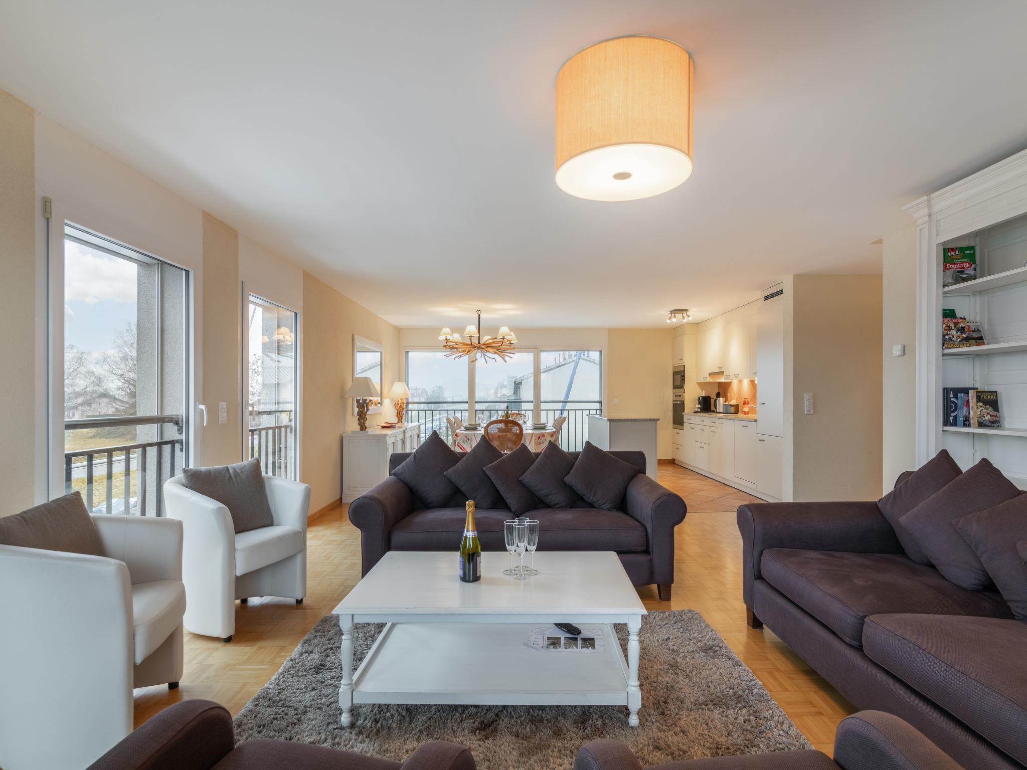 "Cook P1/2", 4-room apartment on 2nd floor. Object suitable for 6 adults + 2 children. Spacious and bright, beautiful and tasteful furnishings: open large living/dining room with panoramic window with dining table, cable TV and flat screen. Exit to the balcony. 1 room with 1 double bed (160 cm, length 200 cm), bath/WC. 1 room with 1 double bed (160 cm, length 200 cm). Exit to the balcony. 1 room with 1 bed (90 cm, length 190 cm), 1 x 2 bunk beds (90 cm, length 190 cm), 1 pull-out bed (1 pers. 2 x 90 cm, length 190 cm). Open kitchen (oven, dishwasher, 4 ceramic glass hob hotplates, toaster, kettle, microwave, freezer, electric coffee machine, Capsules for coffee machine (Nespresso) extra, fondue Set (cheese)) with bar. Shower/WC, sep. WC. Parquet floors. Balcony 7 m2. Balcony furniture, electric barbecue (portable), deck chairs (2). View of the mountains and the canal. Facilities: washing machine, dryer, children's high chair, baby cot for up to 3 year olds (extra), hair dryer. Internet (WiFi, free). Parking space n 189. Please note: suitable for families. Non-smokers only. CH49185
