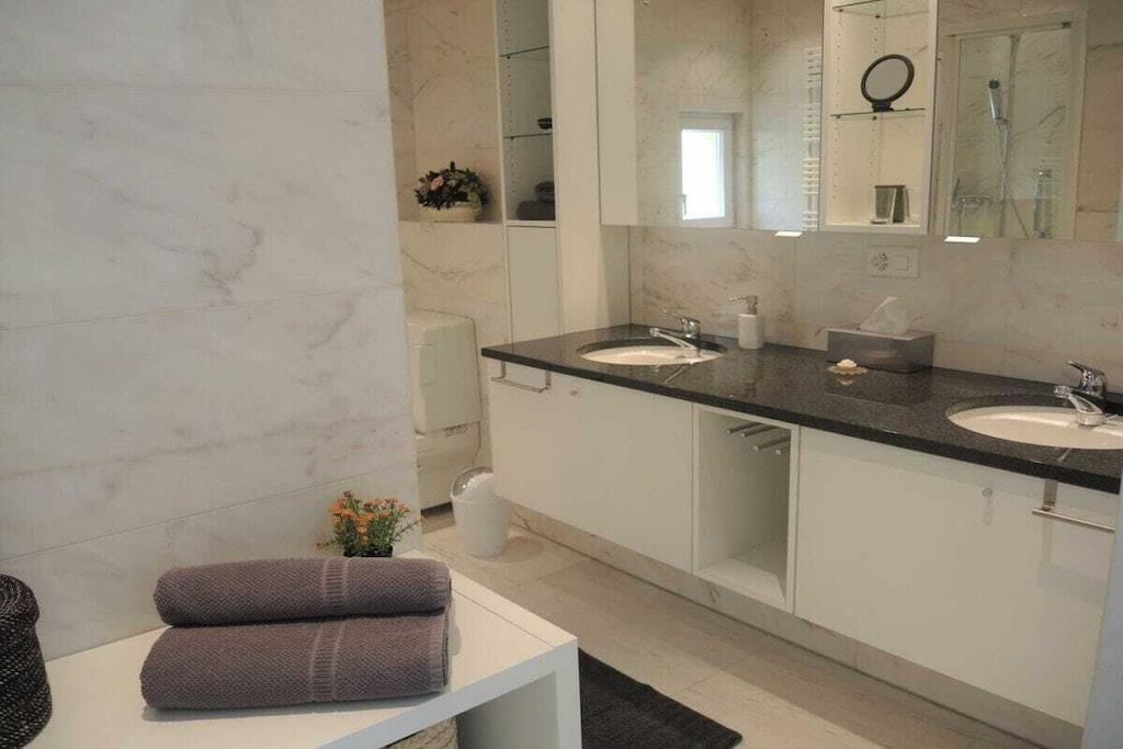 Hot Water, Sun Umbrella, Vacuum Cleaner, hallway(Wardrobe Coatrack), Living room(Armchair, double sofa bed, TV, radio, air conditioning), Kitchen(dining table, electric kettle, toaster, coffee machine, oven, dishwasher, fridge, freezer), bedroom(double bed), bathroom(shower, washbasin, hairdryer), Internet access, Internet access, balcony(garden furniture), heating, garden furniture, ironing board, iron