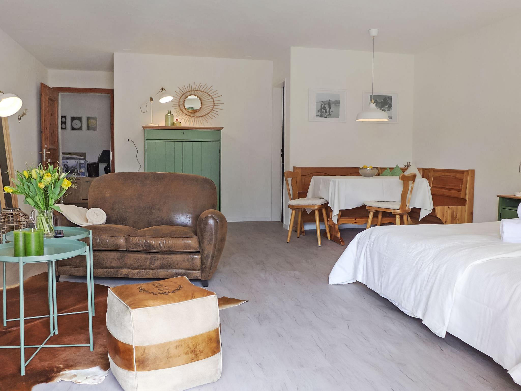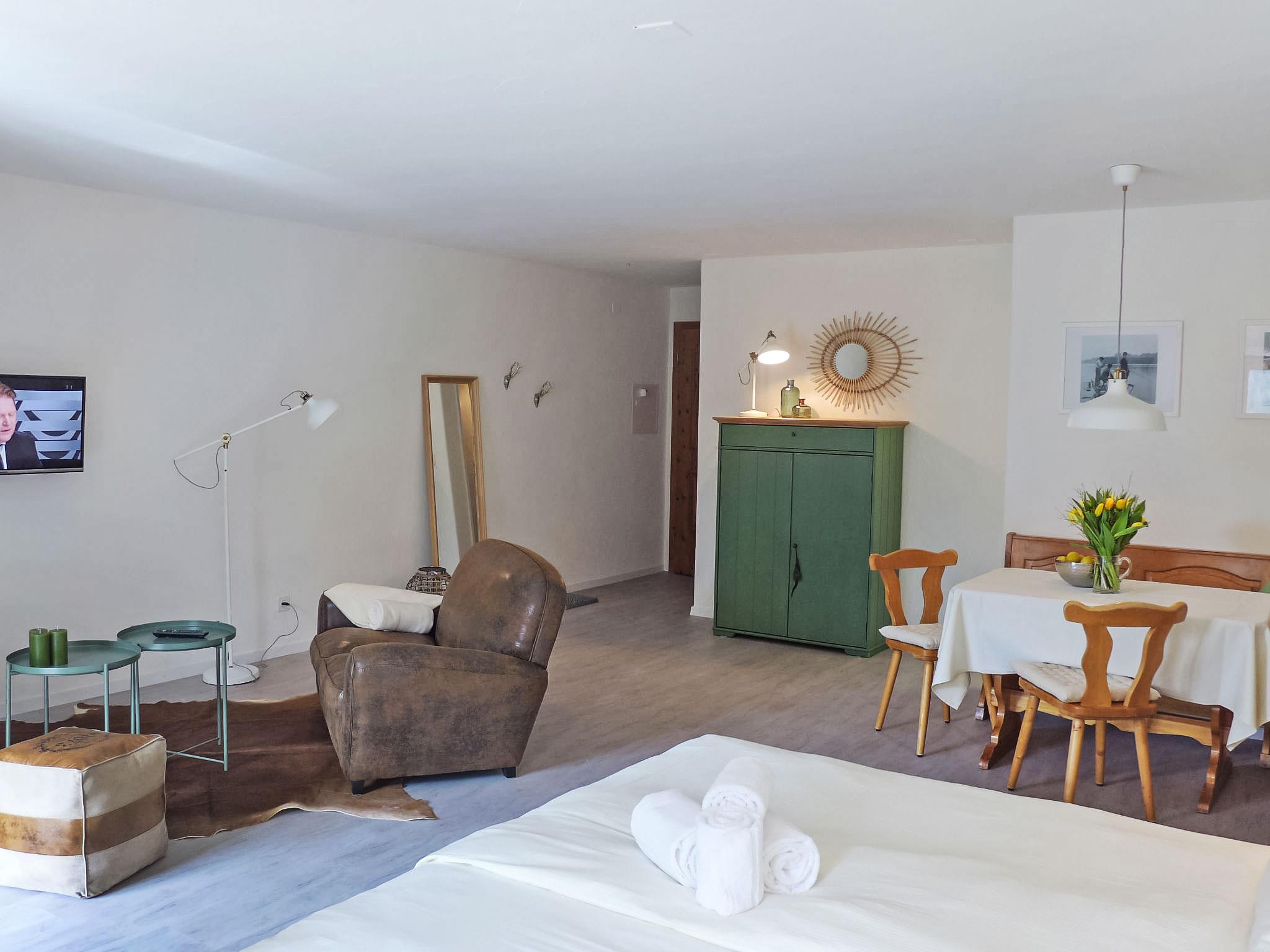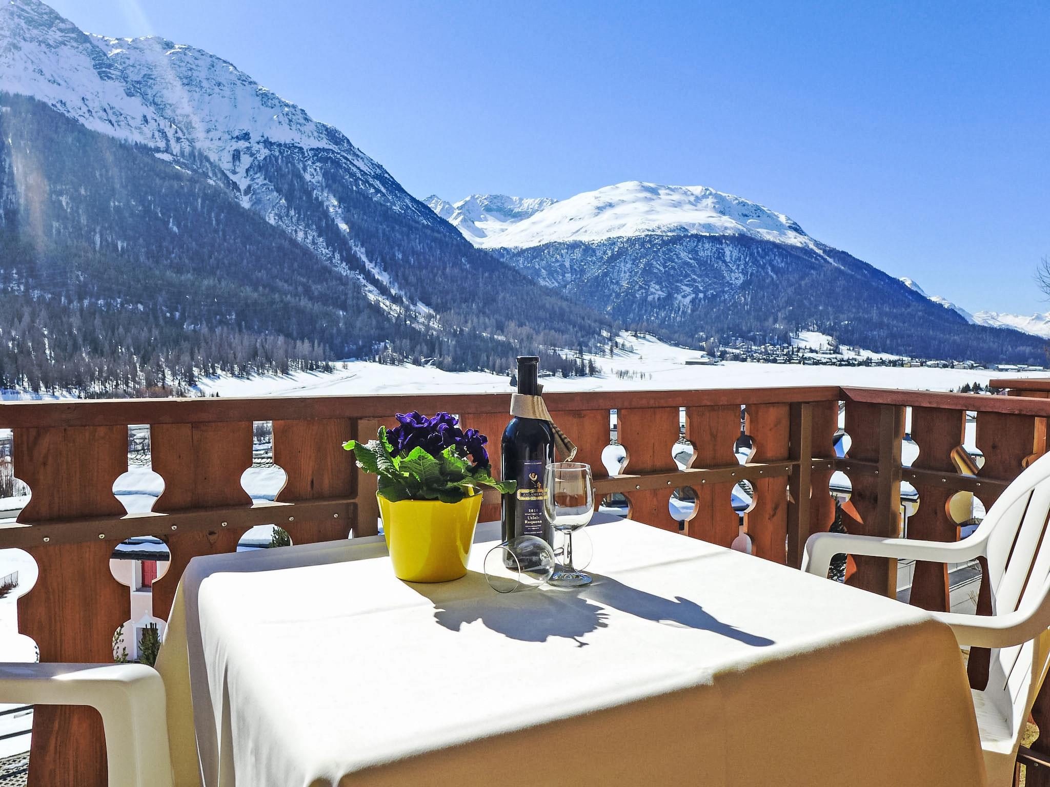 "Chesa Bursella 21", 1-room apartment 41 m2 on 1st floor. Spacious, partly renovated in 2017, cosy furnishings: open living/sleeping room with 1 double bed (2 x 90 cm, length 200 cm), dining nook and TV. Exit to the balcony, east facing position. Small kitchen (oven, dishwasher, 4 ceramic glass hob hotplates, toaster, kettle, electric coffee machine). Shower/WC. Heating. Balcony furniture (2). Very beautiful view of the mountains and the valley. Facilities: hair dryer. Internet (WiFi, free). Garage space n 21, height 195 cm, width 235 cm. Please note: maximum 1 pet/ dog allowed. No lift.