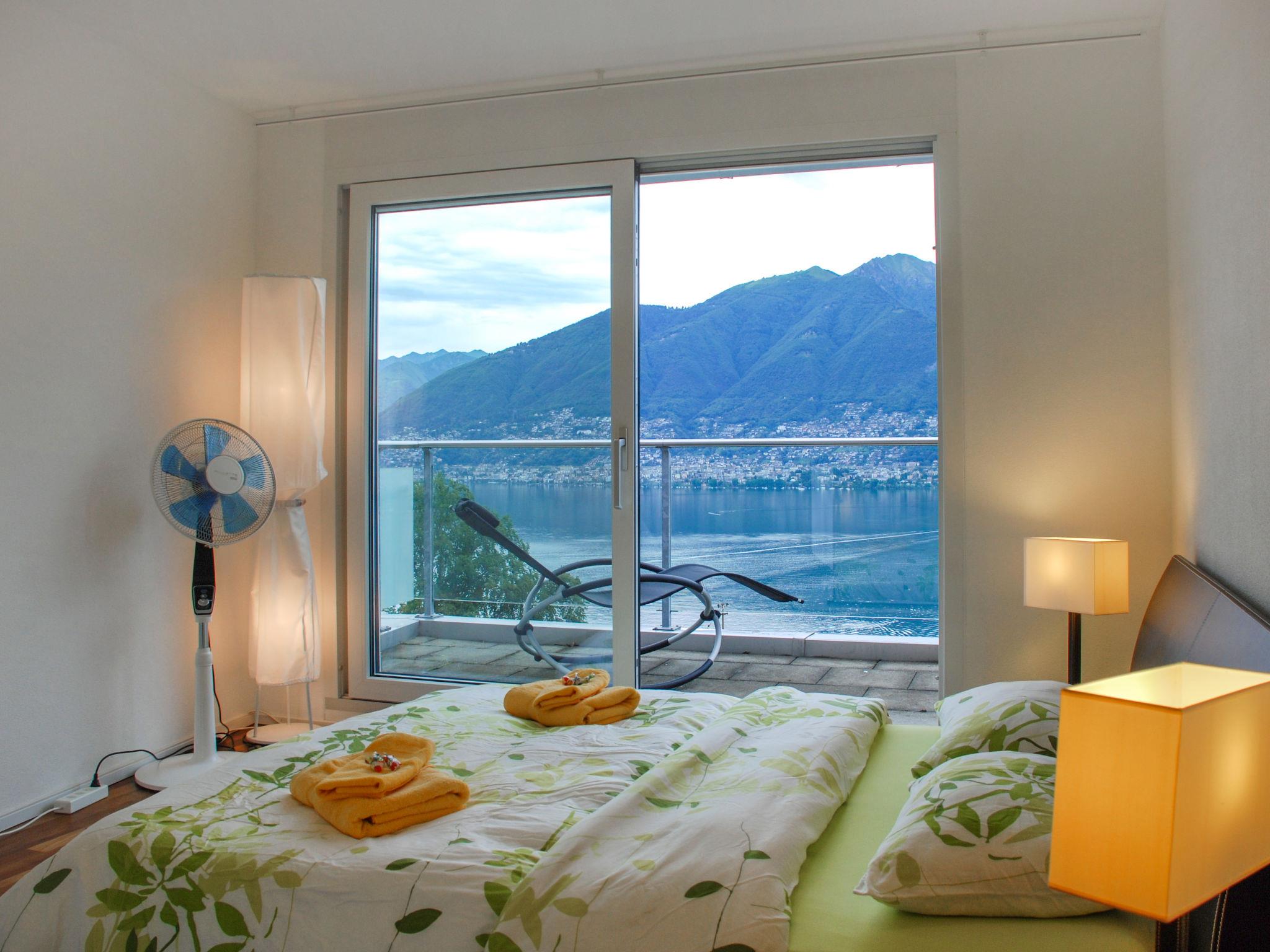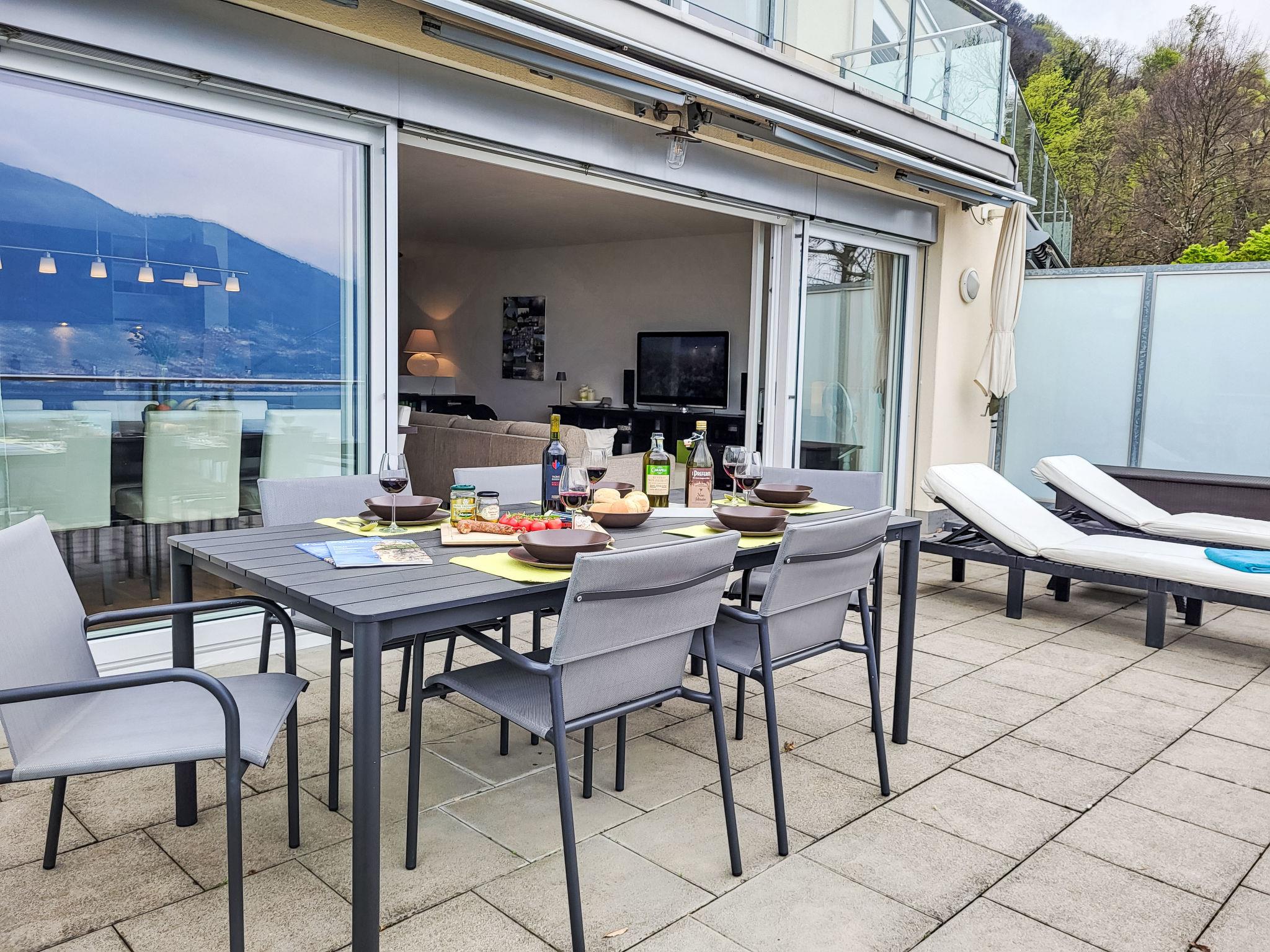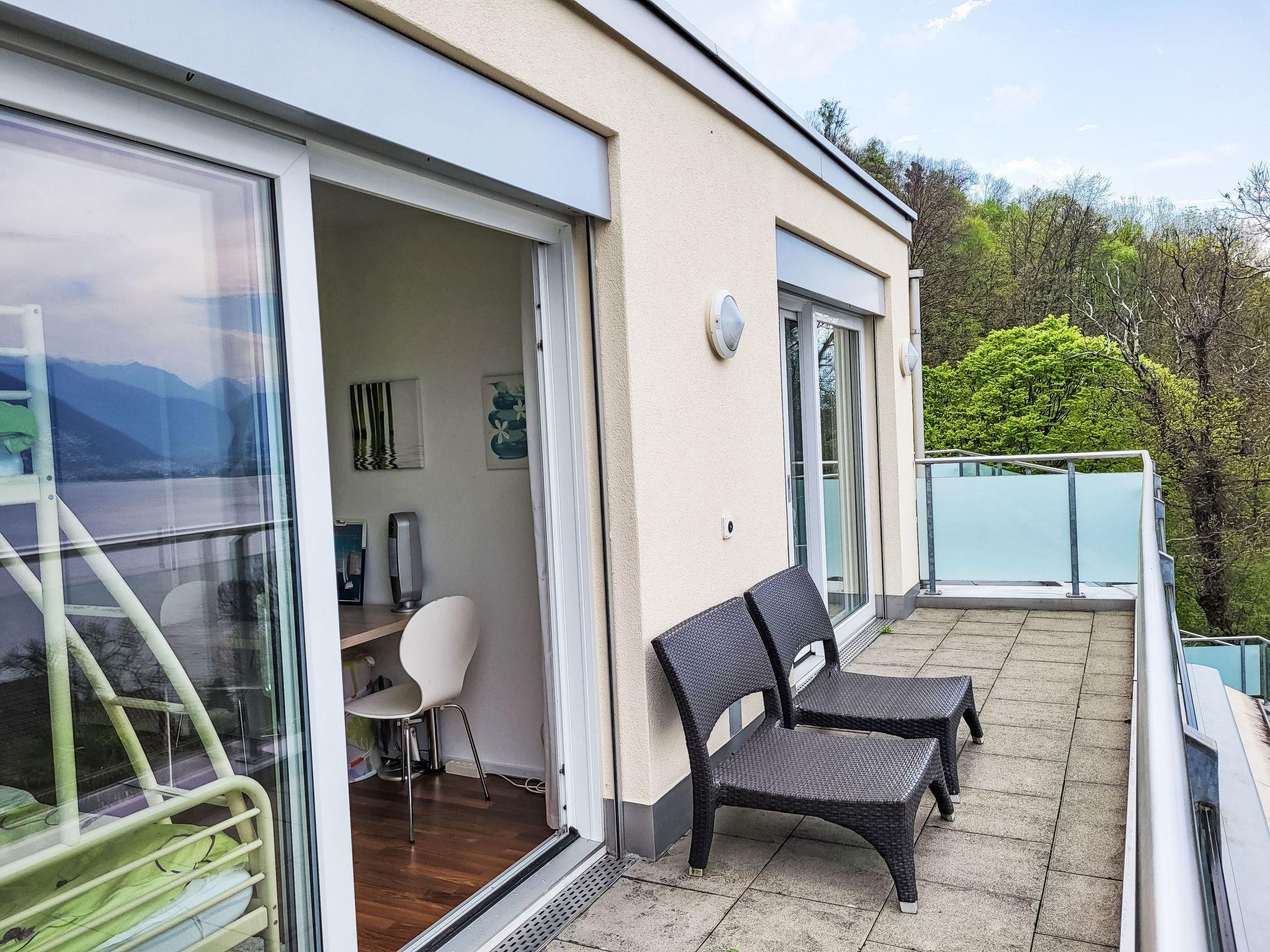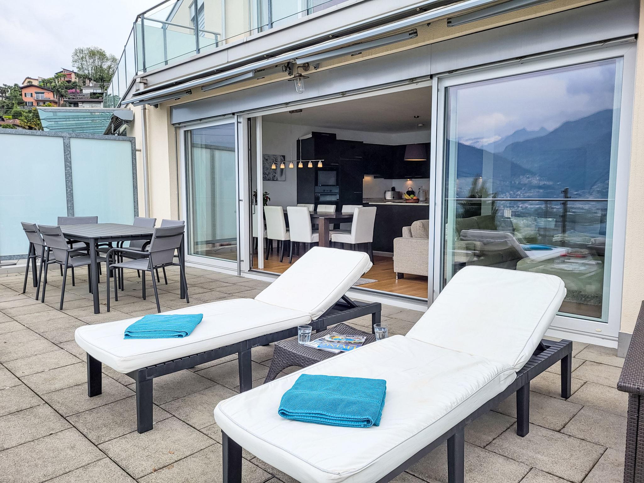"Splendid Maggiore View", 3-room maisonette 120 m2 on 2 levels, north-west facing position. Object suitable for 4 adults + 1 child. Spacious and bright, comfortable and modern furnishings: open large living/dining room with panoramic window with dining table, kitchen corner, TV, flat screen and DVD. Exit to the terrace. Open kitchen (oven, dishwasher, 4 ceramic glass hob hotplates, toaster, kettle, electric coffee machine, Capsules for coffee machine (Nespresso) extra). Sep. WC. Floor heating. On the lower ground floor: shower/WC. Upper floor: (spiral staircase), 1 double bedroom with 1 bed (90 cm, length 200 cm), 1 french bed (140 cm, length 200 cm), air conditioning. Exit to the balcony. 1 double bedroom with 1 double bed (160 cm, length 200 cm), air conditioning. Exit to the balcony. Bath or shower/WC. Balcony 15 m2, north-west facing position, large terrace 32 m2 partly roofed, north-west facing position. Terrace furniture, barbecue (portable), deck chairs (2). Please note: non-smokers only. The apartment is spacious, bright and comfortable, with modern furnishings. It features a large living area that flows seamlessly onto a large terrace, creating a harmonious blend of indoor and outdoor spaces. The expansive terrace extends the living space and provides ample room for relaxing and entertaining, while also offering breathtaking views of the lake and mountains. As day turns to night, the terrace becomes a perfect vantage point for enjoying the sunset over the mountains and the twinkling lights reflected in the tranquil lake, both from the stars and from the surrounding towns and villages. The rooftop swimming pool offers magnificent views of the shimmering lake and majestic mountains. The apartment is located in a quiet cul-de-sac, next to a waterfall and hiking trails. NL-00007133