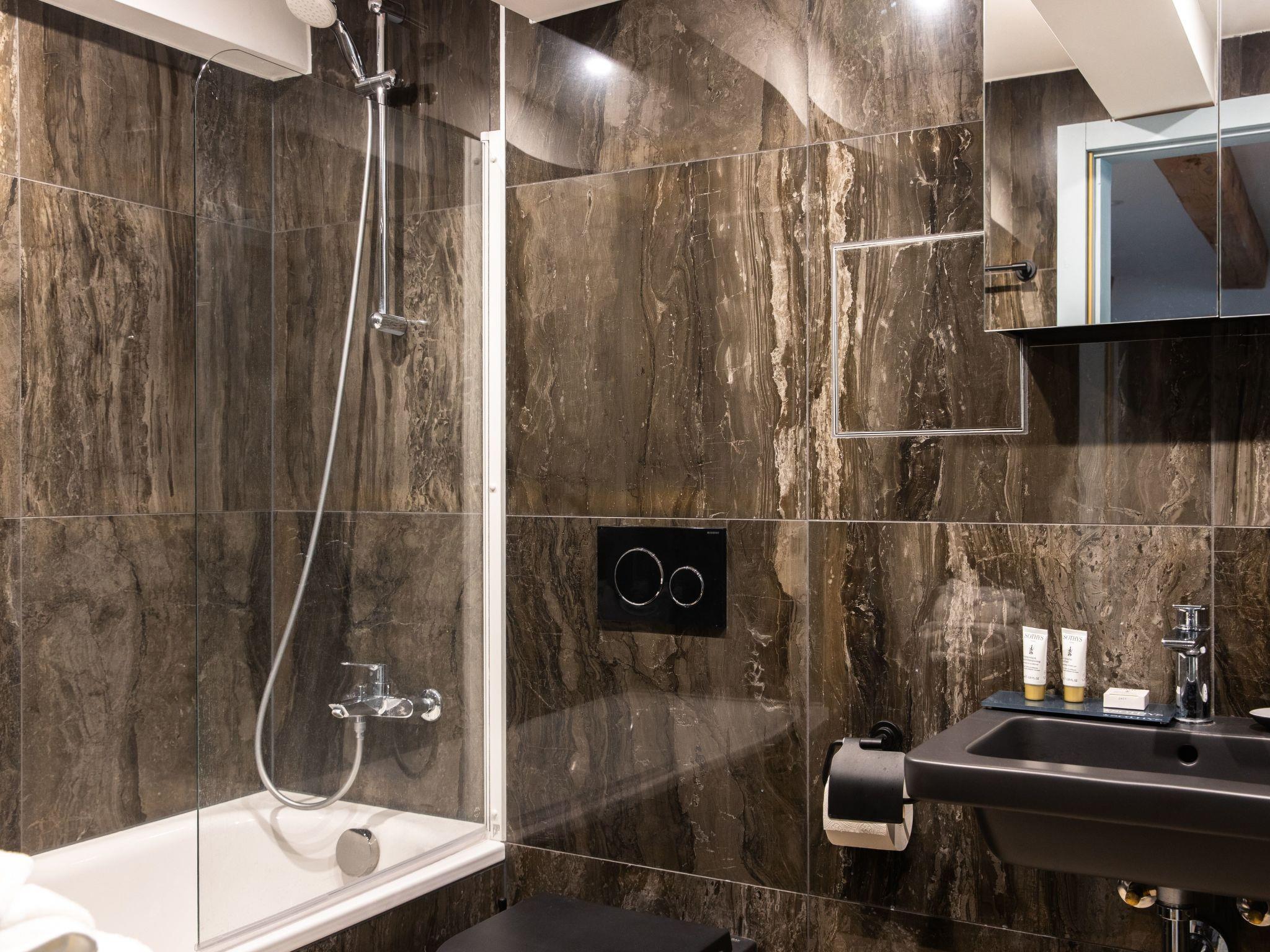 The interior of the duplex offers everything you need for a relaxing stay. The bedroom, which can be blacked out, guarantees peaceful nights and has a bathroom with bath and shower. The living room is comfortably furnished, including a kitchen with a 4-ring ceramic hob, capsule coffee machine and kettle. A washing machine for your sole use, a separate WC area and a lovingly furnished buanderie (laundry room) ensure a stress-free stay.