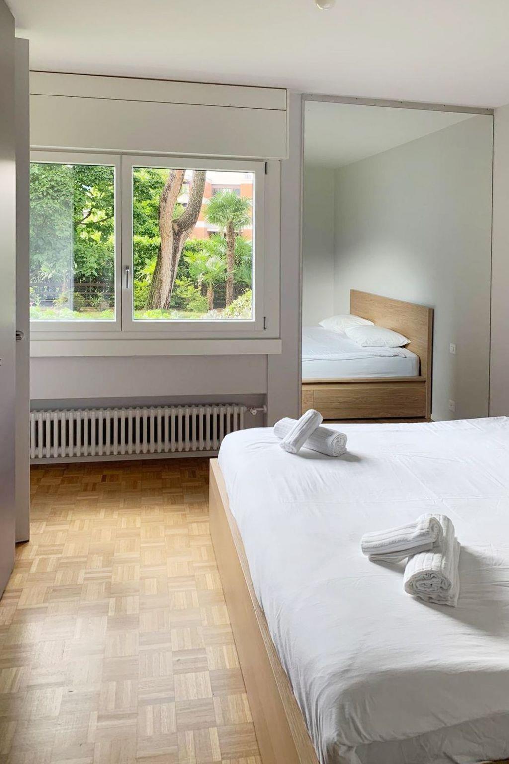 The master bedroom overlooks the garden and is equipped with a double bed with drawers and a wardrobe. The second bedroom faces the park behind and is equipped with 2 single beds and a wardrobe. A generous bathroom is in between the 2 bedrooms while a second small toilet is serving the day area.