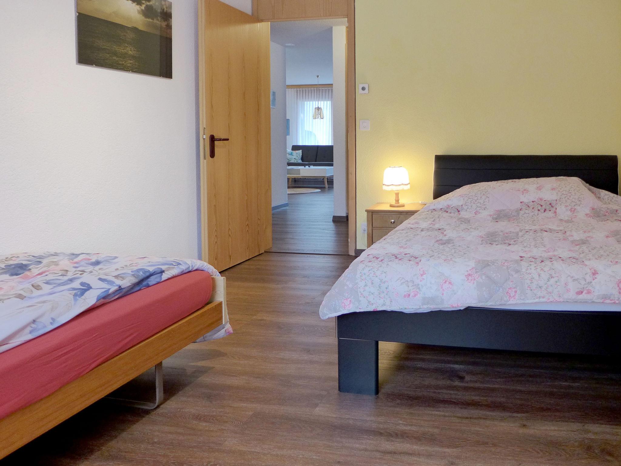 "Allmi", 3-room apartment 75 m2 on 2nd floor, south facing position. Spacious and bright, very comfortable and cosy furnishings: open living/dining room 30 m2 with dining table and cable TV (flat screen), hi-fi system. Exit to the balcony. 1 room with 1 bed (90 cm, length 200 cm), 1 french bed (140 cm, length 200 cm). 1 room with 1 double bed (2 x 90 cm, length 200 cm). Open kitchen (oven, dishwasher, 4 ceramic glass hob hotplates, microwave, electric coffee machine, Capsules for coffee machine (Delizio) extra, raclette grill, fondue Set (cheese)). Bath/shower/WC. Underfloor heating. Balcony, south facing position. Balcony furniture, electric barbecue. Very beautiful view of the mountains and the countryside. Facilities: iron, children's high chair, baby cot, hair dryer. Internet (WiFi, free). Parking (roofed, 1 car). Please note: suitable for families. Non-smokers only. Maximum 1 pet/ dog allowed. Smoke alarm.