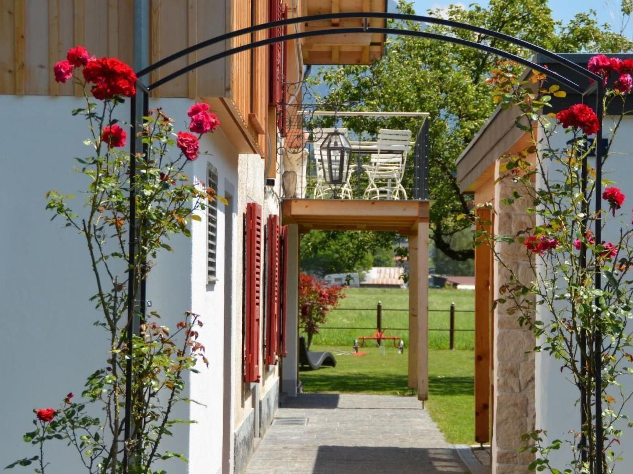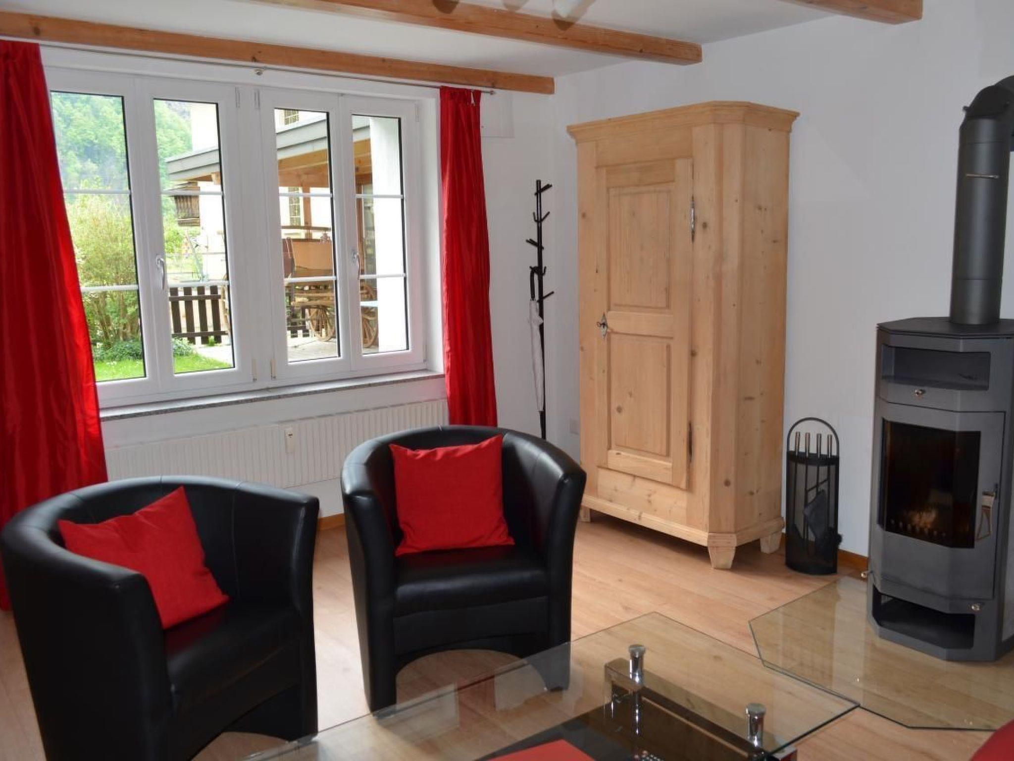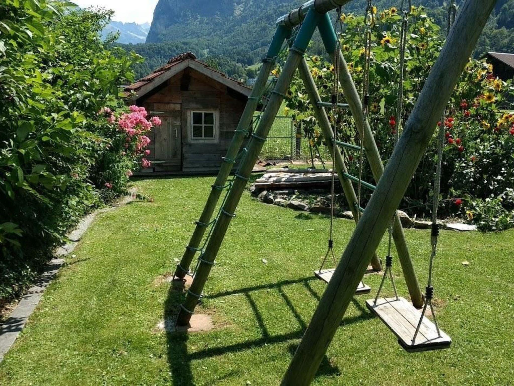Ground floor apartment in multiple family chalet in a quiet location on the outskirts of Meiringen. Nice kitchen/dining room with oven, dishwasher, fridge/freezer & microwave, coffeemaker, toaster and electric kettle, raclette device, caquelon for cheese fondue, hand blender, fully equiped. WLAN (free) Living room with swedish stove, satellite TV, radio, sofa bed in living room. Double bedroom. Bathroom with shower and toilet. Suitable for families. Separat entrance. Seating area in garden, outdoor table/chairs, grill. Laundry room with washing machine and dryer, iron and iron board available for use (free). Apartment has separate entrance. Private carpark. Apartment size = 43 m2. Beautiful garden with mountain view, playground with sand pit, playhouse and swing. Cot for baby/toddler available.