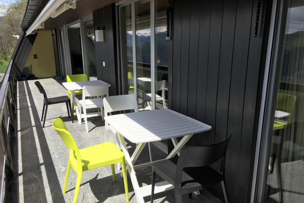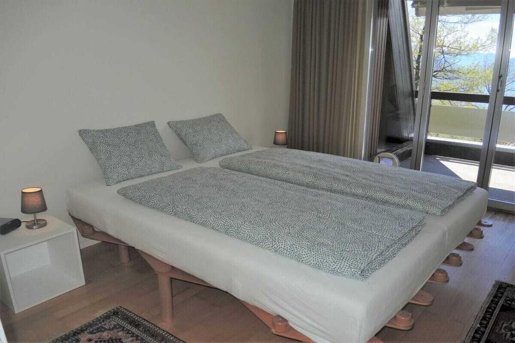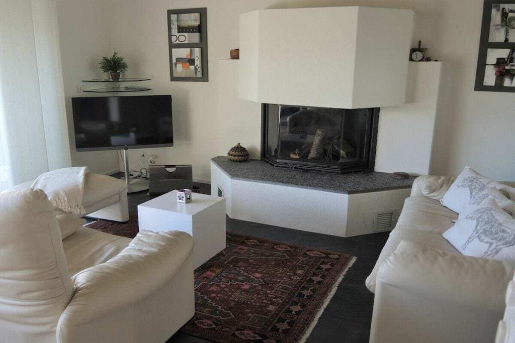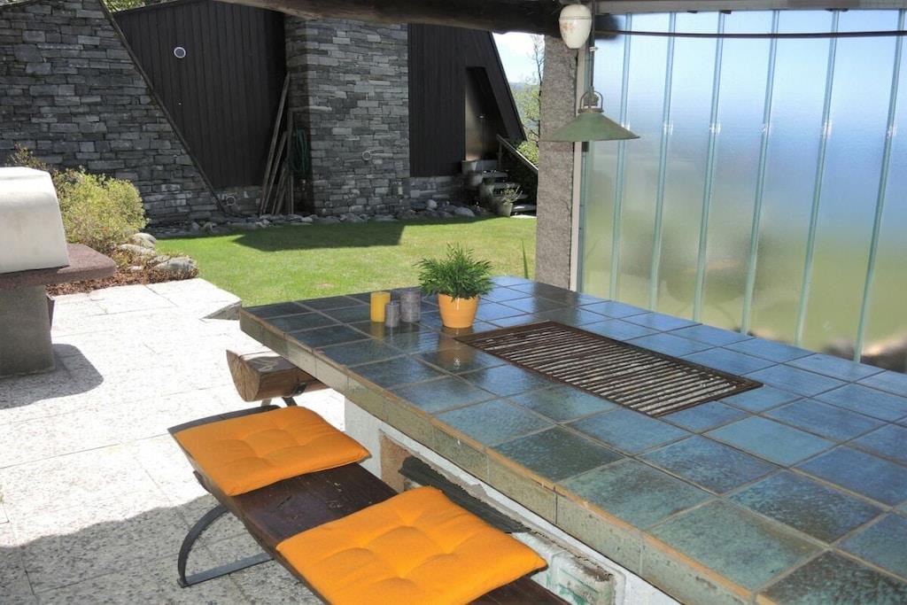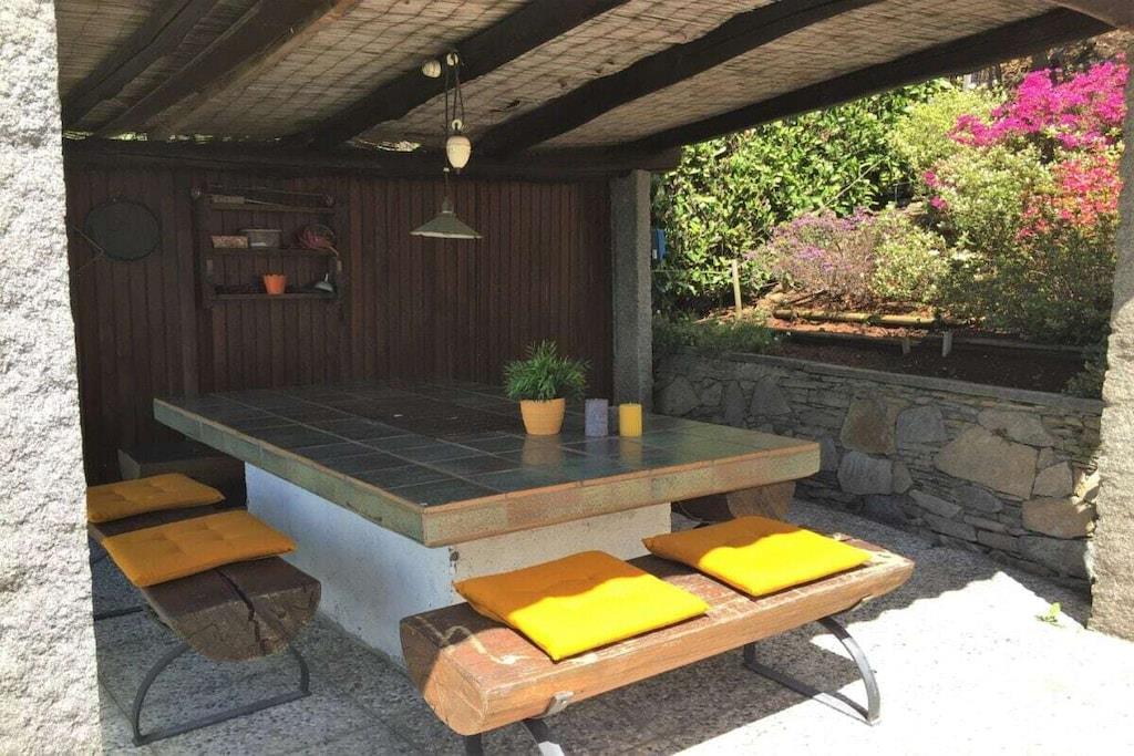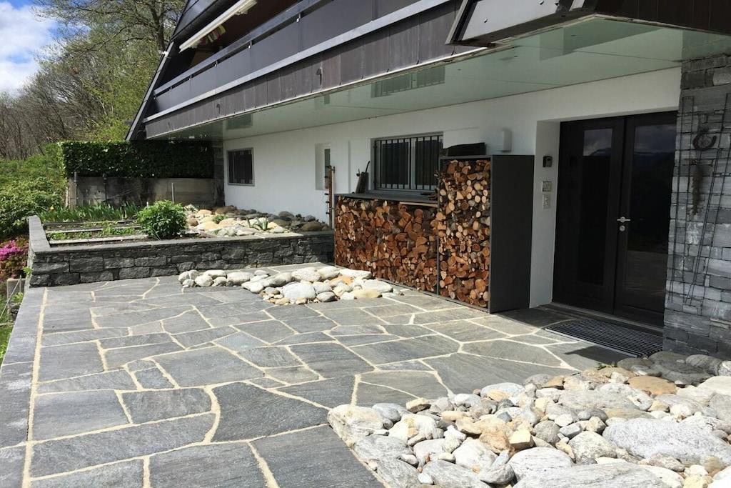 • 5.5-room holiday home, detached, on 2 floors • Living space approx. 190 m², outdoor area approx. 530 m² • Sleeps 6 • Sunny hillside location at approx. 965 m above sea level • Panoramic view of the lake and the Ticino valleys • Modern interior design . Ground floor • Spacious entrance area, staircase • 1 double bedroom, 2 mattresses • 1 bedroom with a 120 cm French bed • Bathroom with hydromassage bathtub, sink, and toilet . Upper Living Area • Fully equipped modern kitchen open to the living room • Ceramic hob, stove, oven • Dishwasher • Refrigerator with freezer • Piston espresso machine (ground coffee) • Filter coffee machine • Kettle, toaster • Spacious living/dining room with dining table and 6 chairs • Living area with coffee table and open fireplace • Exit to the 18 m² balcony with dining table and 6 chairs • Flat-screen TV, Wi-Fi • 1 double bedroom, 2 mattresses, exit to the balcony • 1 bedroom with a 120 cm French bed, exit to the balcony • Bathroom with shower, two sinks, toilet Outdoor Area • Private garden with pergola and dining table, sun loungers • Barbecue area (due to the proximity to the forest, only permitted if there is no ban in Ticino) • Pets not allowed • 2 private parking spaces along the street • Access to the house via a staircase (approx. 70 steps) • Washing machine, tumble dryer • Non-smoking, please smoke only outdoors • Security deposit: CHF 800.--, using your credit card number