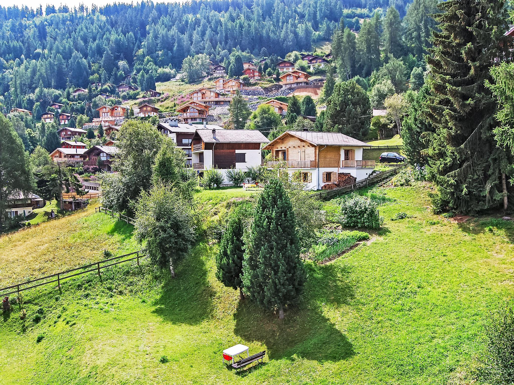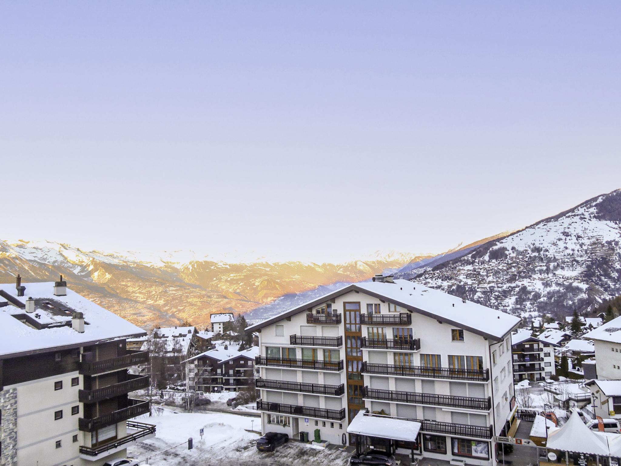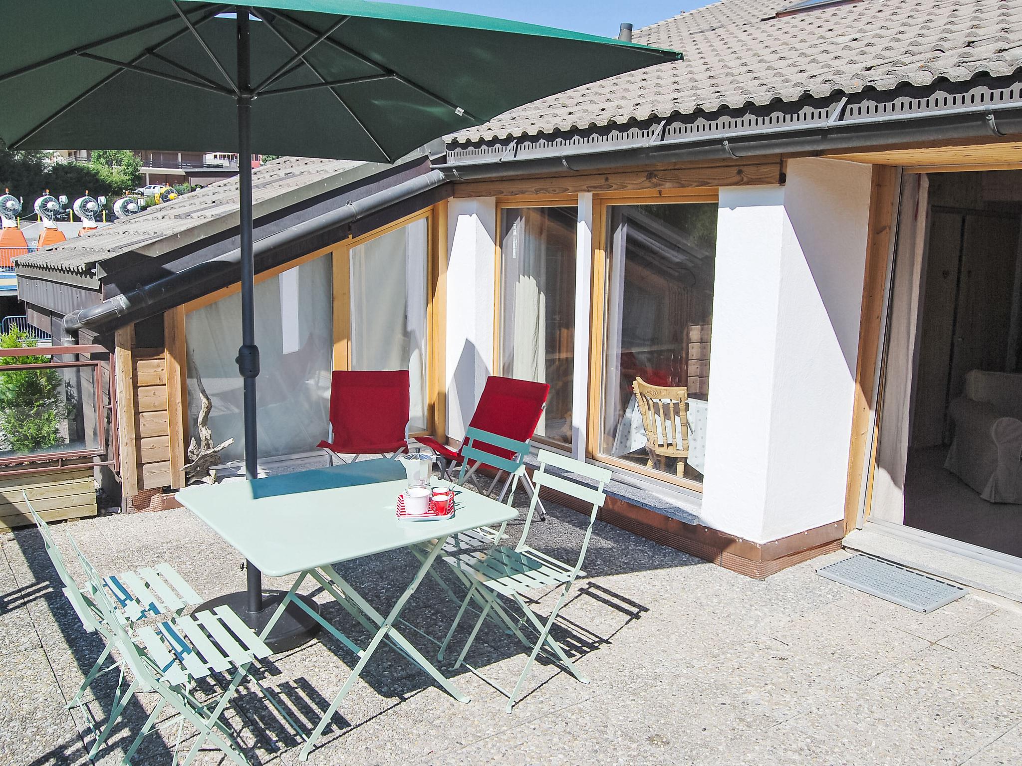"Bisse-Vieux A-4", 4-room penthouse 100 m2 on 2 levels on 4th floor. Bright, partly with sloping ceilings, beautiful and wooden furniture furnishings: living/dining room with panoramic window with open-hearth fireplace. Exit to the terrace, south facing position and east facing position. 1 room with 1 french bed (140 cm, length 200 cm). Exit to the balcony, north facing position and east facing position. 1 room with 1 french bed (1 x 150 cm, length 180 cm). Open kitchen (4 hot plates, oven, dishwasher, toaster, kettle, microwave, electric coffee machine, Capsules for coffee machine (Nespresso) extra, raclette grill, fondue Set (cheese)). Shower, sep. WC. Upper floor: 1 room with sloping ceilings with rooflight with 2 beds (90 cm, length 180 cm). Open small lounge with sloping ceilings, ceiling height 100 - 170 cm with cable TV and DVD. Shower/WC. Balcony, north-east facing position, terrace 10 m2, south facing position and, east facing position. Balcony furniture. Beautiful view of the mountains, the valley and the resort. Facilities: hair dryer. Internet (WiFi, free). Parking space n 11 (roofed, 1 car). Please note: non-smokers only.