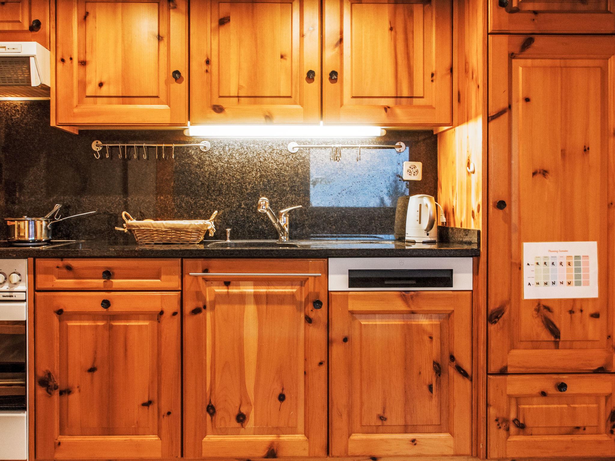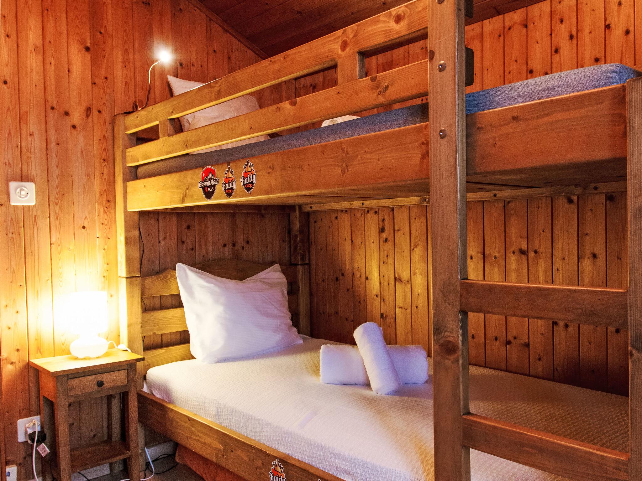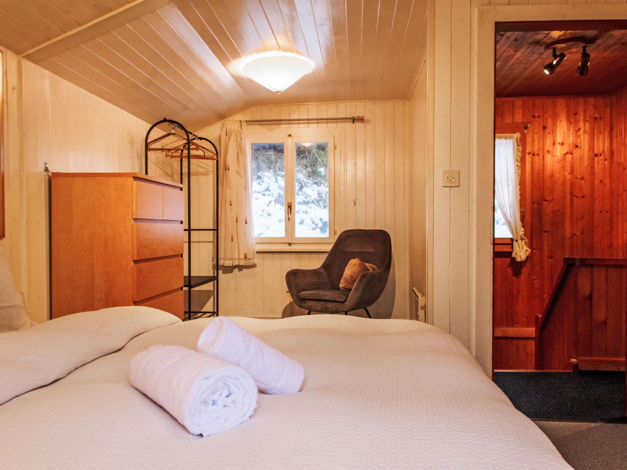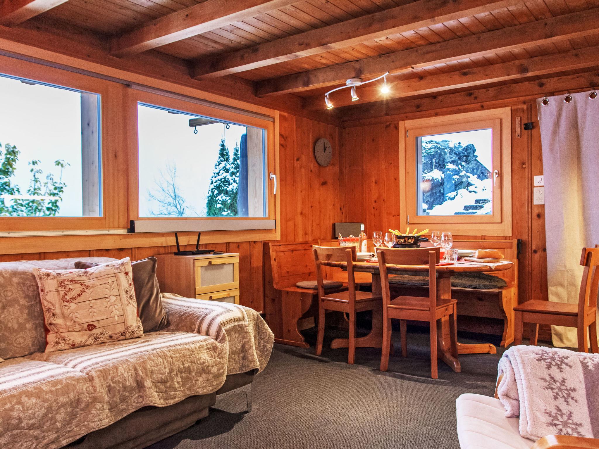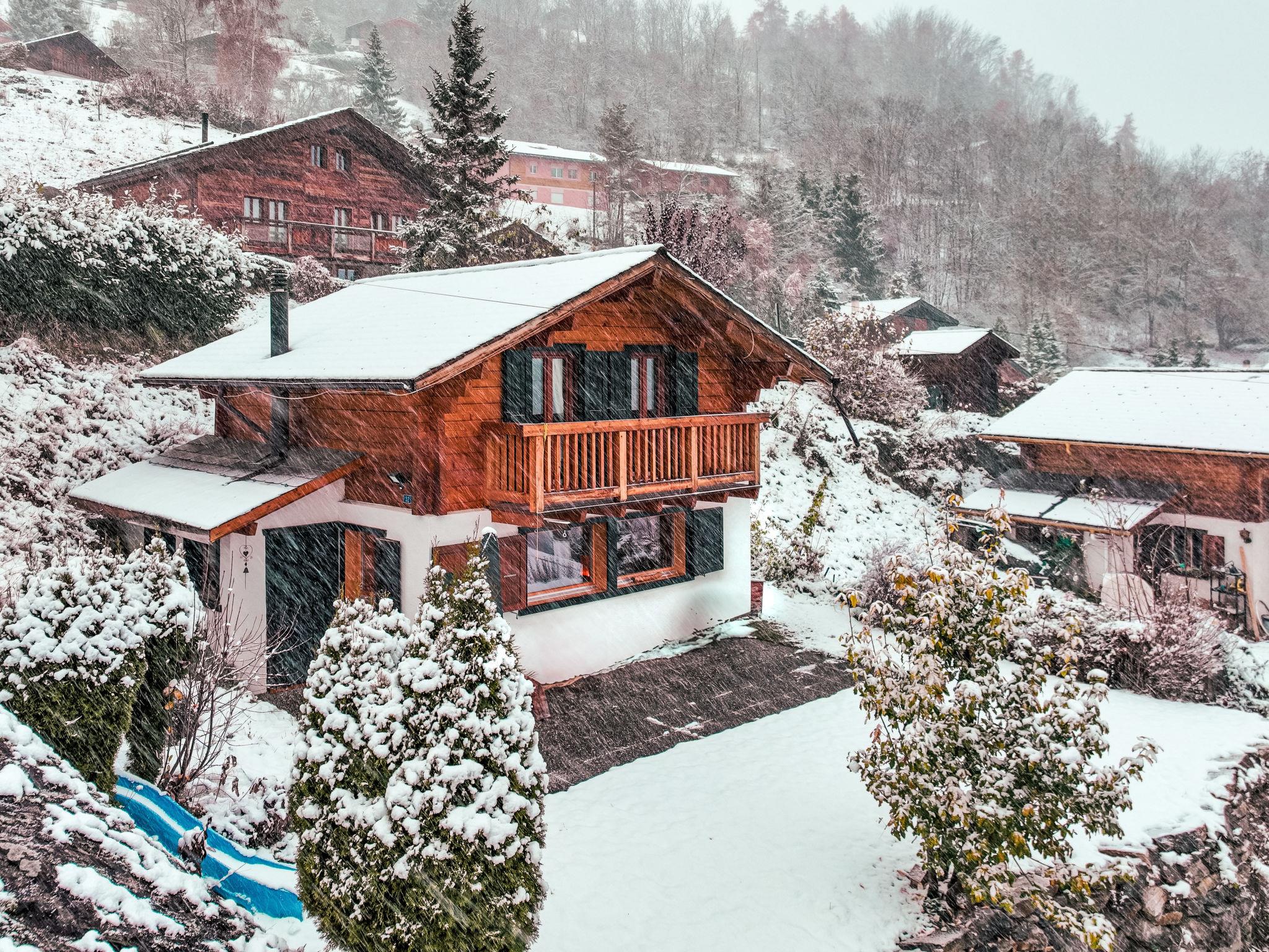 "Chalet Grepon", 3-room chalet 60 m2 on 2 levels, west facing position. Comfortable furnishings: entrance hall. Living/dining room. Open kitchen (oven, dishwasher, 4 ceramic glass hob hotplates, toaster, kettle, electric coffee machine, raclette grill, fondue Set (cheese)). Upper floor: 1 children's room with 1 x 2 bunk beds (90 cm, length 190 cm). Exit to the balcony. 1 room with 1 french bed (2 x 80 cm, length 200 cm). Exit to the balcony. Bath/WC. Heating. Terrace 16 m2, garden 40 m2. Terrace furniture, barbecue. Very beautiful view of the mountains. Facilities: washing machine, hair dryer. Internet (WiFi, free). Please note: non-smokers only. The stove is to be supplied with pellets.