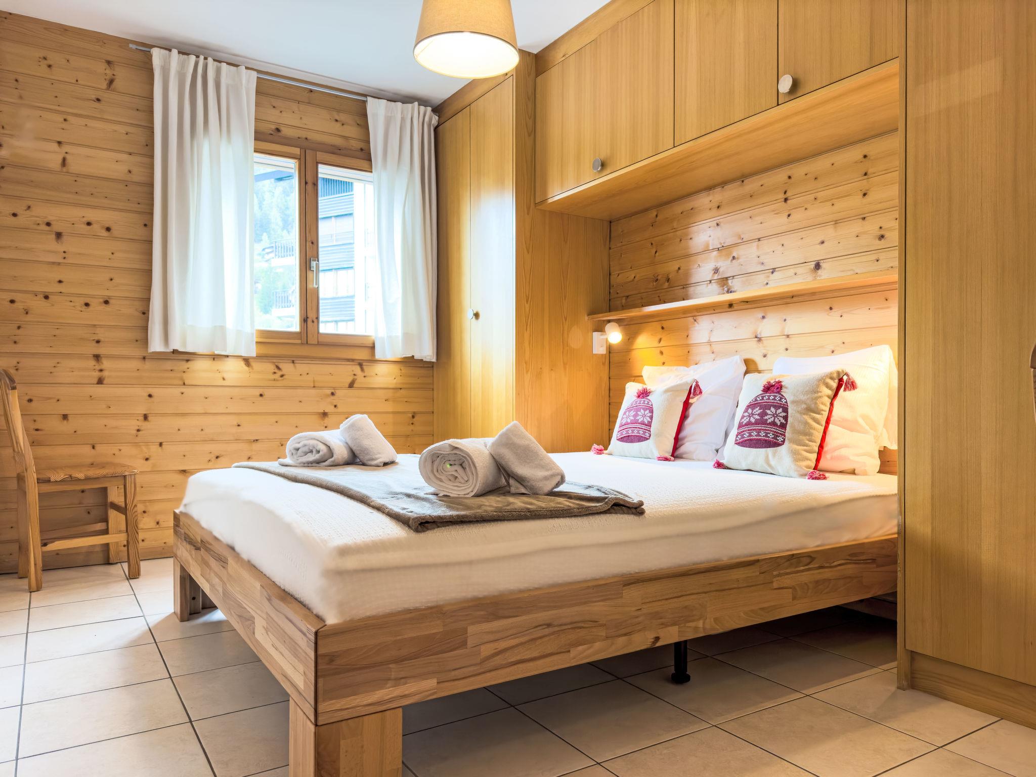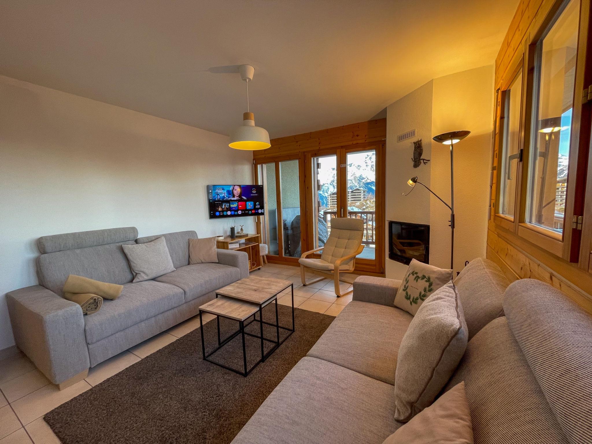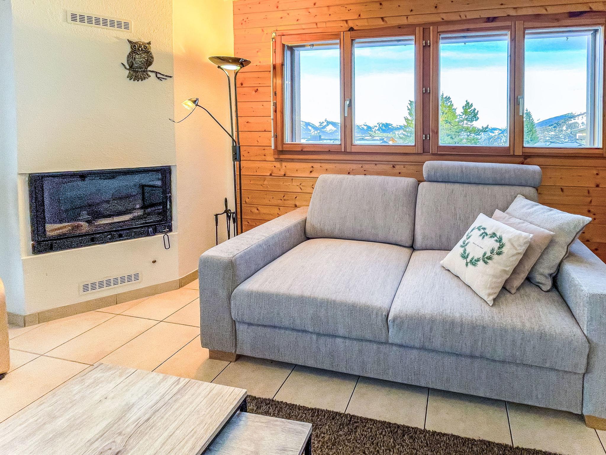 "Les Chouettes 11", 3-room apartment 80 m2 on 1st floor. Comfortable furnishings: living/dining room with open-hearth fireplace and cable TV. Exit to the terrace, north facing position. Dining room. Exit to the terrace, south facing position. 1 room with 1 double bed (2 x 80 cm, length 200 cm). 1 room with 1 double bed (2 x 80 cm, length 200 cm). Kitchenette (oven, dishwasher, 4 ceramic glass hob hotplates, toaster, kettle, microwave, electric coffee machine, Capsules for coffee machine (Nespresso) extra, raclette grill, fondue Set (cheese)). Bath/WC, shower/WC. Beautiful view of the mountains and the valley. Facilities: Internet (WiFi, free). Parking, garage space n 1, height 210 cm, width 230 cm. Please note: non-smokers only.