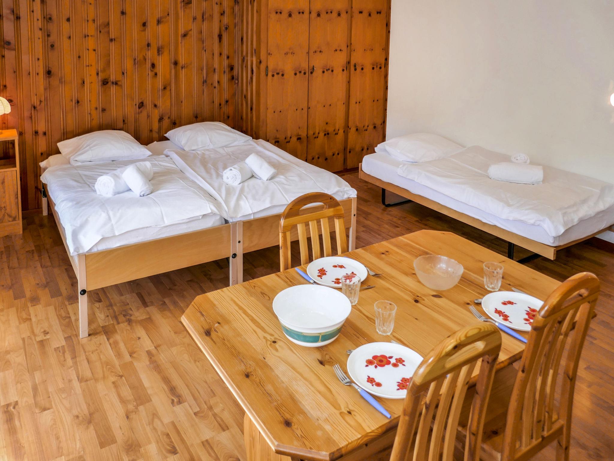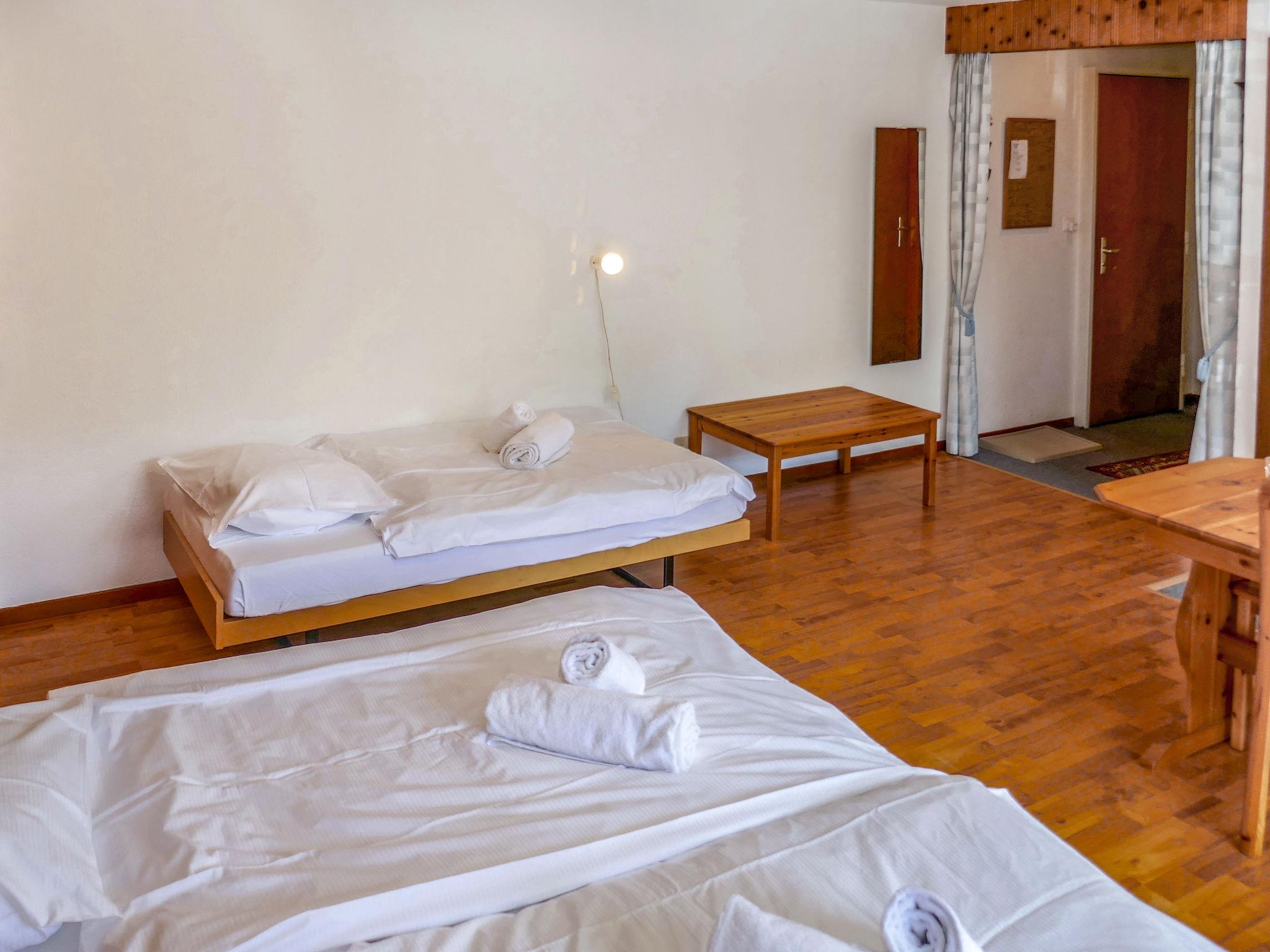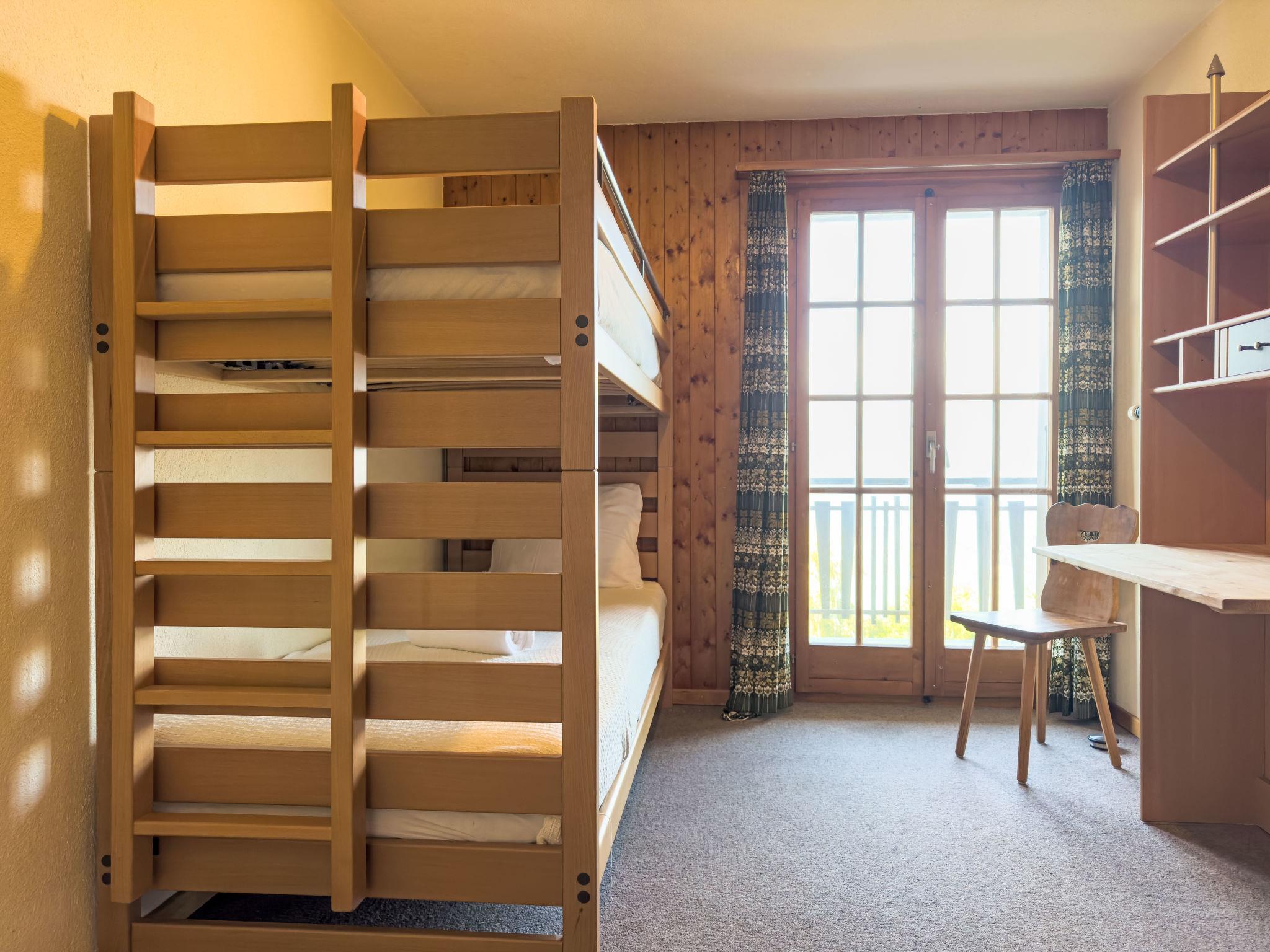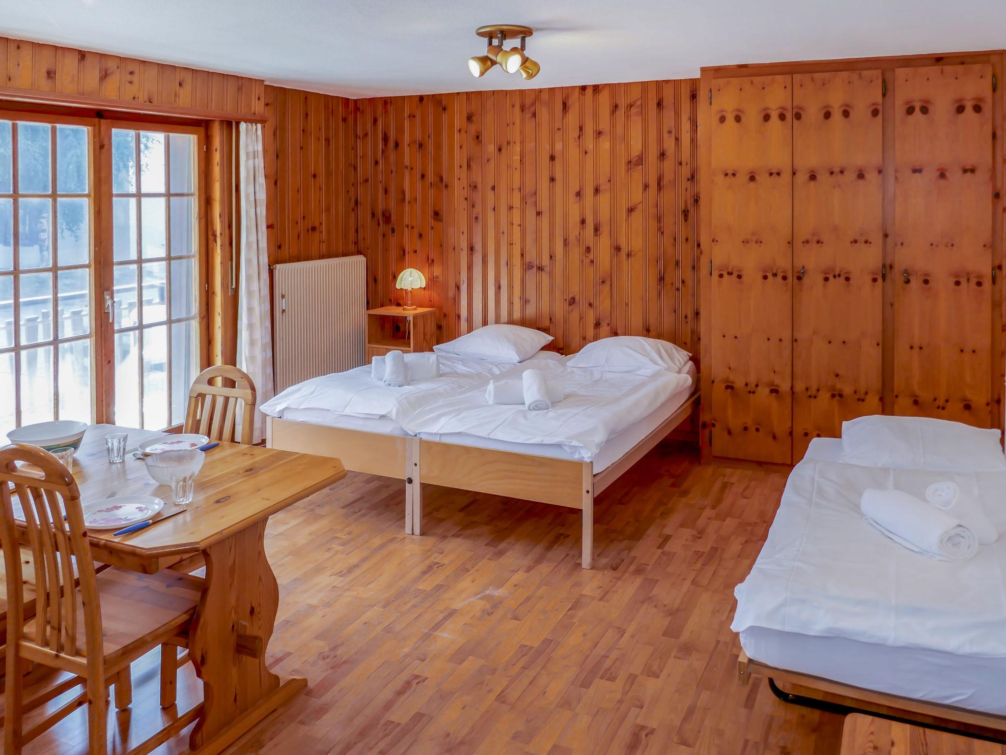 "Mont-Soleil 2&3", 4-room apartment 120 m2 on 1st floor. Partly renovated in 2024, practical furnishings: living room with sliding door with 2 wall-trunk beds (90 cm, length 200 cm), open-hearth fireplace and cable TV. Exit to the balcony, east facing position and south facing position. 1 room with 1 x 2 bunk beds (90 cm, length 200 cm). Exit to the balcony, north facing position. 1 room with 1 french bed (140 cm, length 200 cm). 1 double bedroom 30 m2 with 3 beds (90 cm, length 190 cm), bath/WC. Exit to the balcony. Kitchen (4 hot plates, oven, dishwasher, toaster, microwave, freezer, raclette grill, fondue Set (cheese)). Bath/WC, sep. WC. 3 balconies. Balcony furniture. View of the mountains and the valley. Facilities: Internet (WiFi, free). Please note: one double bedroom is outside the apartment. Non-smokers only. No internal connecting door between the separated properties. 3-bed room with independent access or shared balcony.