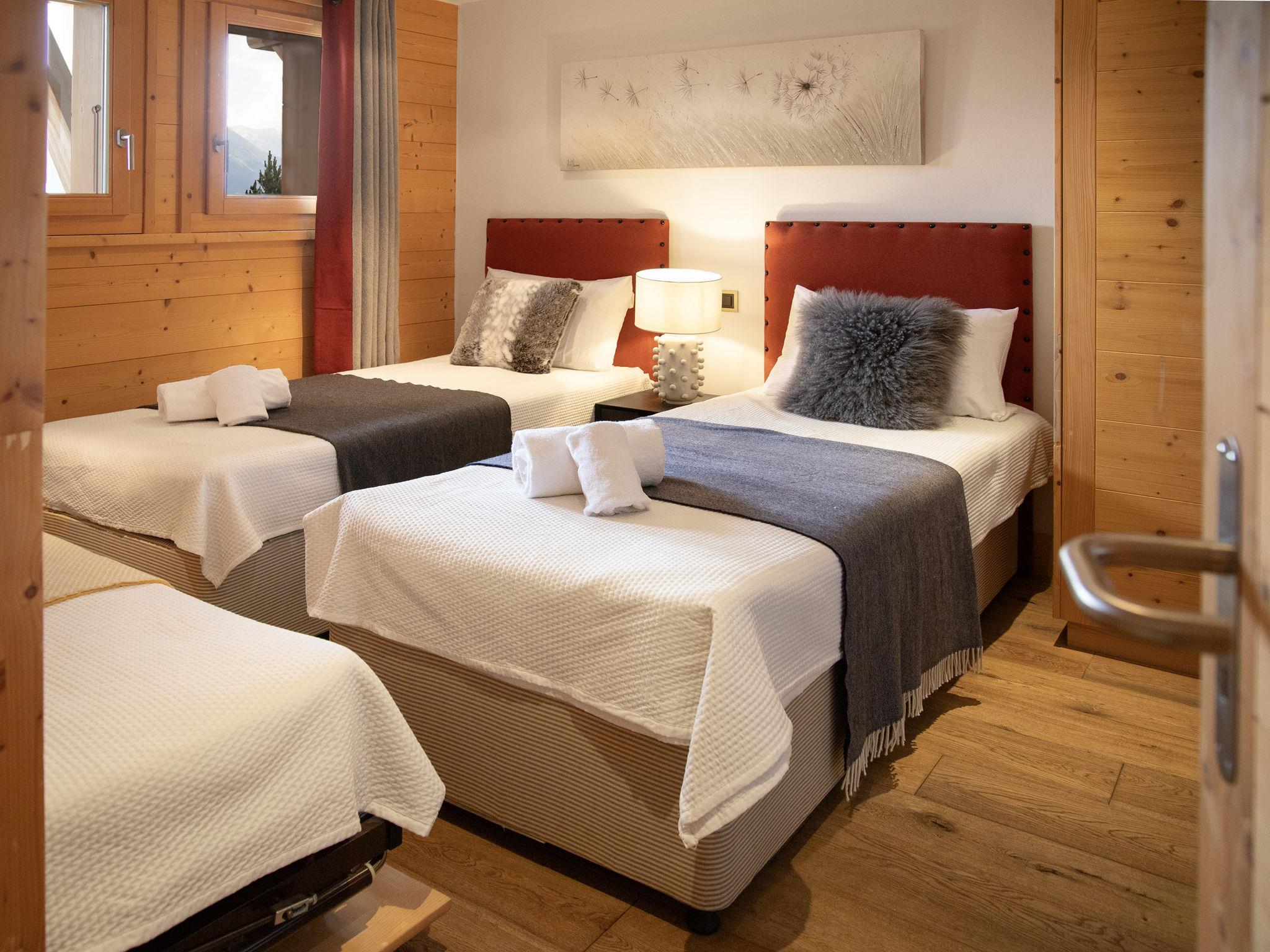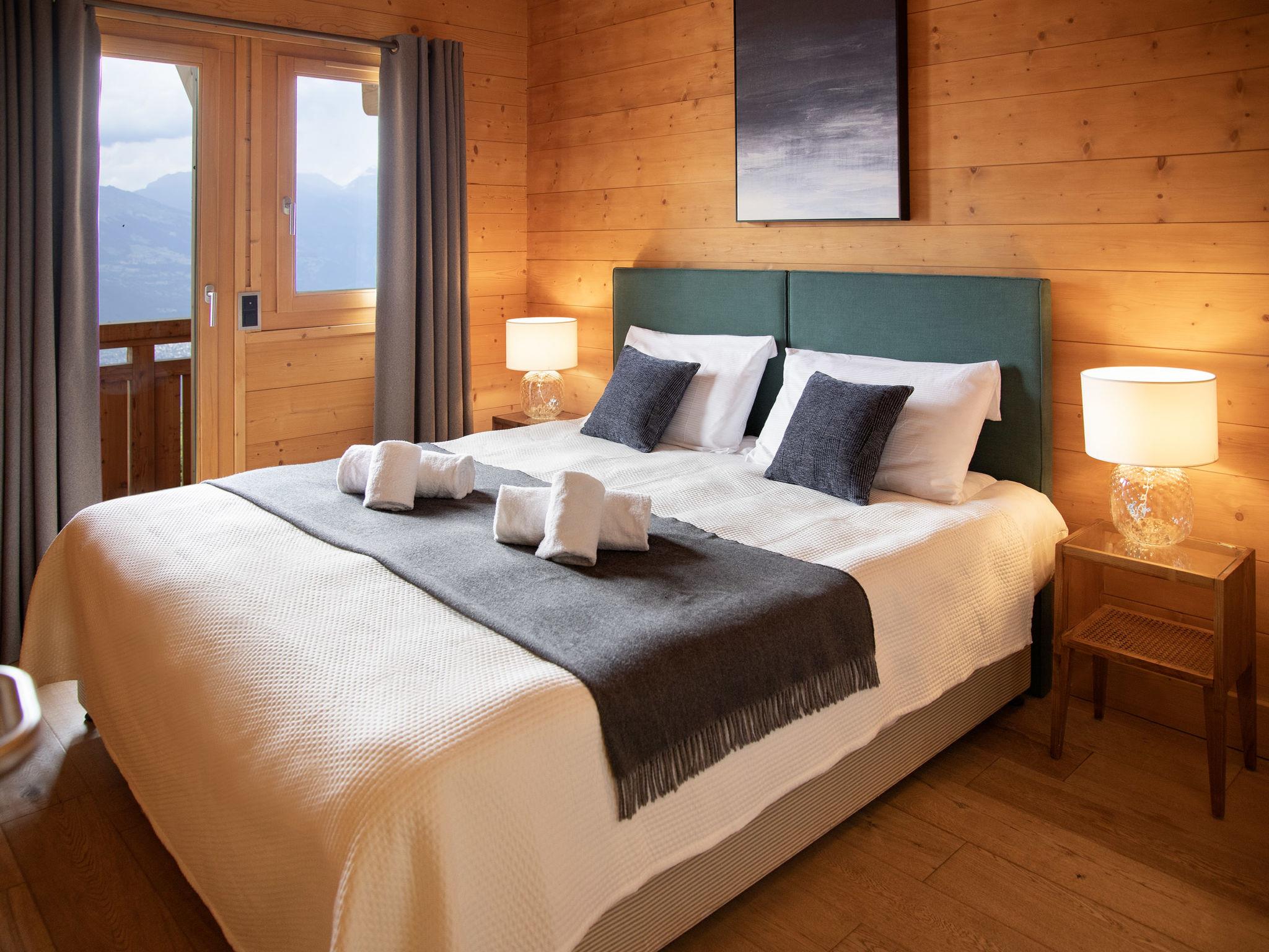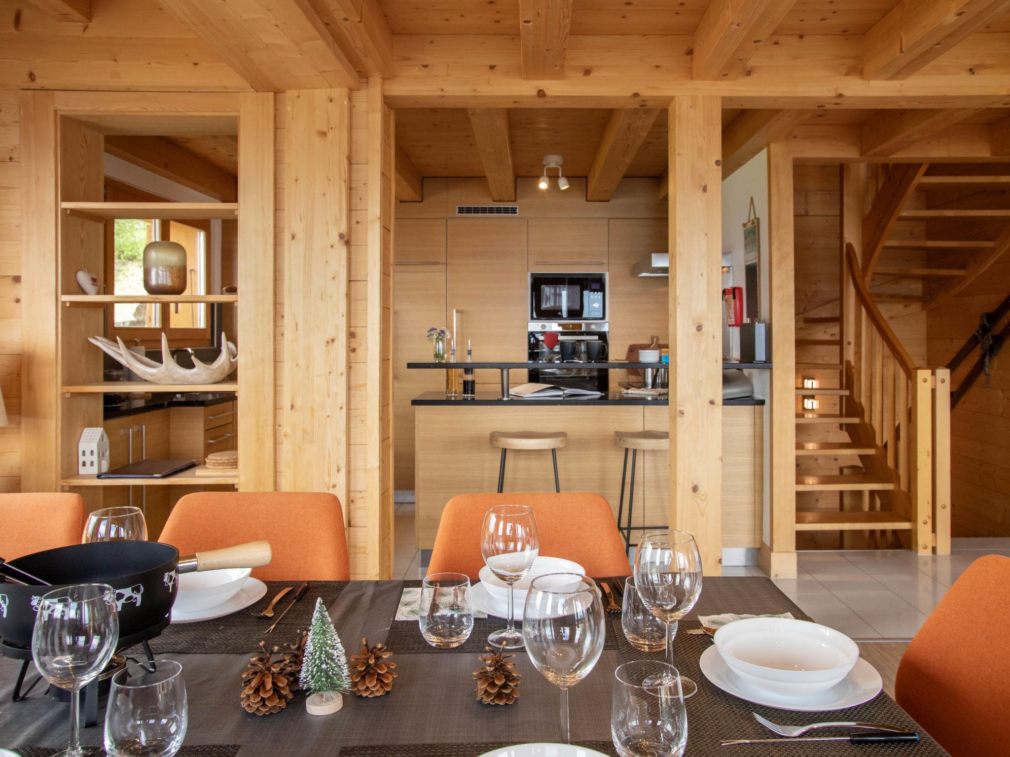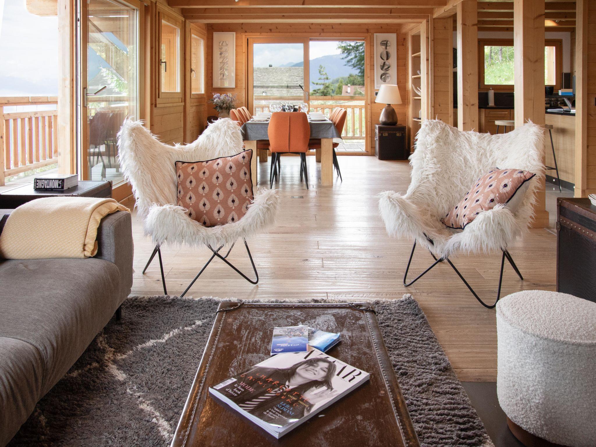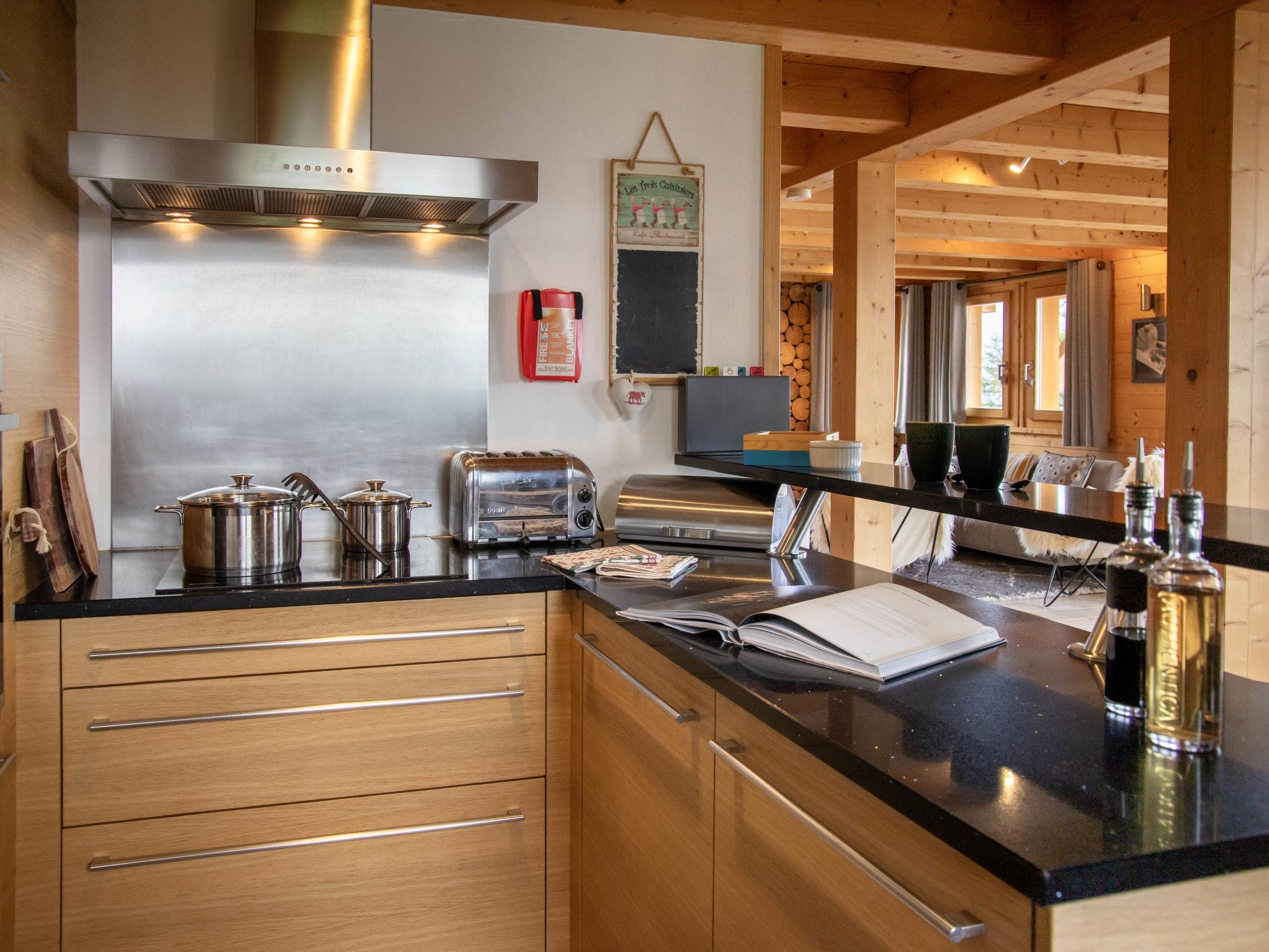 "Etoile", 6-room chalet 220 m2 on 3 levels. Spacious, comfortable and tasteful furnishings: living room with open-hearth fireplace and cable TV. Exit to the terrace, east facing position. Living/dining room with open-hearth fireplace and cable TV. Exit to the balcony, north facing position. Open kitchen (oven, dishwasher, 4 induction hot plates, toaster, kettle, microwave, electric coffee machine, Capsules for coffee machine (Nespresso) extra, raclette grill, fondue Set (chinoise, cheese)). On the lower ground floor: entrance hall. 2 rooms, each room with 2 beds (90 cm, length 200 cm), shower/WC. Sep. WC. Underfloor heating. Upper floor: 2 rooms, each room with 1 double bed (2 x 90 cm, length 200 cm), bath/shower/WC and double hand-basin. Exit to the balcony, north facing position. Balcony, terrace. Terrace furniture, barbecue. Marvellous panoramic view of the mountains. Facilities: washing machine, dryer, iron, hair dryer. Internet (WiFi, free). Parking (2 cars), in winter at 500 m. Please note: non-smokers only.