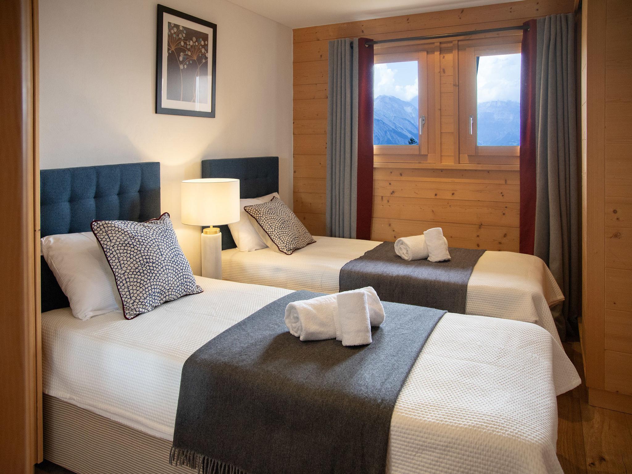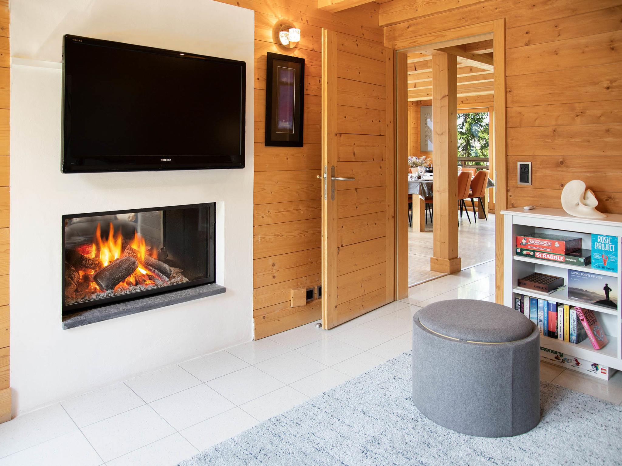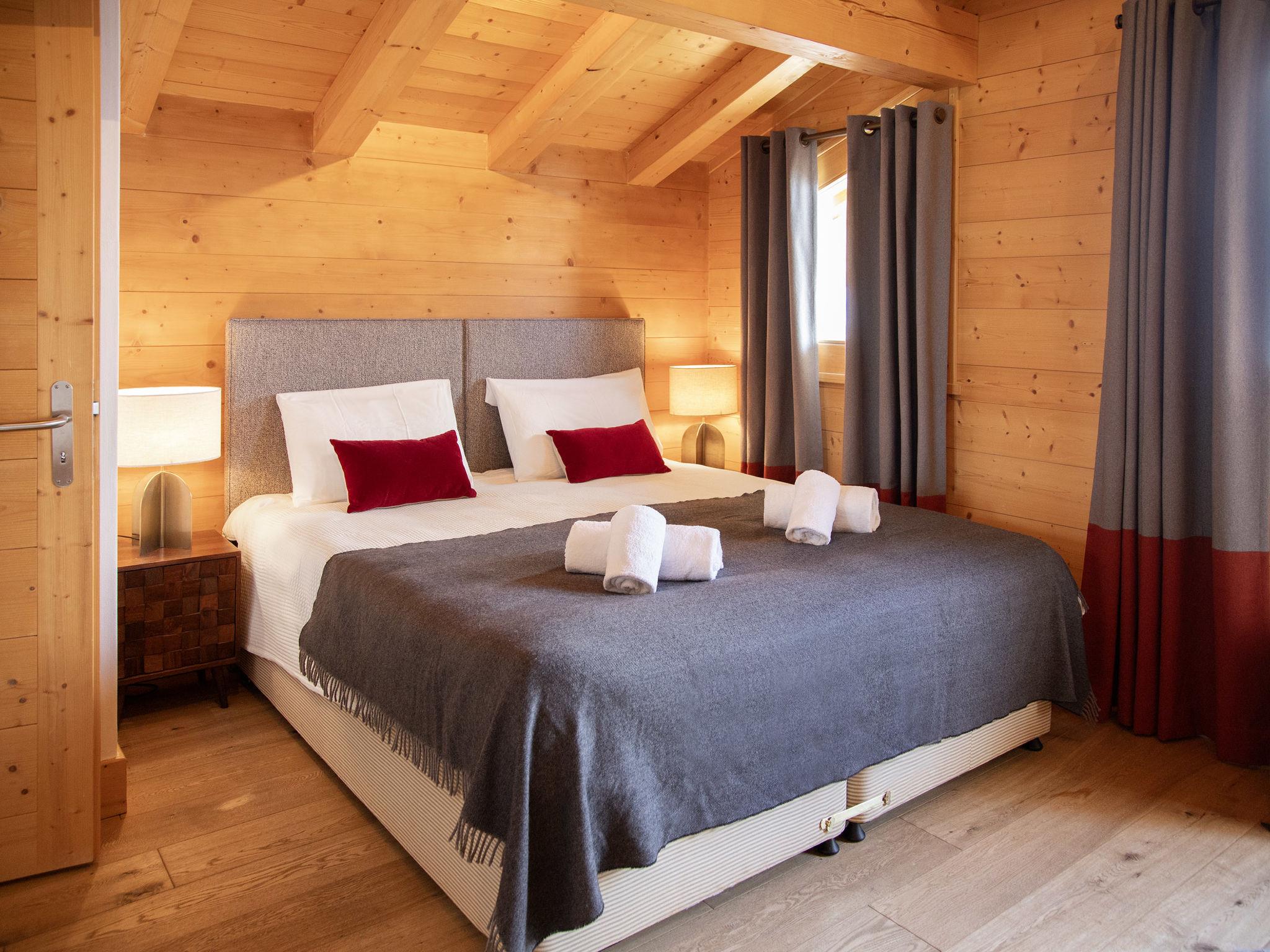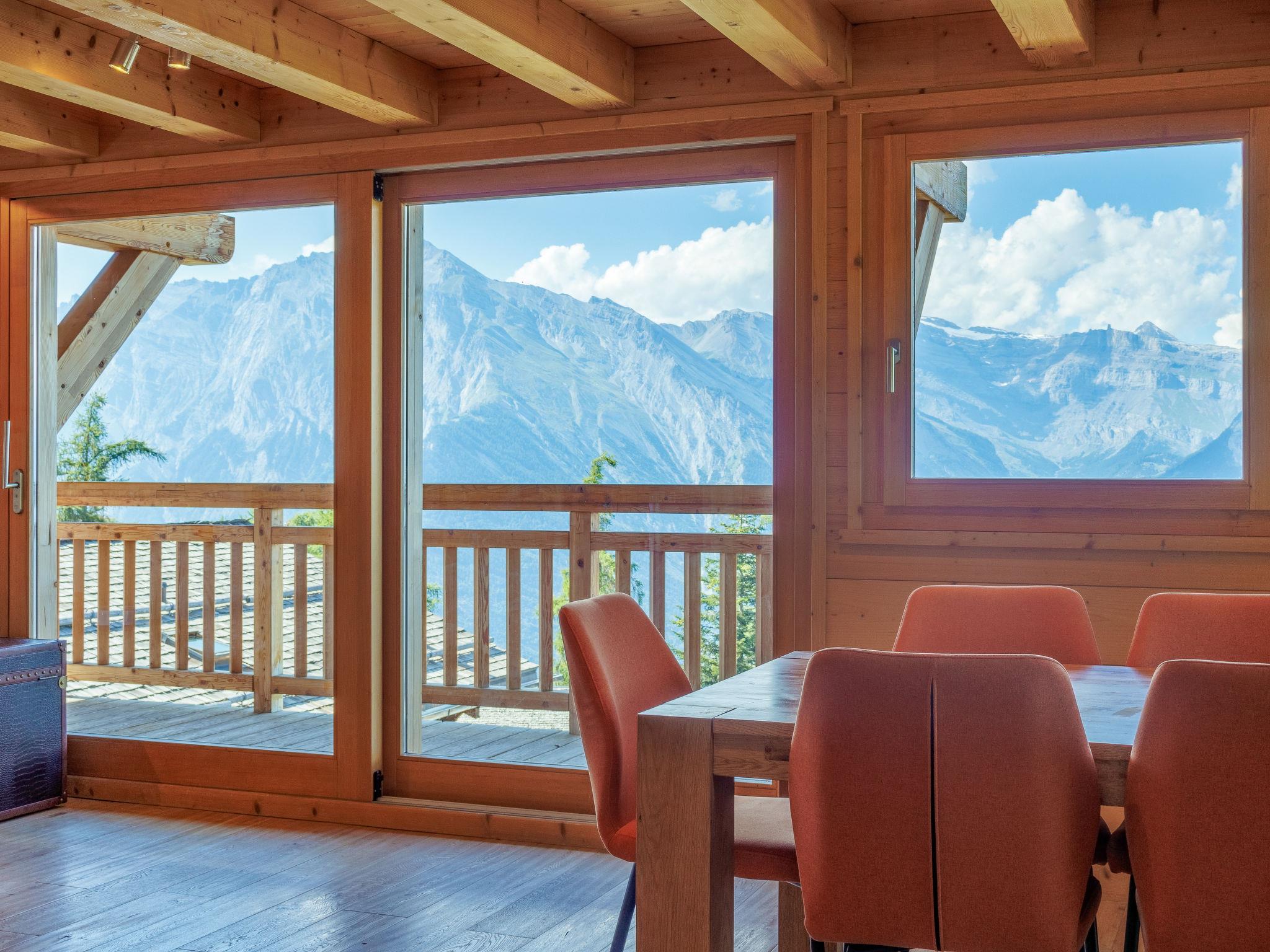 "Etoile", 6-room chalet 220 m2 on 3 levels. Spacious, comfortable and tasteful furnishings: living room with open-hearth fireplace and cable TV. Exit to the terrace, east facing position. Living/dining room with open-hearth fireplace and cable TV. Exit to the balcony, north facing position. Open kitchen (oven, dishwasher, 4 induction hot plates, toaster, kettle, microwave, electric coffee machine, Capsules for coffee machine (Nespresso) extra, raclette grill, fondue Set (chinoise, cheese)). On the lower ground floor: entrance hall. 2 rooms, each room with 2 beds (90 cm, length 200 cm), shower/WC. Sep. WC. Underfloor heating. Upper floor: 2 rooms, each room with 1 double bed (2 x 90 cm, length 200 cm), bath/shower/WC and double hand-basin. Exit to the balcony, north facing position. Balcony, terrace. Terrace furniture, barbecue. Marvellous panoramic view of the mountains. Facilities: washing machine, dryer, iron, hair dryer. Internet (WiFi, free). Parking (2 cars), in winter at 500 m. Please note: non-smokers only.