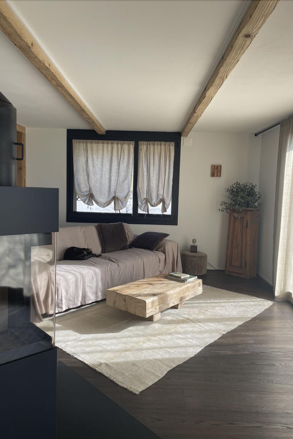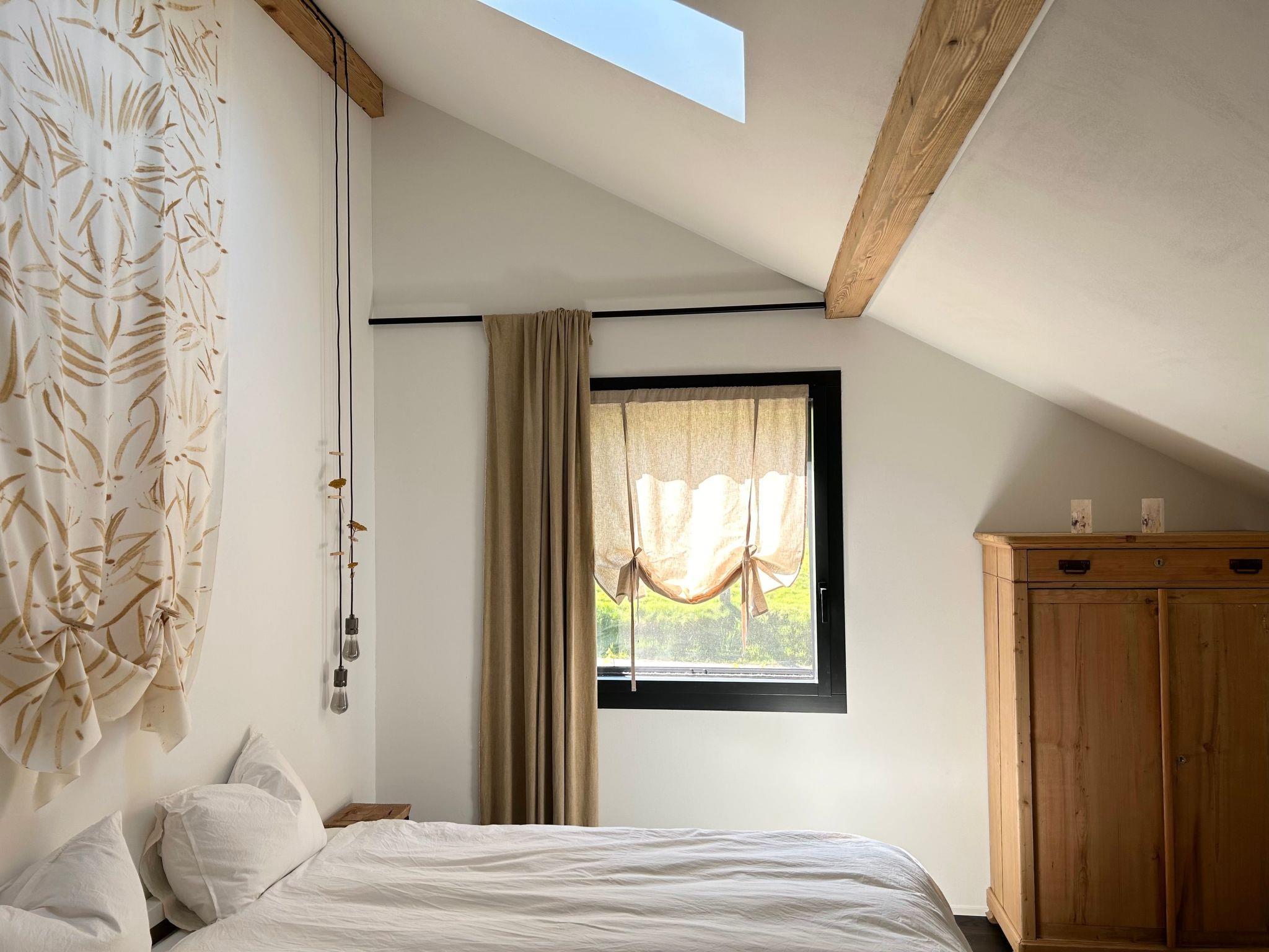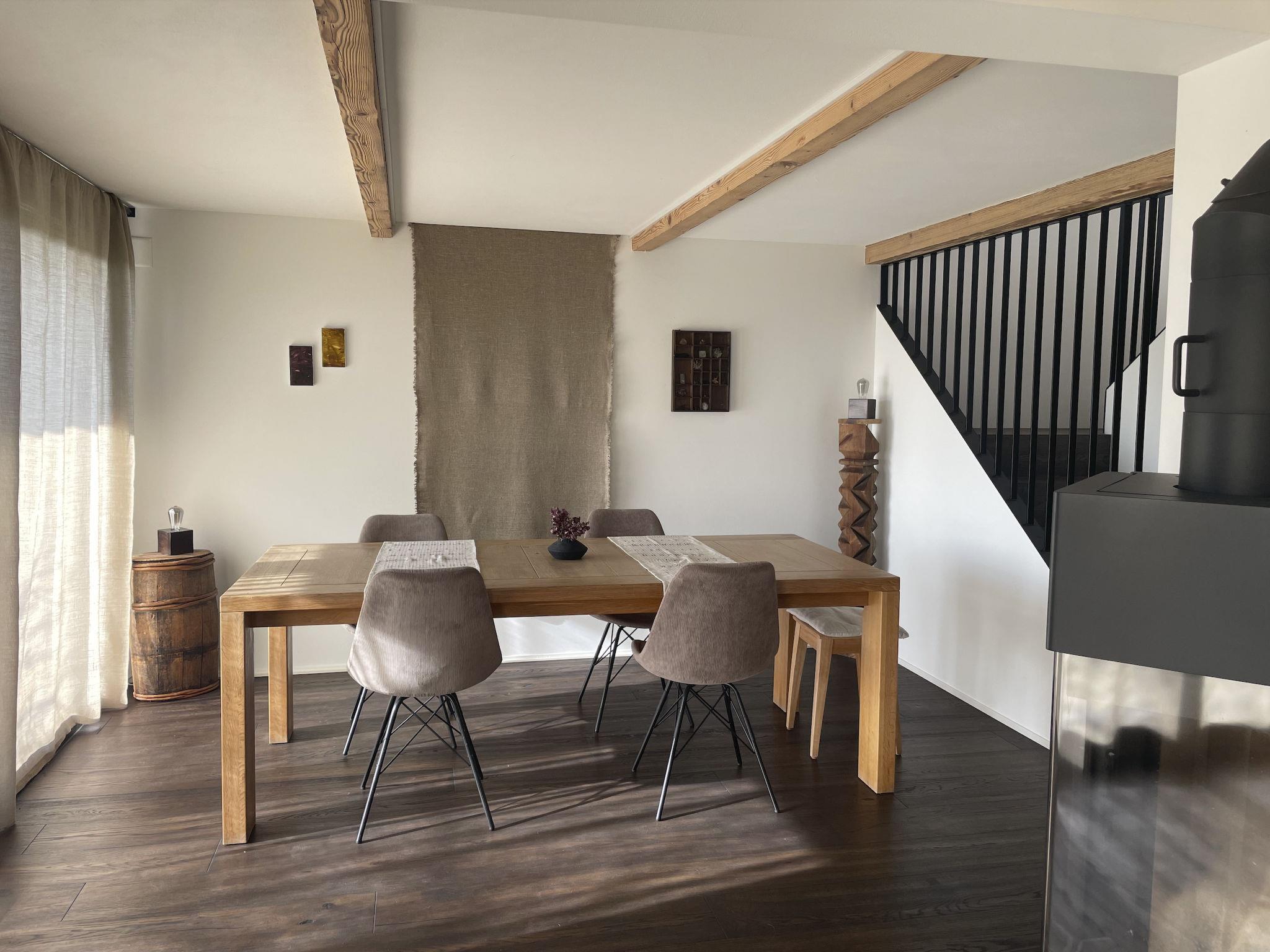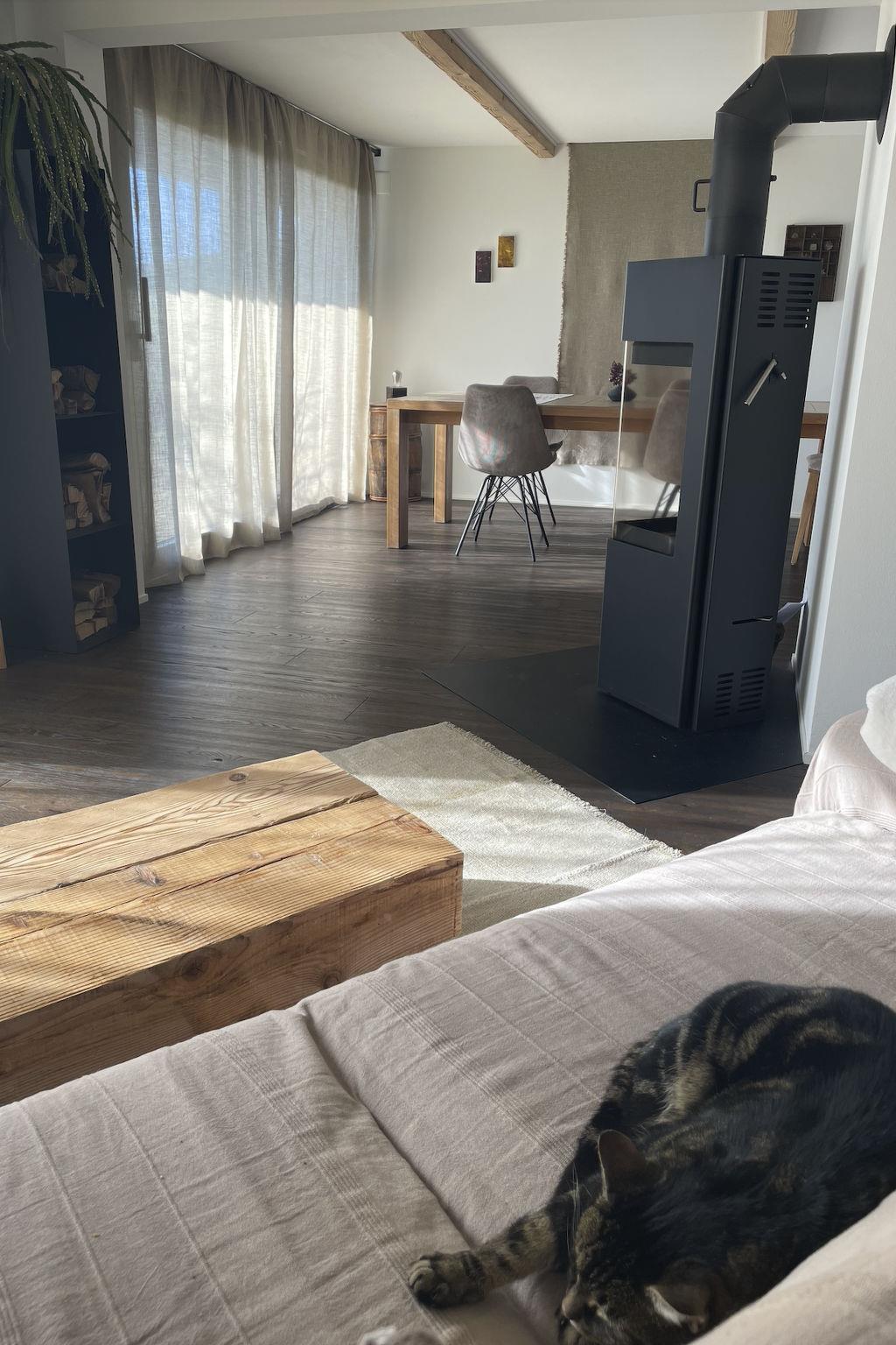 Whether the weather is fine or rainy, the flat offers everything you need to make your home cosy: The lighting concept ensures a cosy ambience at all times and the fireplace stove warms you even on cooler days. The fully equipped kitchen invites you to cook and the private, spacious terrace offers you an additional dining table with midday and evening sun. Enjoy the marvellous view from the private balcony of the lovely hilly landscape with forests, where deer and foxes are out and about every day. For your sports training, the flat offers you a fitness corner, Wi-Fi and printer allow you to work comfortably from home and for entertainment and inspiration you will find selected literature, games and local works of art (no TV available). I personally designed the interior architecture with great attention to detail: It was important to me to make the old building structure visible, so that the traditional charm is preserved even with modern comfort.