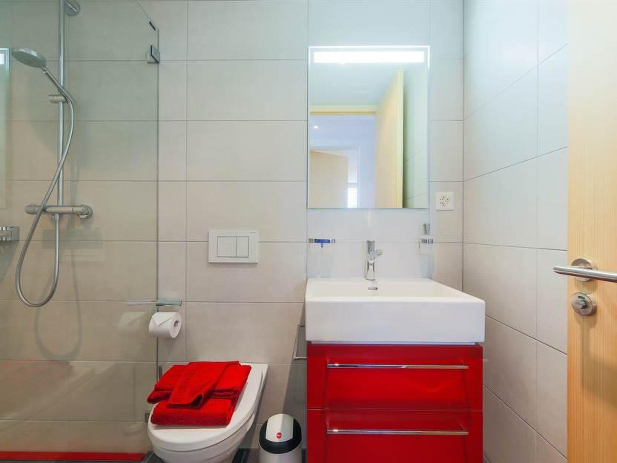 The holiday apartment "Nico" has two bedrooms and two bathrooms. One of the rooms is equipped with a double bed and its own bathroom with a bathtub, toilet and sink. The second room offers two single beds as well as a private television. The second bathroom features a walk-in shower with a rain showerhead, toilet and sink. The open kitchen is fully equipped with an oven, steamer, cooktop, dishwasher, coffee machine and more. The living area with a pull-out sofa and TV adjoins directly. The south-facing balcony offers an unobstructed view of the Valais mountain world. A shared ski and bike room is available.