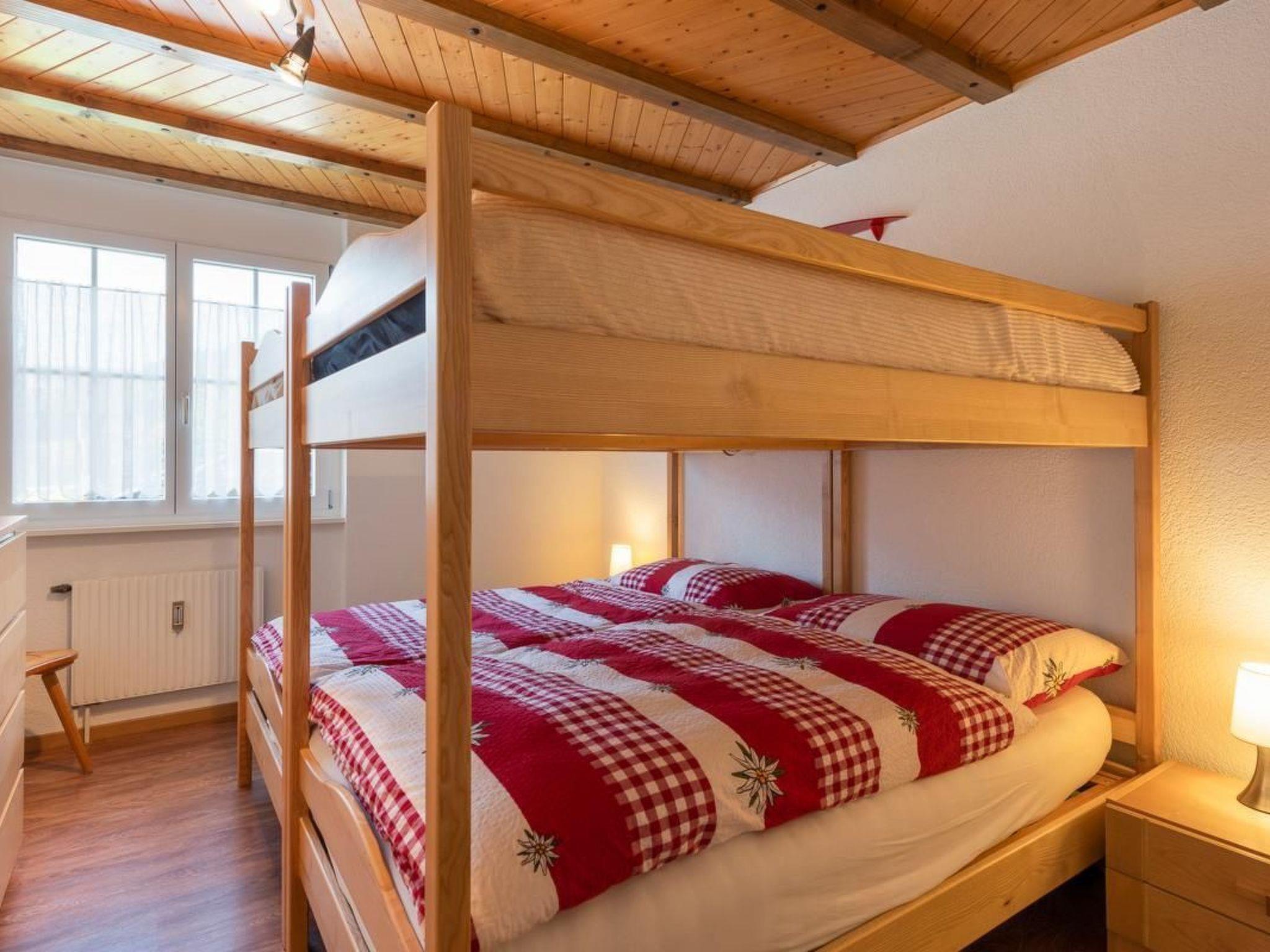 With its sunny location in a charming chalet, the flat exudes comfort and cosiness. It is a 2 ½ room flat with a bedroom with 2 bunk beds (for 4 people) and a living room with a double sofa bed. The living room is furnished with a cosy dining table next to the open kitchen, which can seat up to 6 people. The equipment also includes a large fridge, a 4-ring ceramic hob, dishwasher, TV and WLAN. A fondue caquelon, a fondue bourguignon rechaud and a Nespresso coffee machine (capsules available in the local supermarket) are available for cosy evenings.