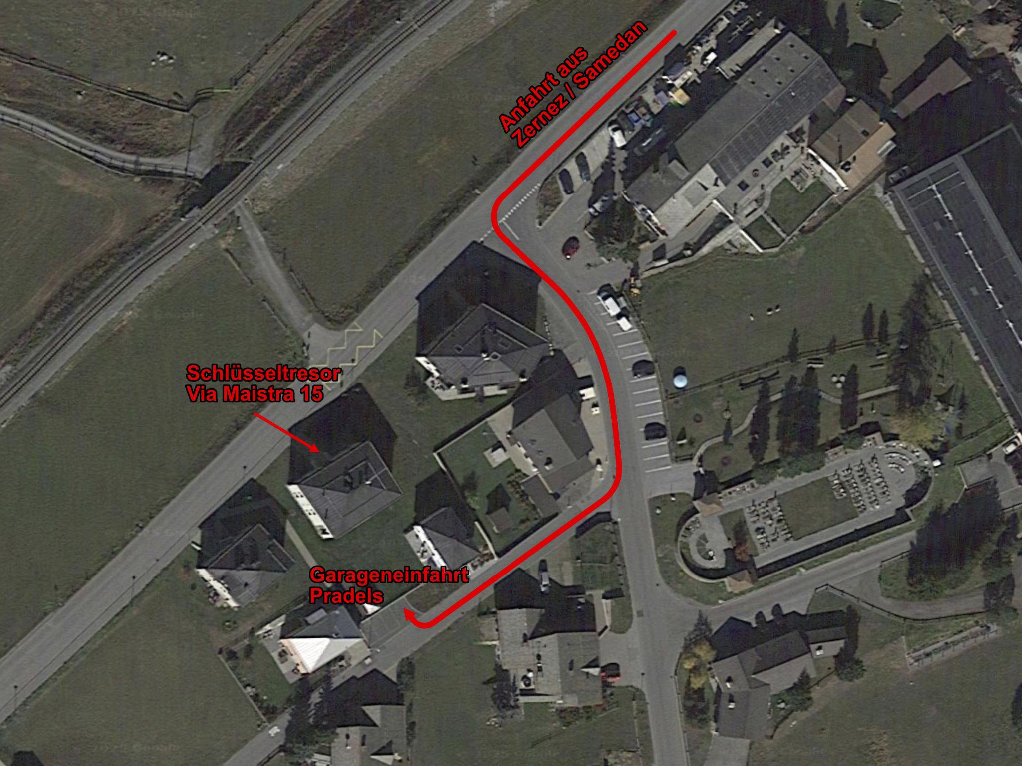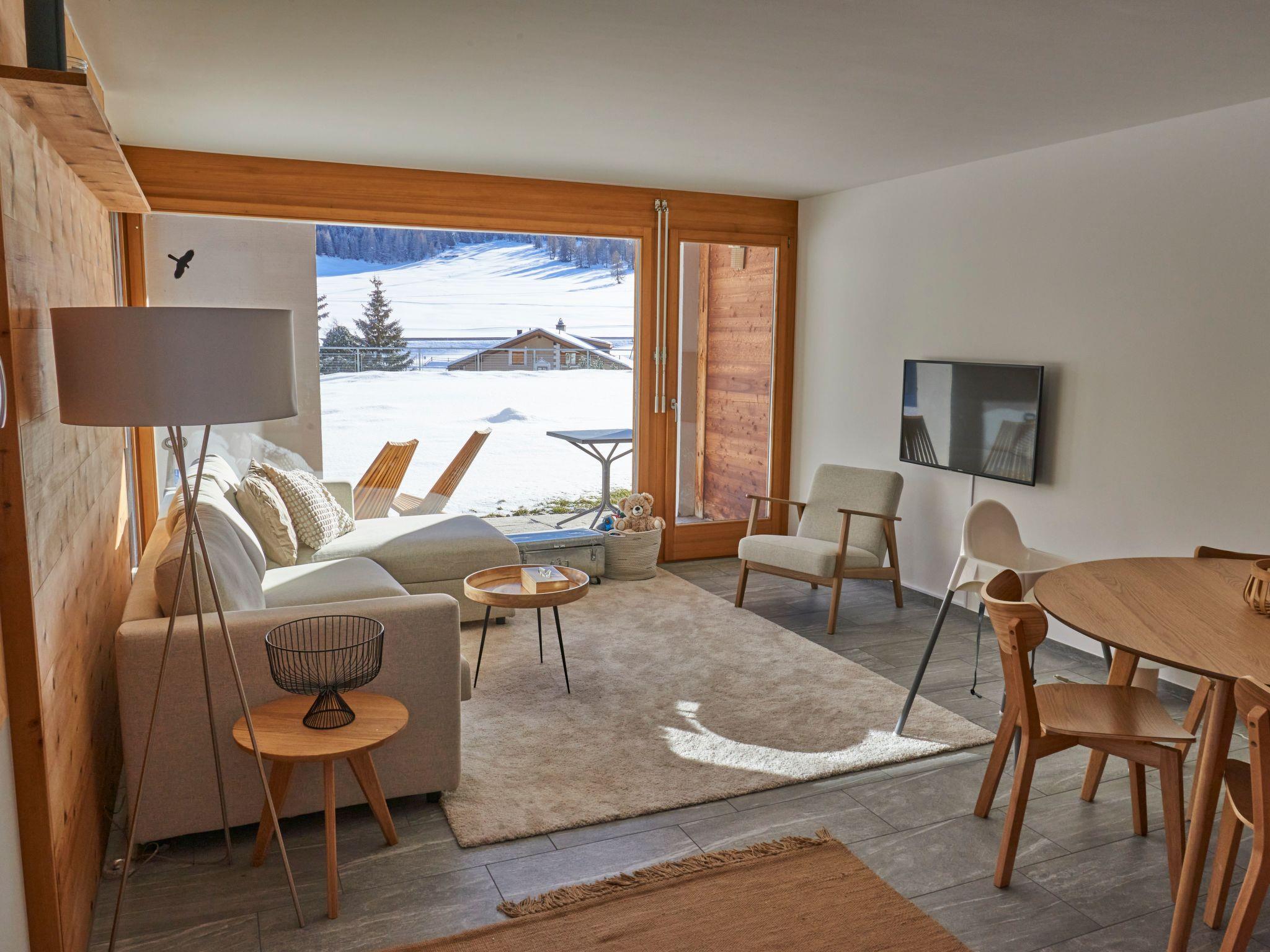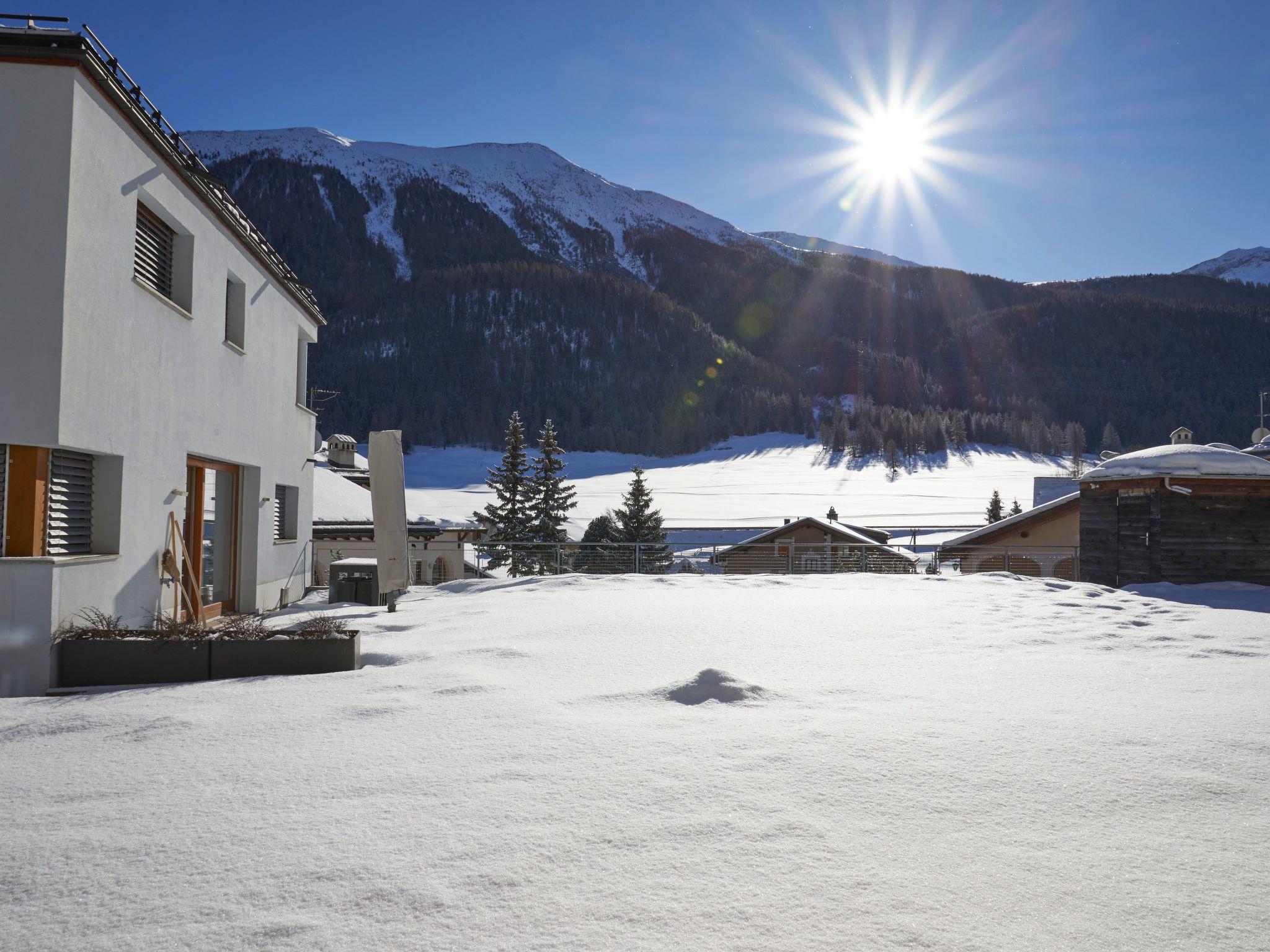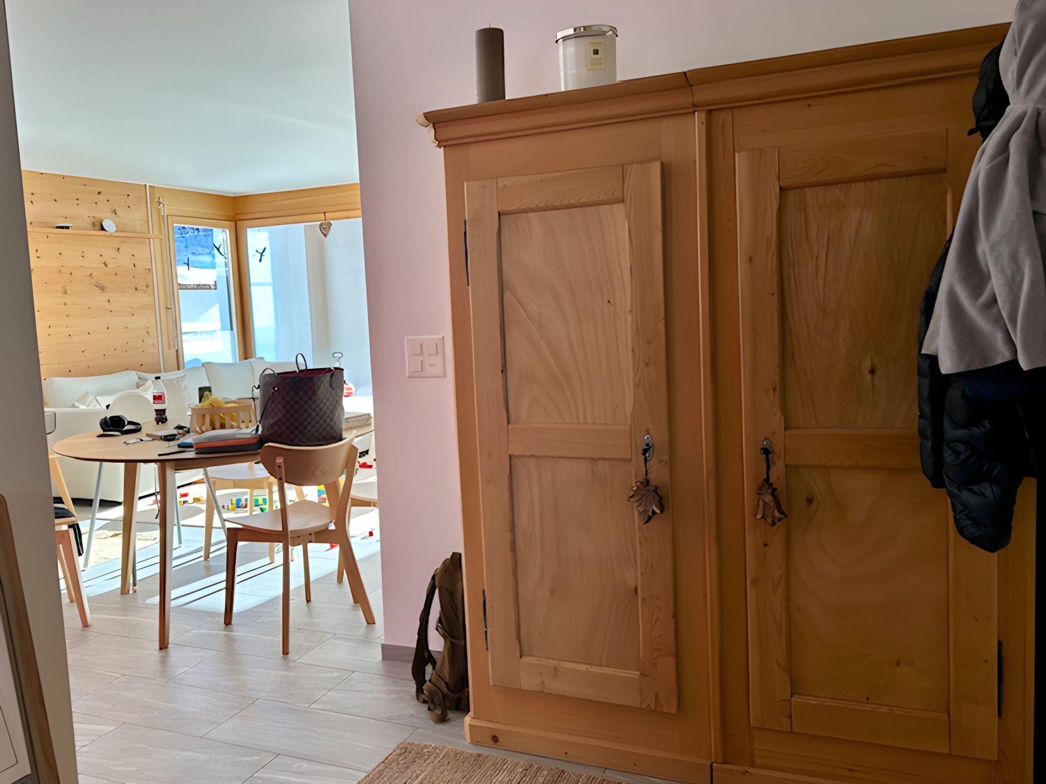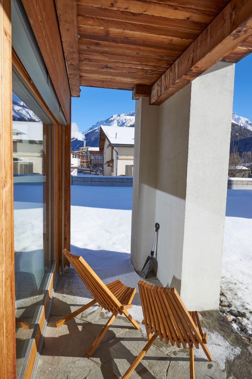 The outdoor area impresses with its idyllic view of the surrounding mountain landscape from the living room, which invites you to linger. Despite the proximity to the Rhaetian Railway and the main road Via Maistra, which is less busy thanks to the new bypass, you can enjoy peace and quiet. An underground car park is available for your car, with direct lift access to the flat. A storage room for skis, snowboards or bicycles provides additional comfort during your stay.