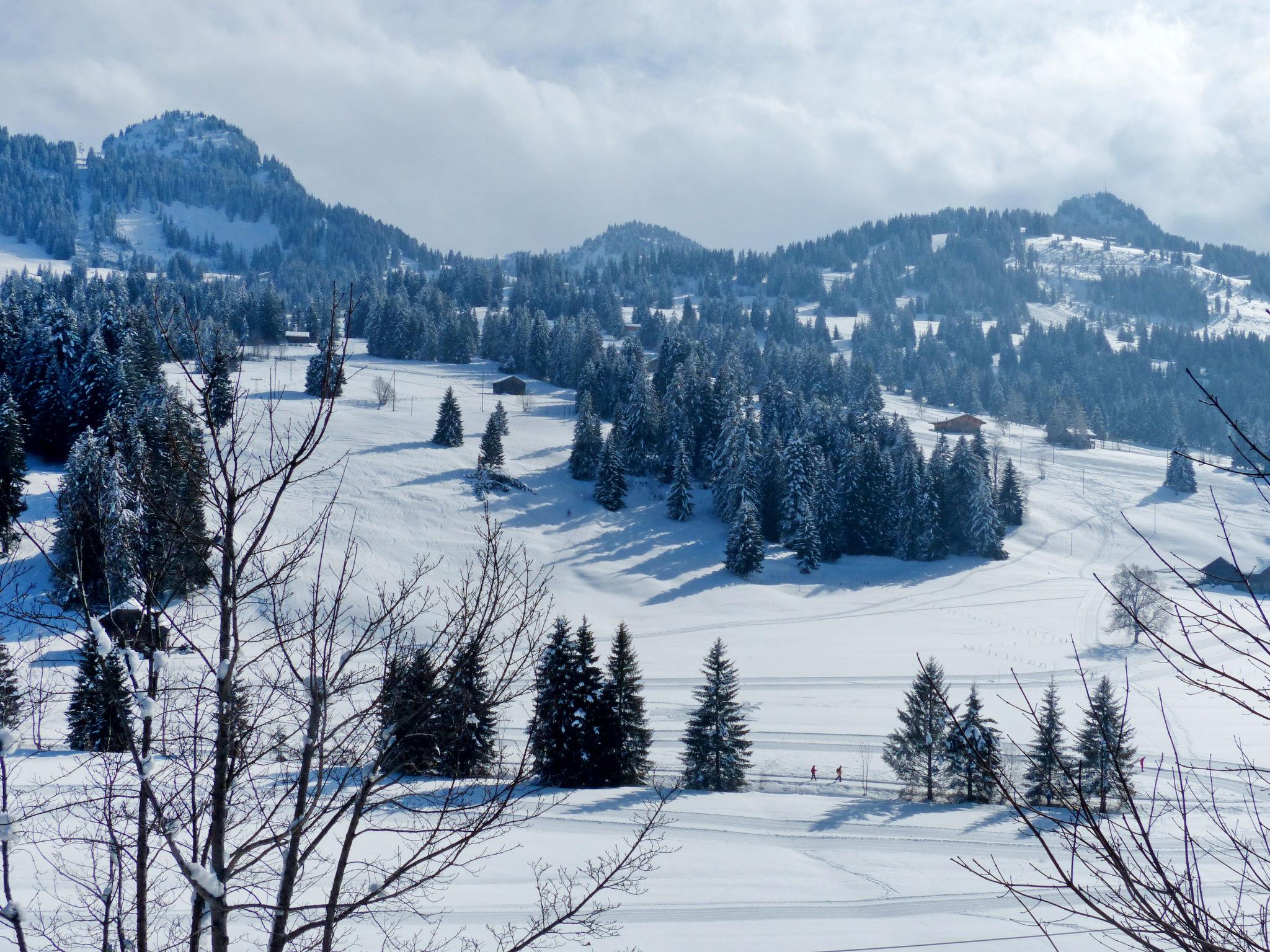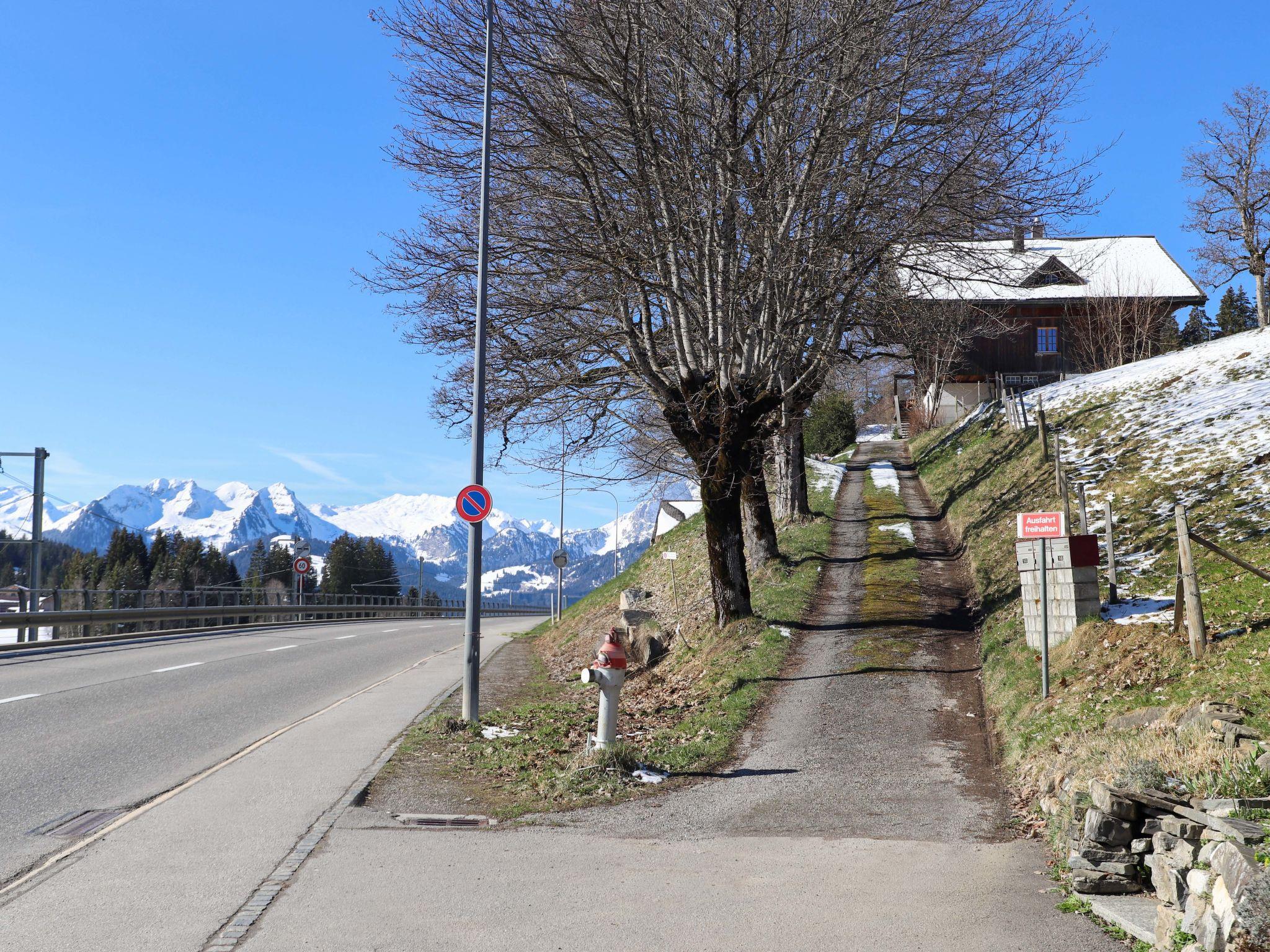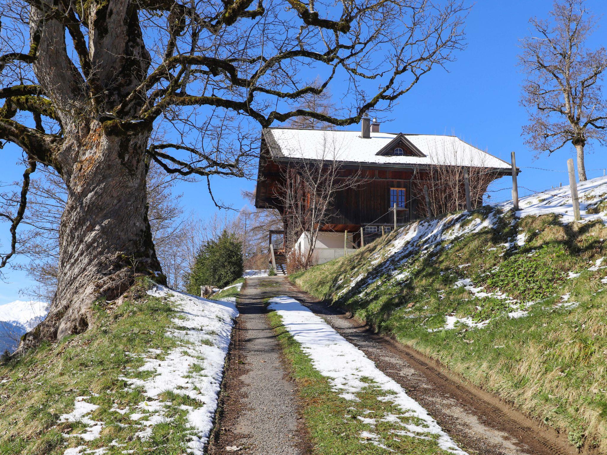 4-room apartment 90 m2 on 1st floor. Spacious, simple and tasteful furnishings: living room with tiled stove. Dining room with dining table. 1 room with 1 double bed (2 x 90 cm, length 200 cm). 1 large room with 2 beds (90 cm, length 200 cm), 1 x 2 bunk beds (90 cm, length 200 cm). Large kitchen (4 hot plates, oven, toaster, kettle, electric coffee machine, raclette grill, fondue Set (cheese)). Exit to the patio. Sep. WC, bath/shower/WC. Wood heating. Heating not available in all rooms. Wooden floors. Patio, west facing position. Box-room. Marvellous view of the mountains, the ski run and the countryside. Facilities: baby cot (extra), hair dryer, logs (extra). Internet (WiFi, free). Parking (1 car) at the house, in winter at 40 m. Please note: suitable for families. Non-smoking house. Smoke alarm, fire extinguisher.