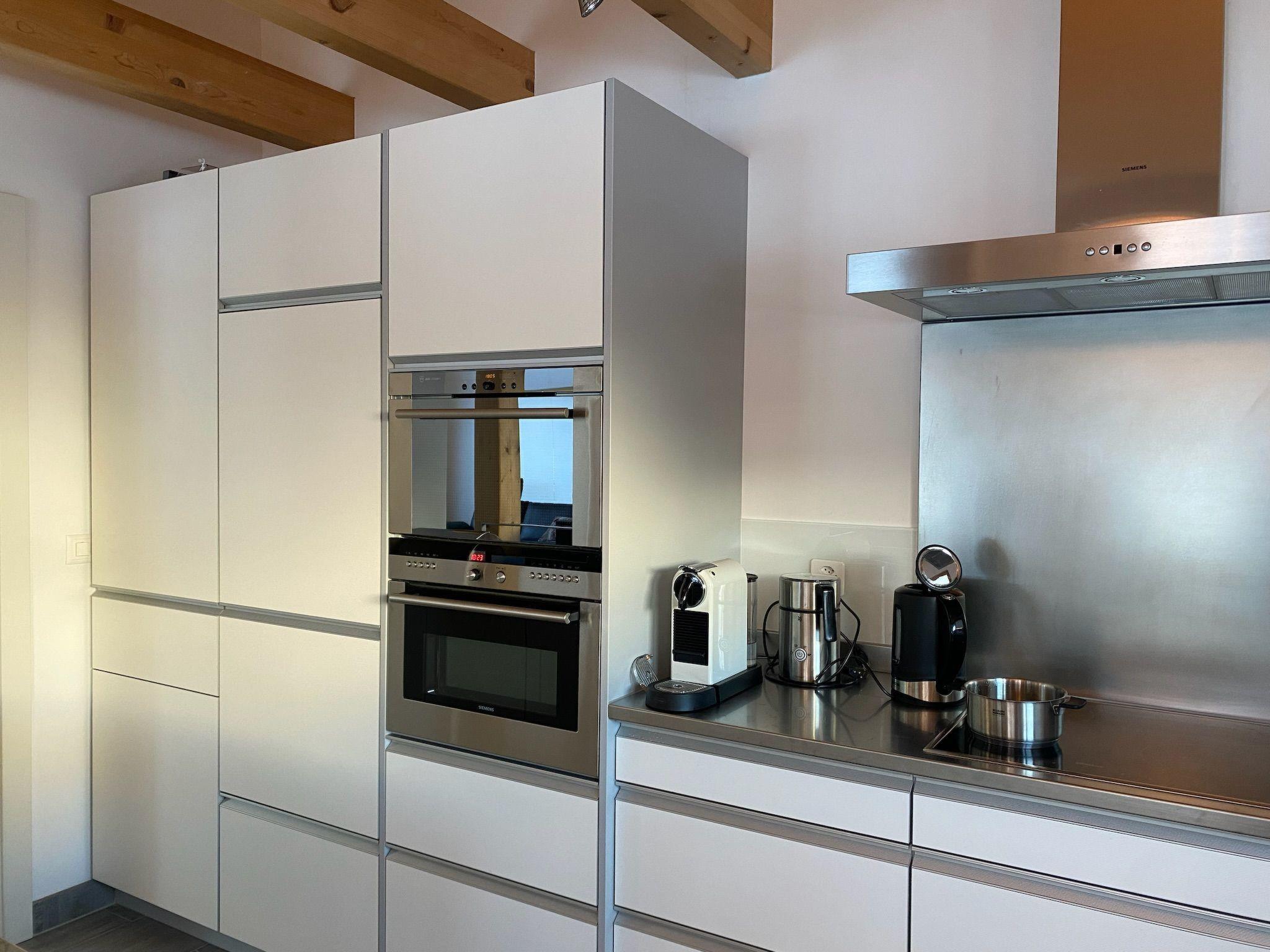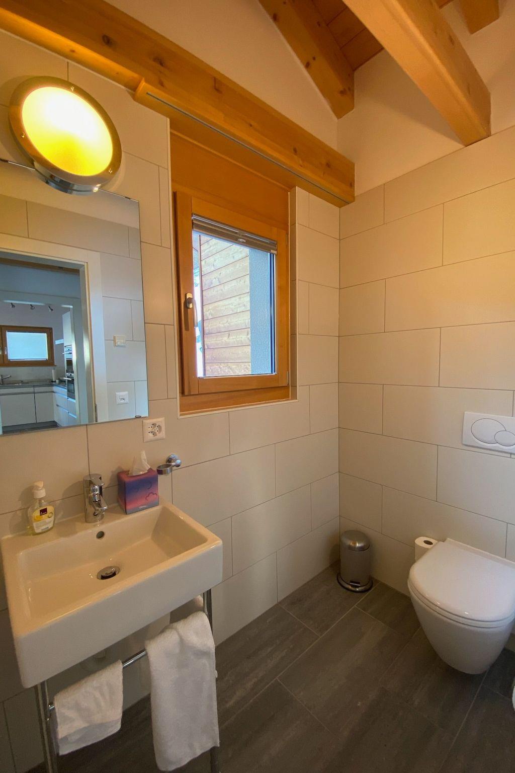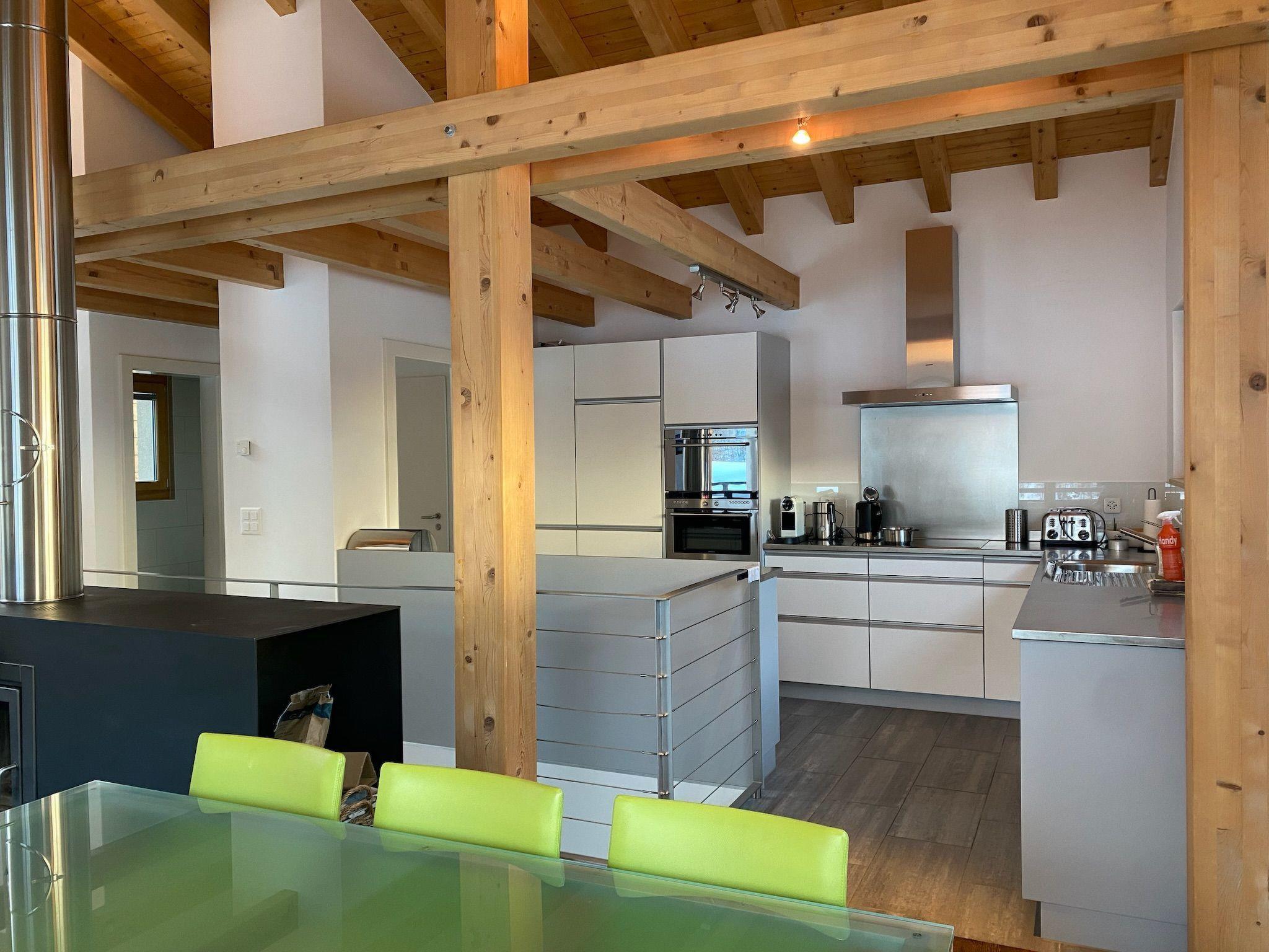 You enter the chalet on the top floor, the living area. Here you will find a toilet, a large sofa & TV, the fireplace, a small table and chair, the dining table with six chairs, the spacious kitchen and a balcony. On the balcony there is a small table, two chairs and two folding chairs. The kitchen has a cooker, a steamer, a microwave oven, a kettle, a coffee machine, a toaster, a dishwasher, a fridge and various utensils for cooking.