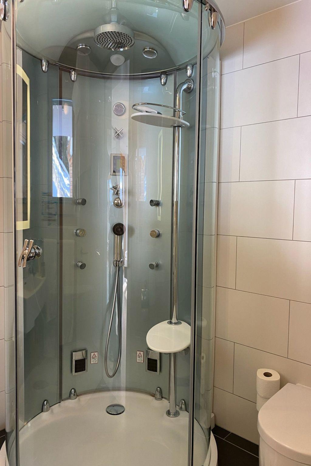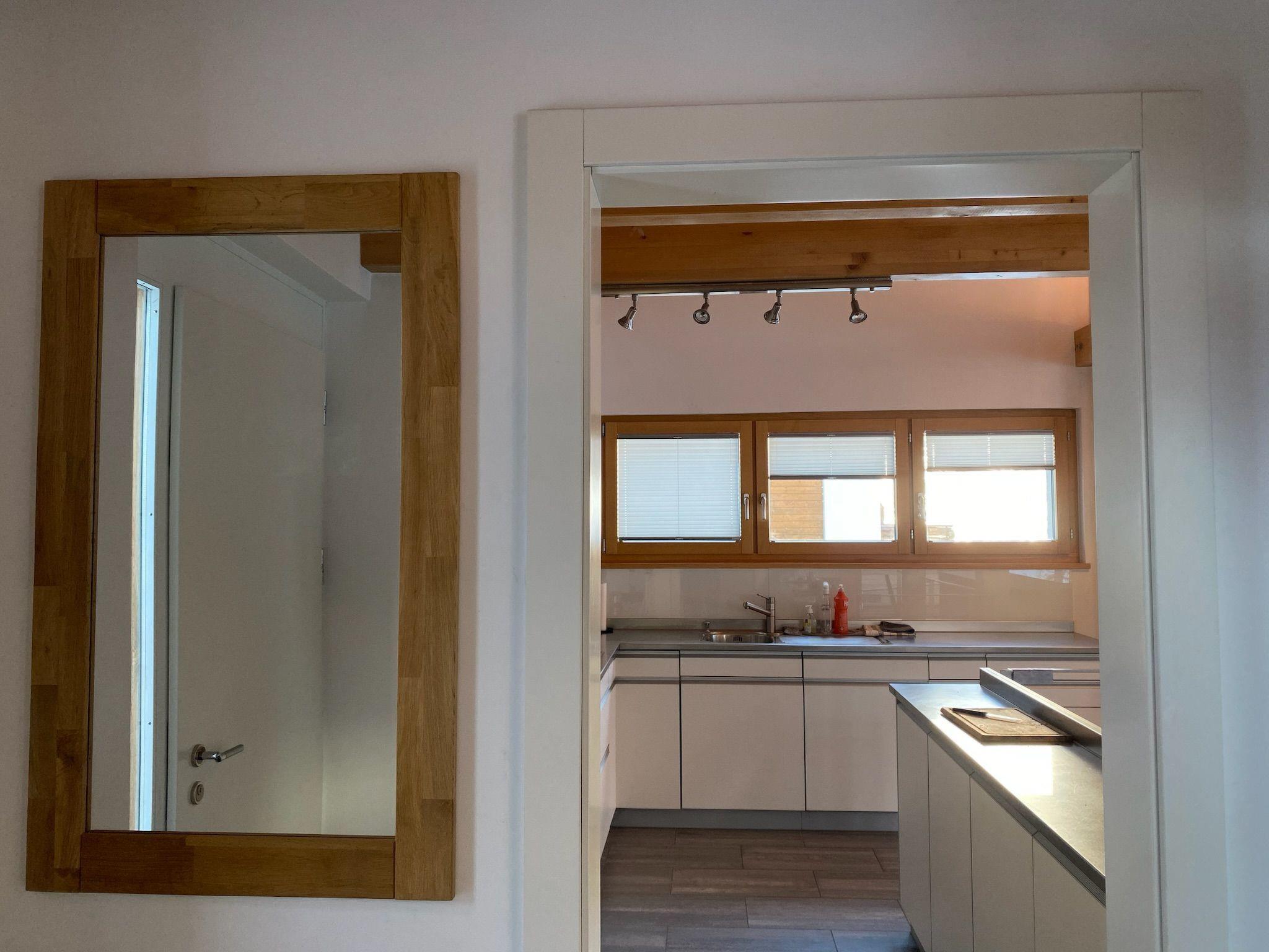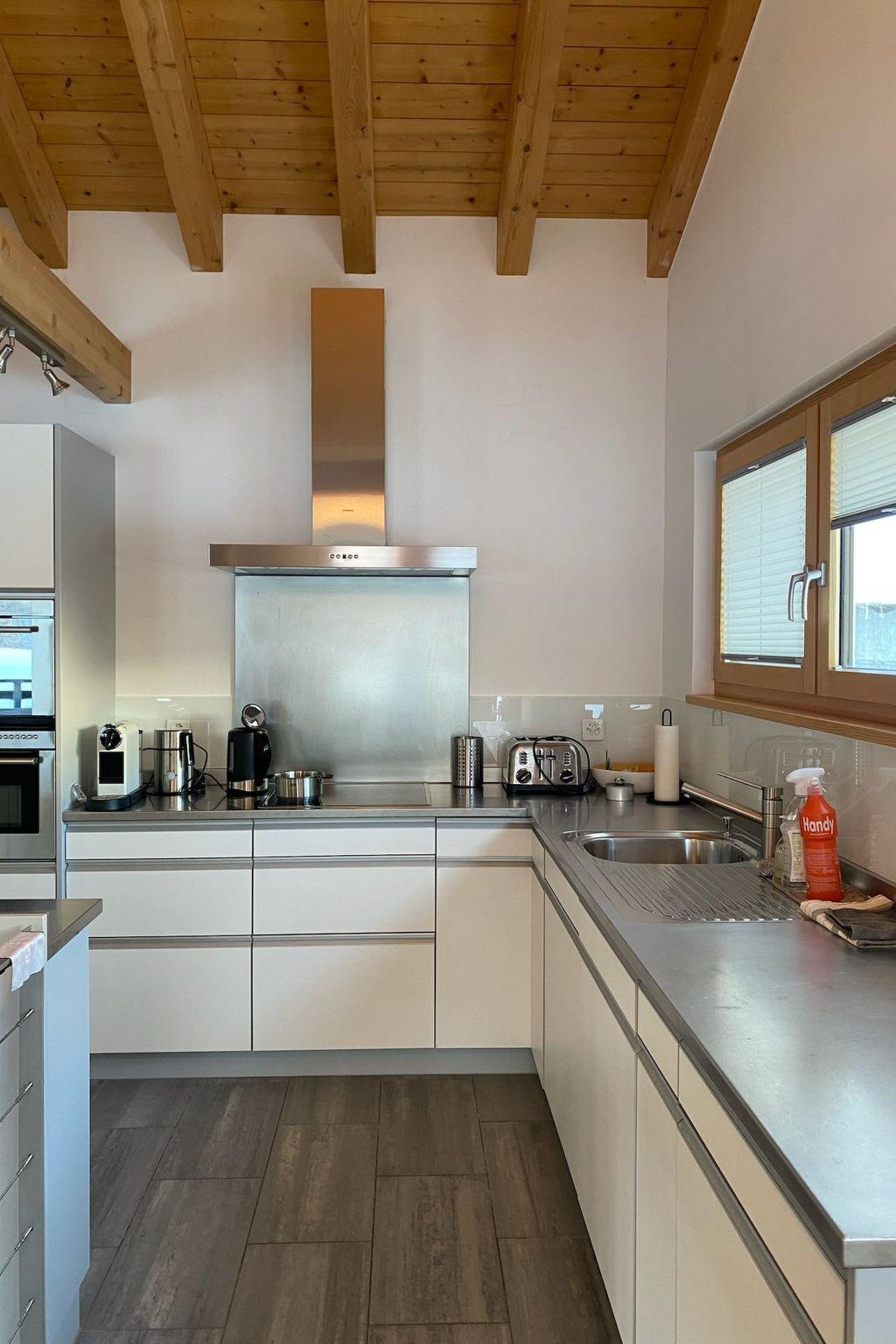 You enter the chalet on the top floor, the living area. Here you will find a toilet, a large sofa & TV, the fireplace, a small table and chair, the dining table with six chairs, the spacious kitchen and a balcony. On the balcony there is a small table, two chairs and two folding chairs. The kitchen has a cooker, a steamer, a microwave oven, a kettle, a coffee machine, a toaster, a dishwasher, a fridge and various utensils for cooking.