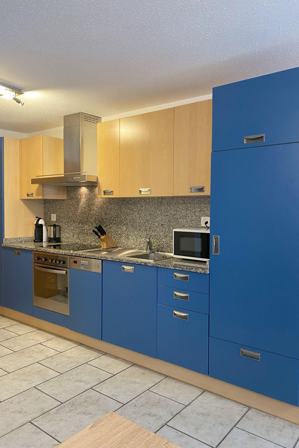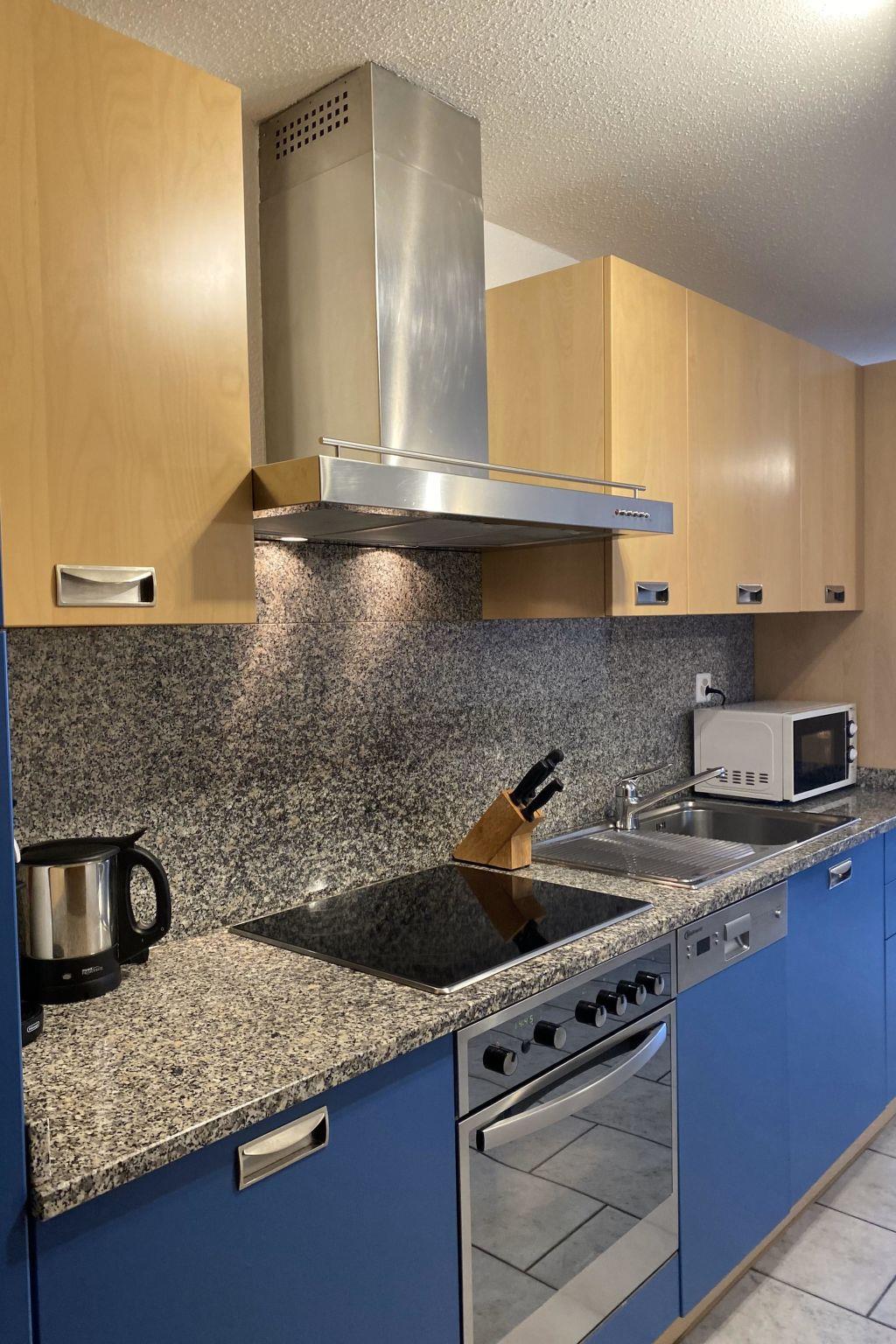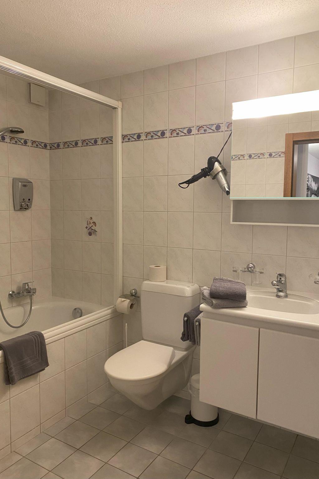 The holiday apartment is situated on the ground floor and faces south, allowing it to benefit from optimal sunlight exposure. The apartment features a spacious living area with an open kitchen, along with two comfortable double bedrooms. The bathroom is equipped with a shower and toilet. To ensure the highest level of comfort and modern conveniences, the holiday apartment is fully equipped. This includes a dishwasher, coffee maker, kettle, microwave, table grill with integrated raclette oven, fondue set, flat-screen TV, radio and complimentary Wi-Fi.Experience a stay in a stylish setting, combined with modern amenities that cater to your expectations of comfort and convenience. Within the house, there is a small fitness room, an infrared sauna and a small library with a play area. Just 50 meters from the house, you'll find the bus stop for postal services and the ski bus.