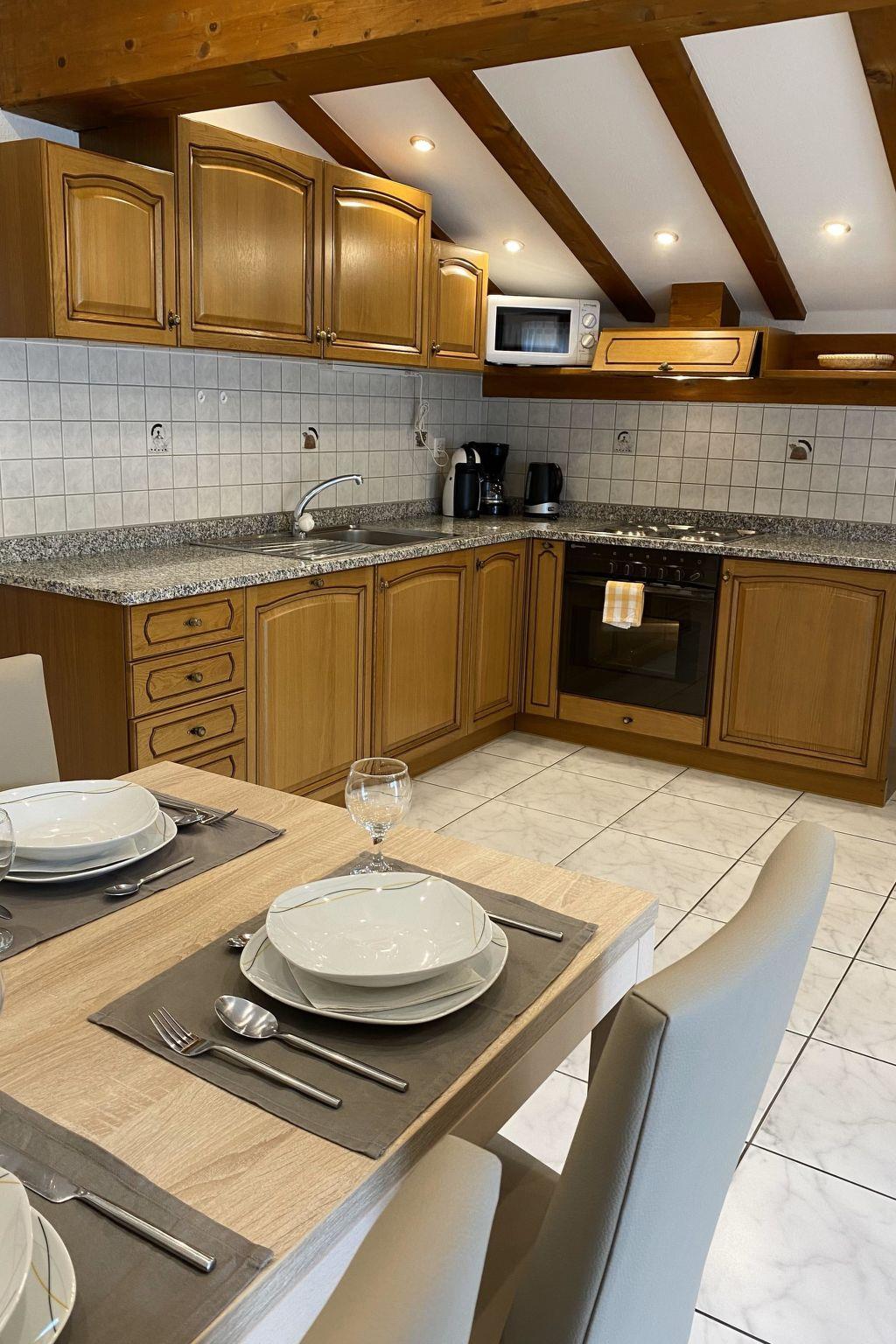 Enjoy flexible comfort in our attic vacation apartment with a south-facing balcony! The apartment not only boasts breathtaking views but also modern comfort. It impresses with a spacious kitchenette and a cozy double bedroom. In addition to the bedroom, the living space is equipped with convenient pull-out box-spring beds that create more room during the day and provide the perfect sleeping spot at night. Experience maximum convenience and space utilization for a carefree stay. Utilize the fully equipped kitchen with a dishwasher, coffee machine, kettle, microwave, tabletop grill with raclette oven and fondue set. A flat-screen TV and complimentary Wi-Fi complete the offering, ensuring your stay becomes an unforgettable experience. Within the house, there is a small fitness room, an infrared sauna and a small library with a play area. Just 50 meters from the house, you'll find the bus stop for postal services and the ski bus.