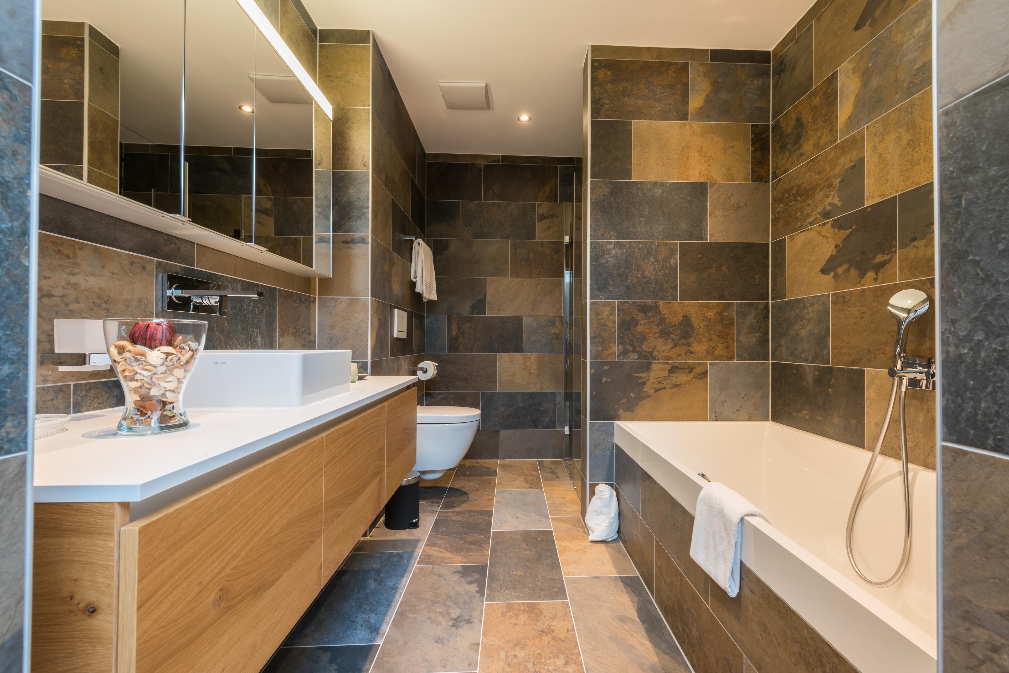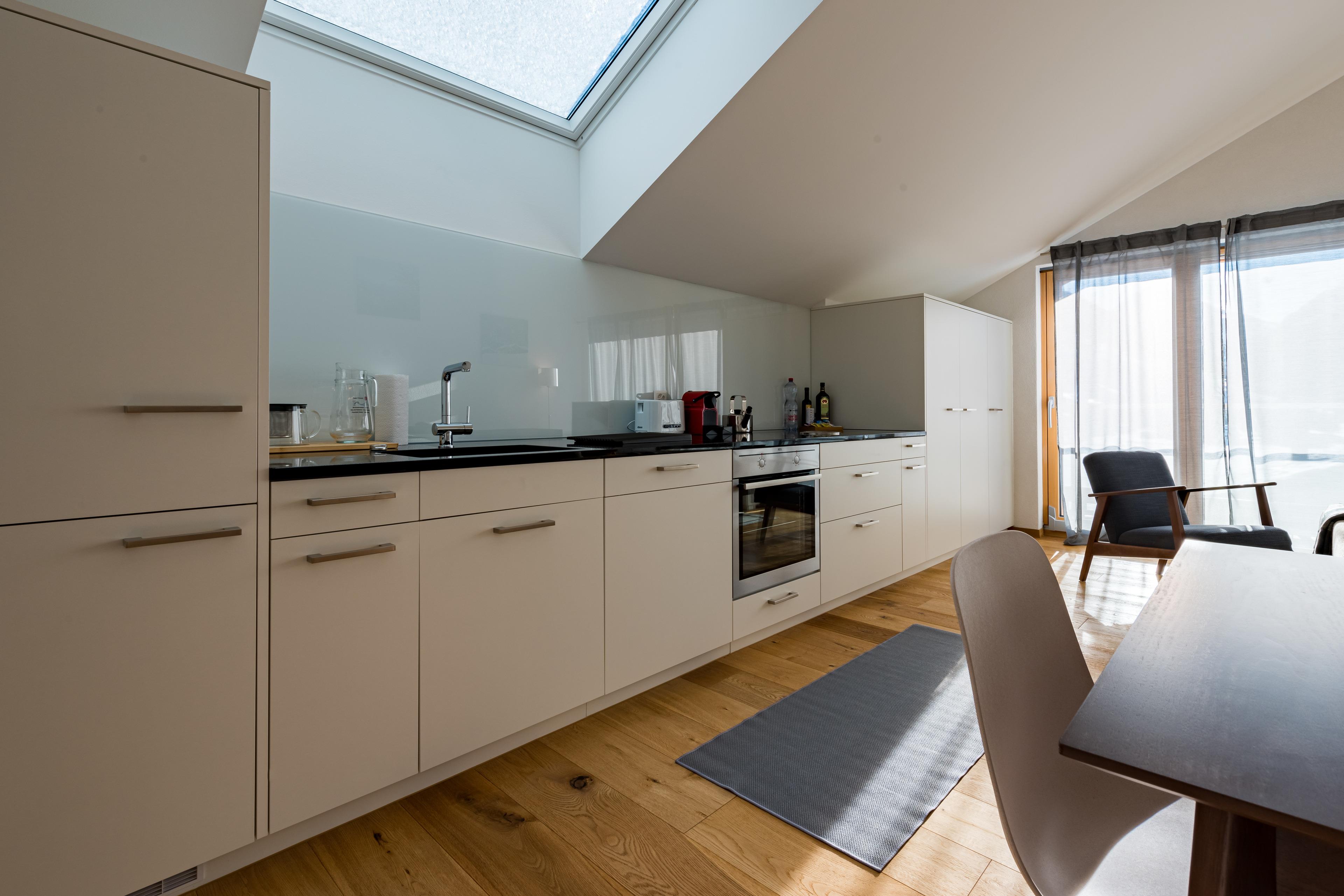 Die modernen Wohnungen sind geschmackvoll, gut und hell eingerichtet, sehr gute Ausstattung. Jeweils Kabel-Flat-TV (Apple-TV) und Radio. Die Küchen sind sehr gut und vollständig ausgestattet mit Einbauherd (4 Veranfelder), Backofen, Mikrowelle, Geschirrspüler, Kühl-/Gefrierkombination, Filter-Kaffeemaschine, Nespresso-Kapsel-Kaffeemaschine, Wasserkocher, Toaster, Fondue-Rechaud und Raclette-Gerät. Holzdielenböden im Wohnraum und Schlafzimmern mit Fußbodenheizung. Jedes Bad mit Haartrockner.