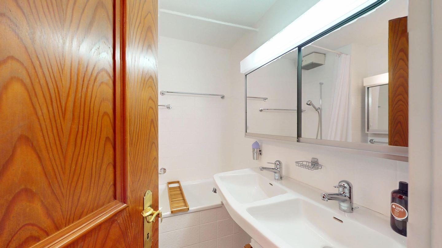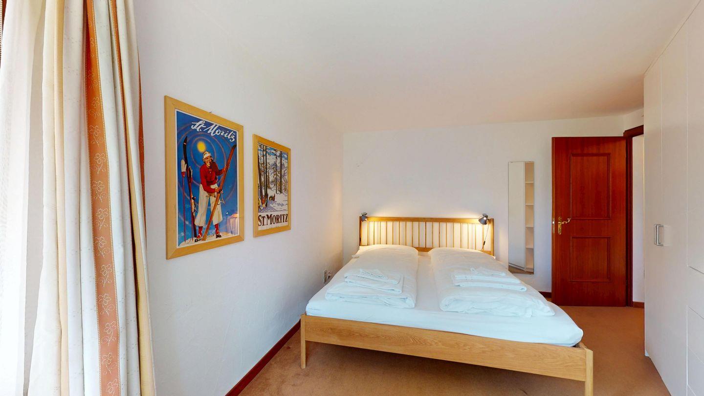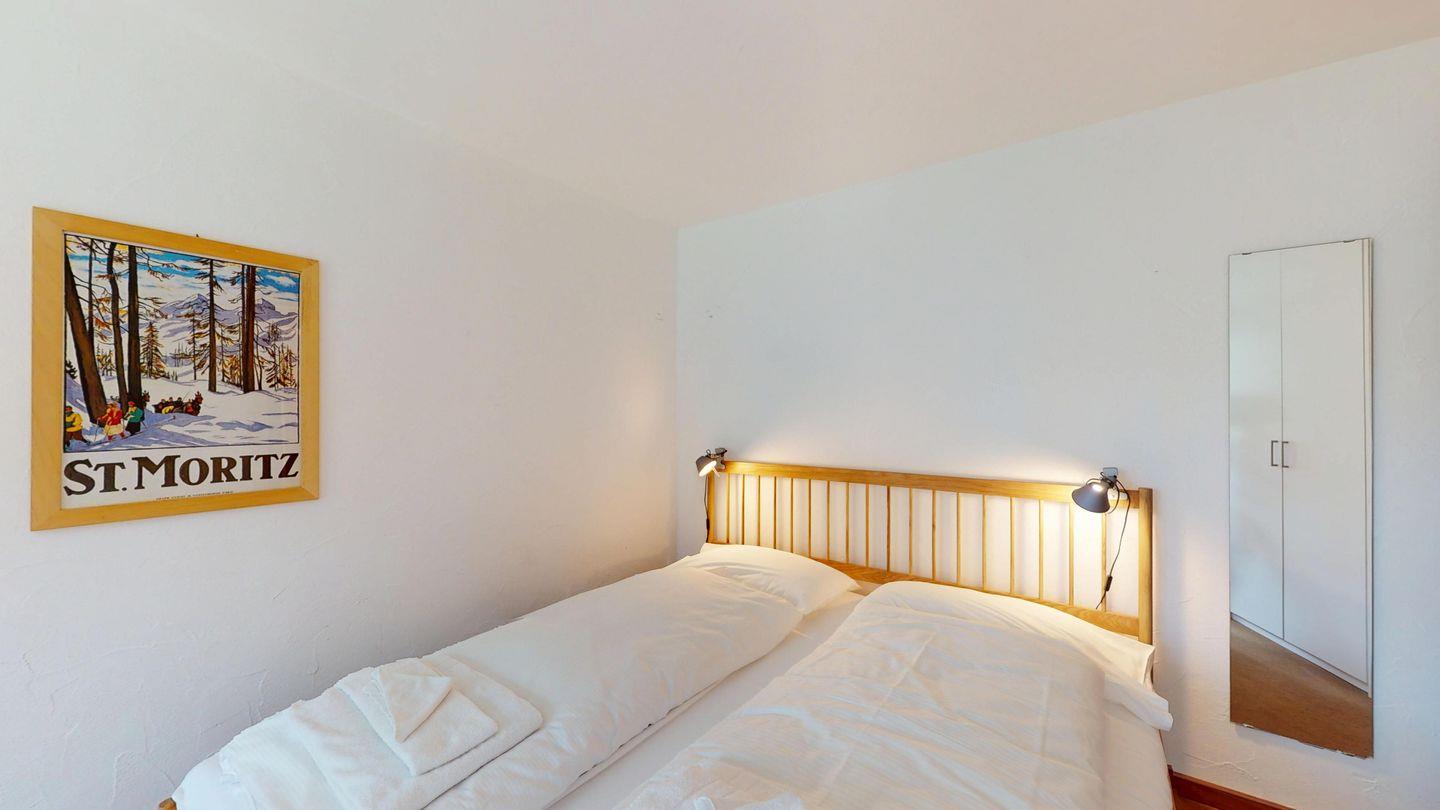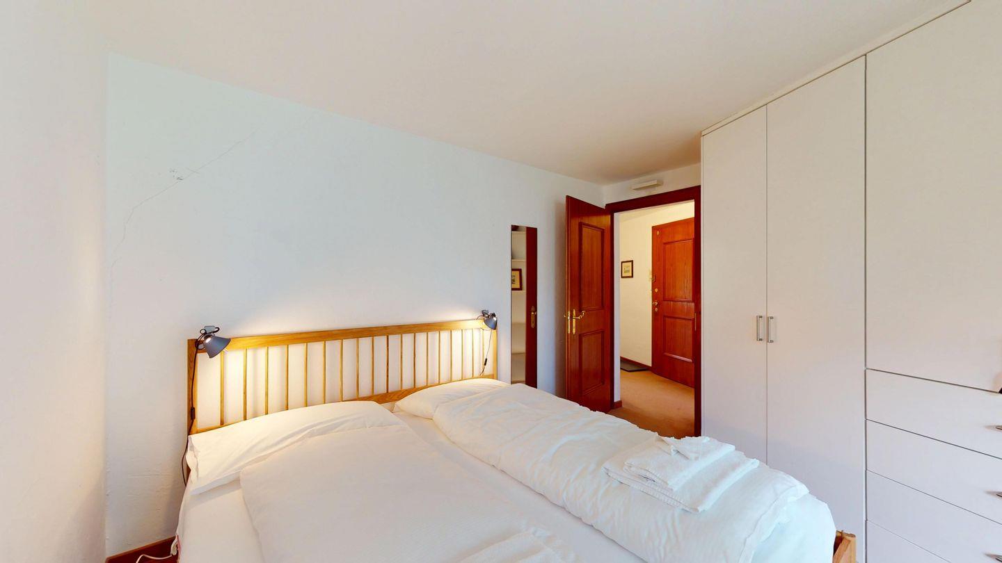 2½ Zimmerwohnung mit ca. 60 m² im 1. Stock mit Aufzug. Eingang mit Garderobe, Wohn- / Essbereich, Ausgang zu einem kleinen Balkon mit Blick auf die Berge. Fernsehen und Internet. Kleine separate Küche mit Backofen, Kühlschrank, Kaffeemaschine und Geschirrspüler. Schlafzimmer mit Doppelbett. Badezimmer mit Badewanne, Waschbecken und Bidet. Ein Garagenparkplatz (190cm hoch). Waschküche und Skiraum.
