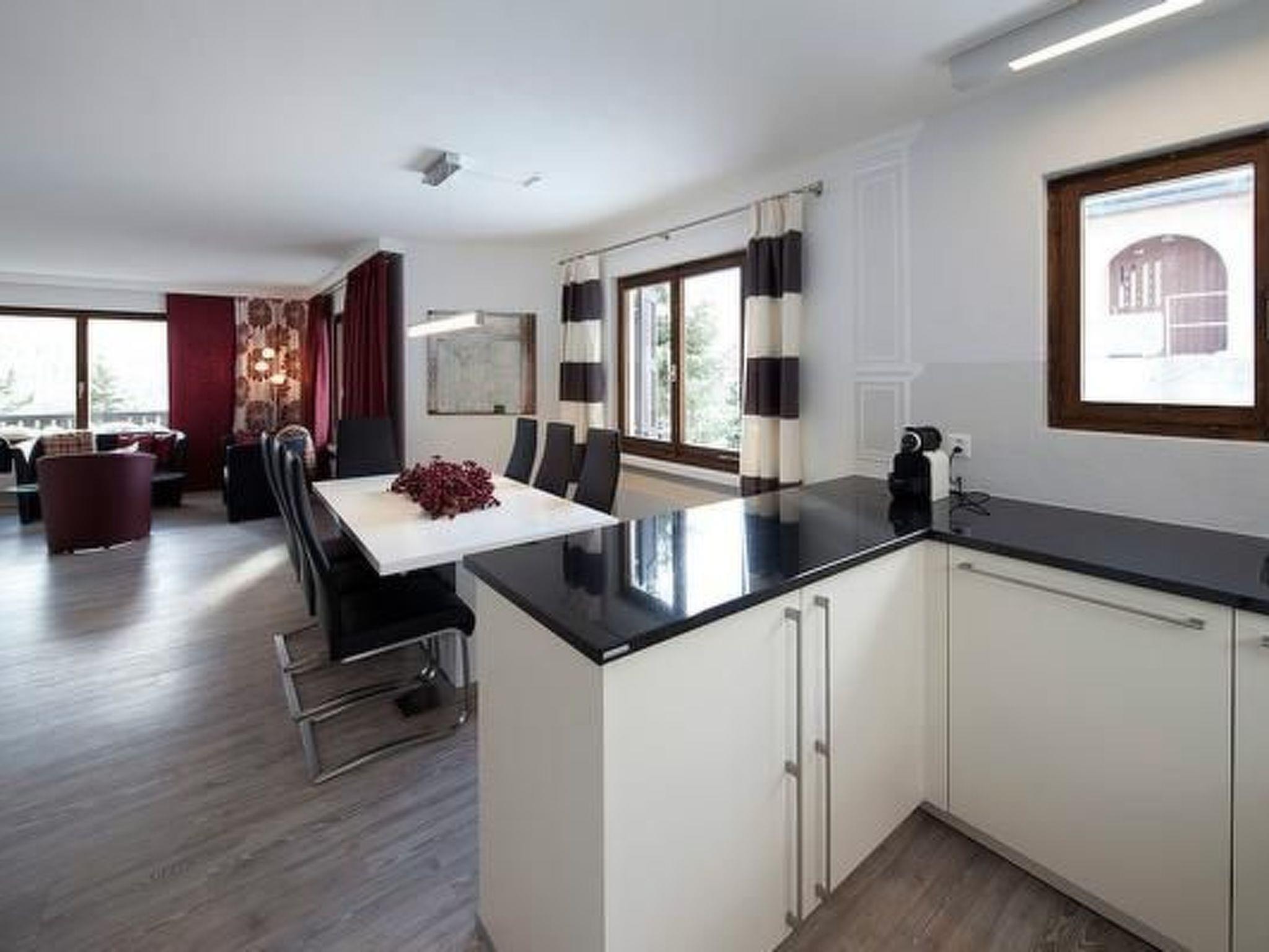 Inside, the flat welcomes you with modern furnishings that leave nothing to be desired: Comfortable leather furniture in black and bordeaux, plenty of cushions and blankets for hours of relaxation, large windows offering views of the impressive surroundings and an open granite fireplace for cosy evenings. The fully equipped kitchen includes high-quality appliances such as a Nespresso machine, dishwasher and microwave as well as a fondue and raclette set. The living area delights with entertainment electronics such as a large TV including Blueray/DVD player, free WiFi and a selection of films and games.