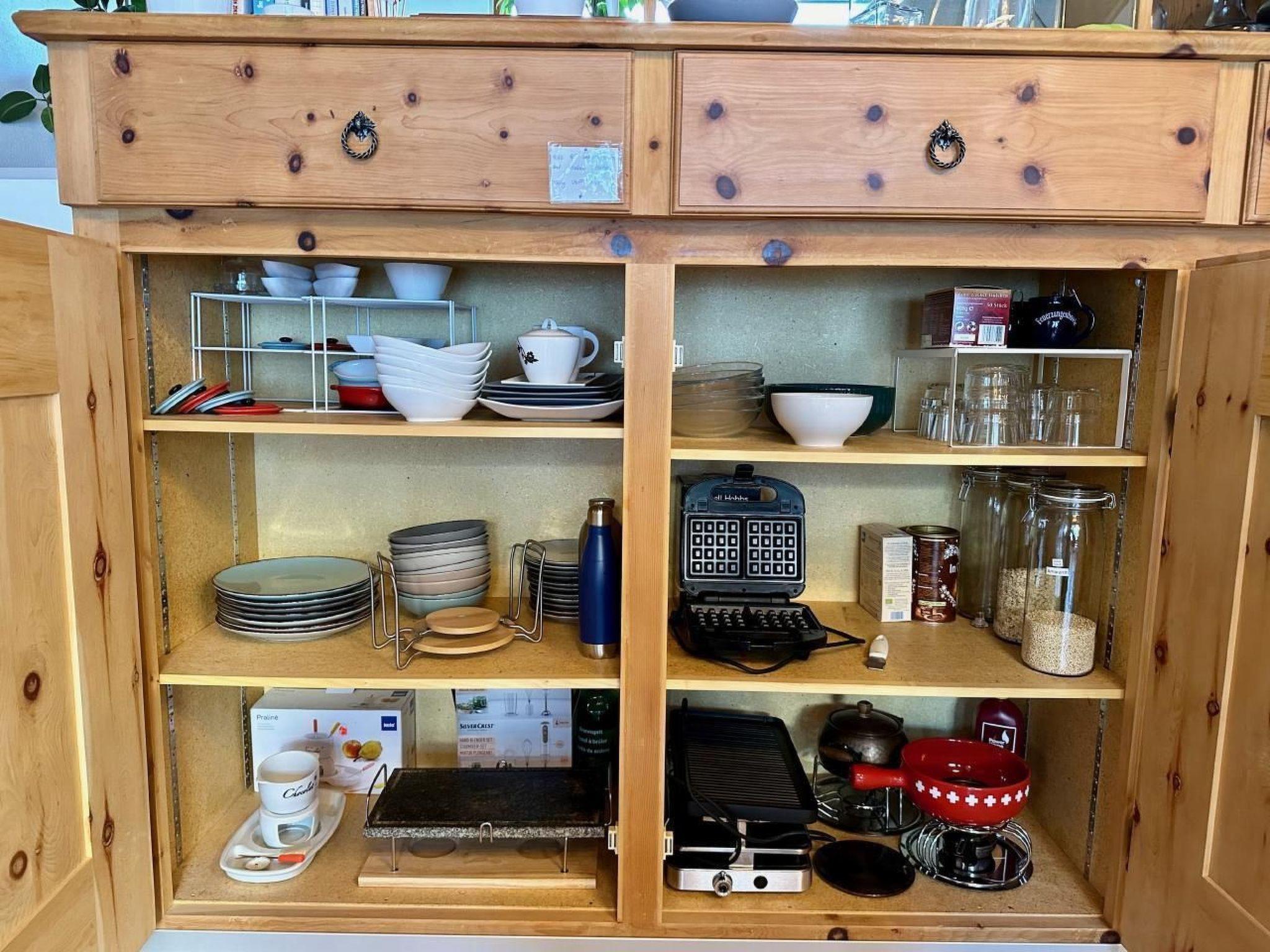 Other kitchen equipment (Kitchen1): Newly fitted kitchen in the colours anthracite and white, with some special design elements such as a height-adjustable extractor hood and a small seating bar, continuous granite worktop with open serving hatch to the dining room, separate yet open kitchen with a view of the garden, oversized induction hob with flex induction and large sink, big size dishwasher, fridge with freezer compartment, steam oven. Various supplies for everyday use are always freshly replenished. The coffee comes from the Jura fully automatic machine or various French presses, depending on your preference. The equipment will inspire you and cooking enthusiasts will be delighted: furnished to property standard with many electrical appliances such as raclette, fondue, food processor, waffle iron, chocolate fondue, hot stone....here you will find (almost) everything.