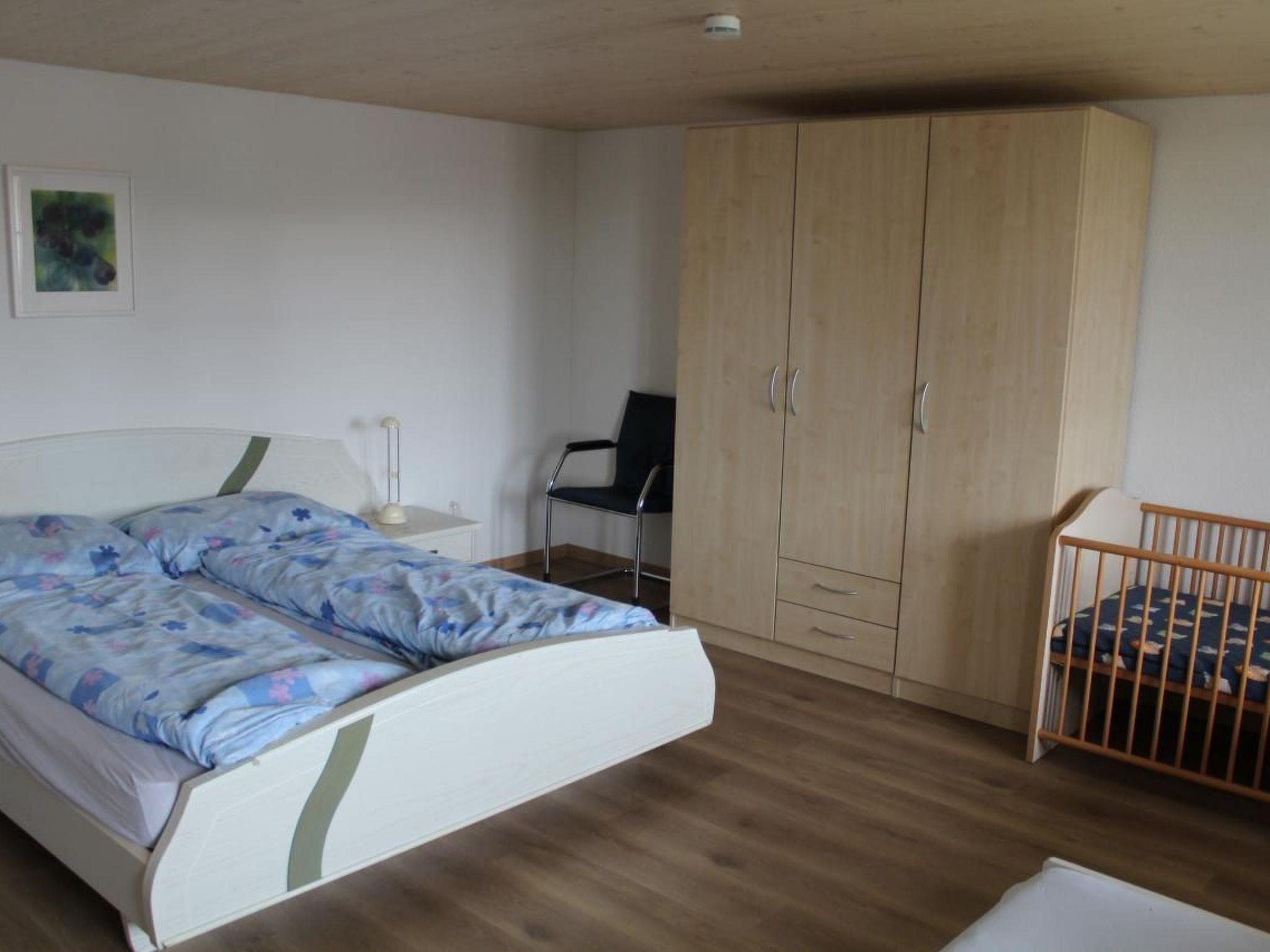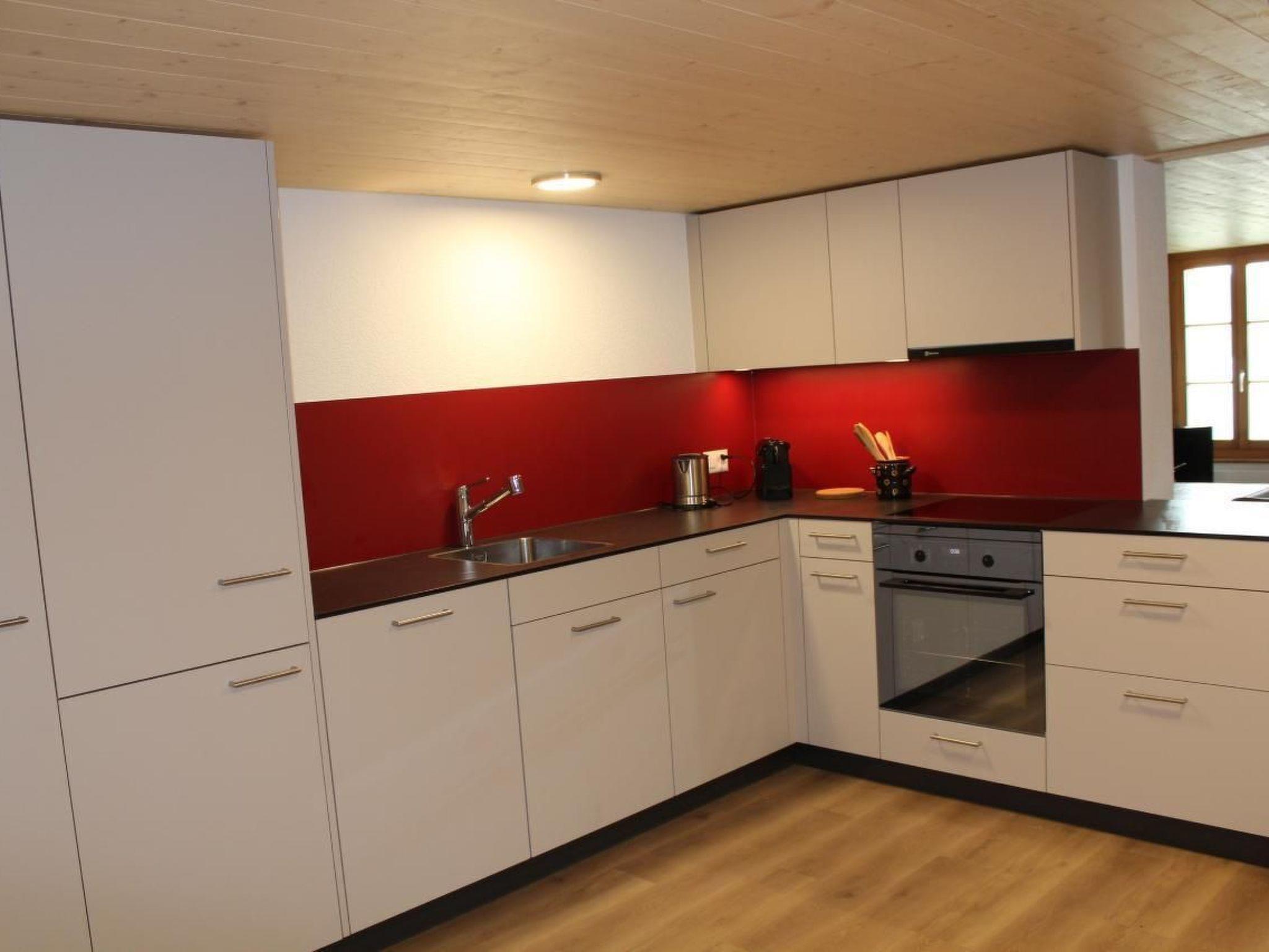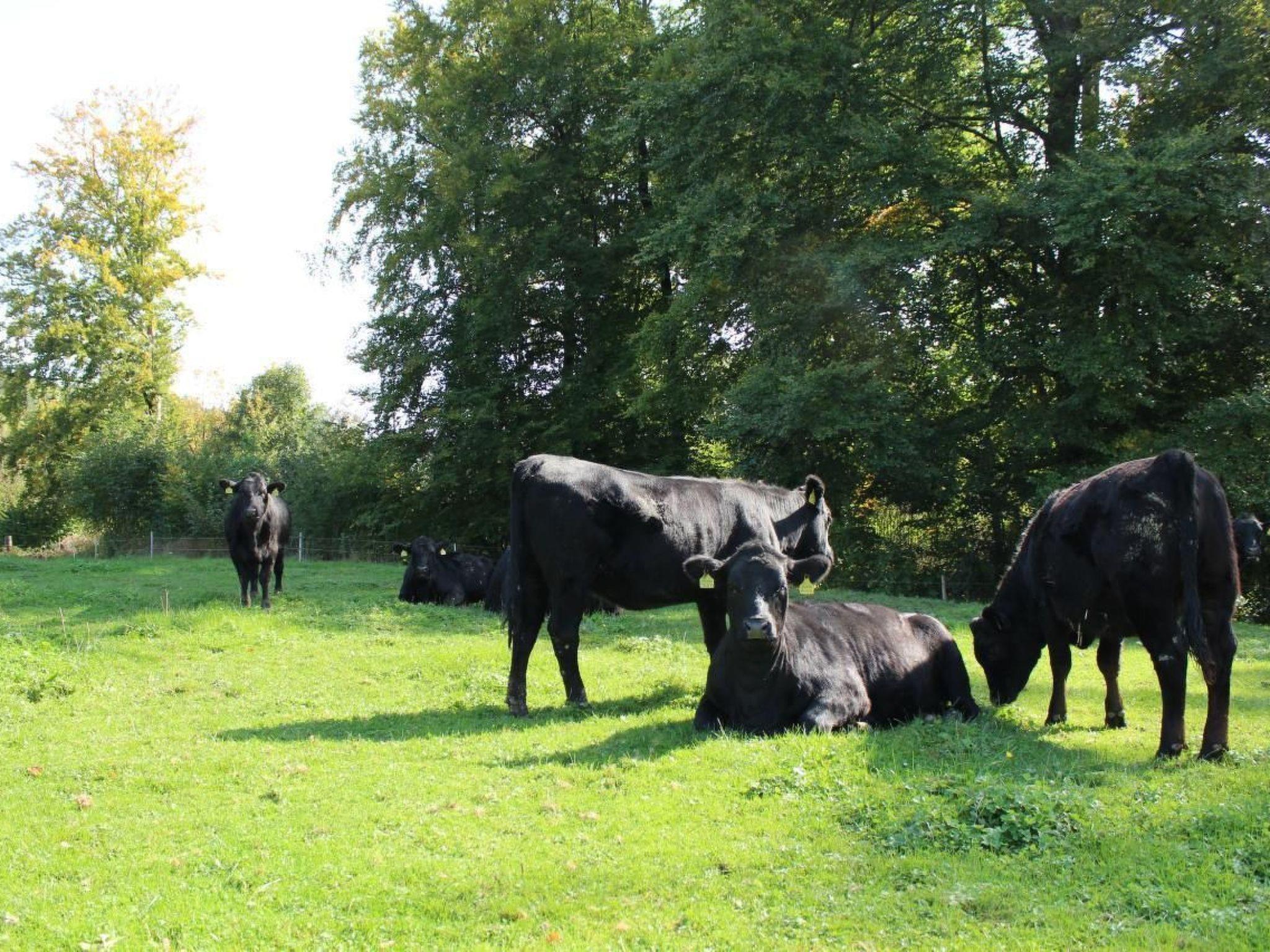 Kitchen with dishwasher, microwave, fridge with separate freezer compartments, oven and hob, living room with dining table, sofa and TV. Bathroom with walk-in shower and WC. WLAN is available free of charge. The seating area belonging to the flat was newly built in spring 2024 and is located right next to the children's playground. For the children there is a trampoline, a slide and several children's swings. Of course, you are also welcome to use our new pool. From the seating area you can enjoy a wonderful view towards the Jura and watch our Angus cattle grazing.