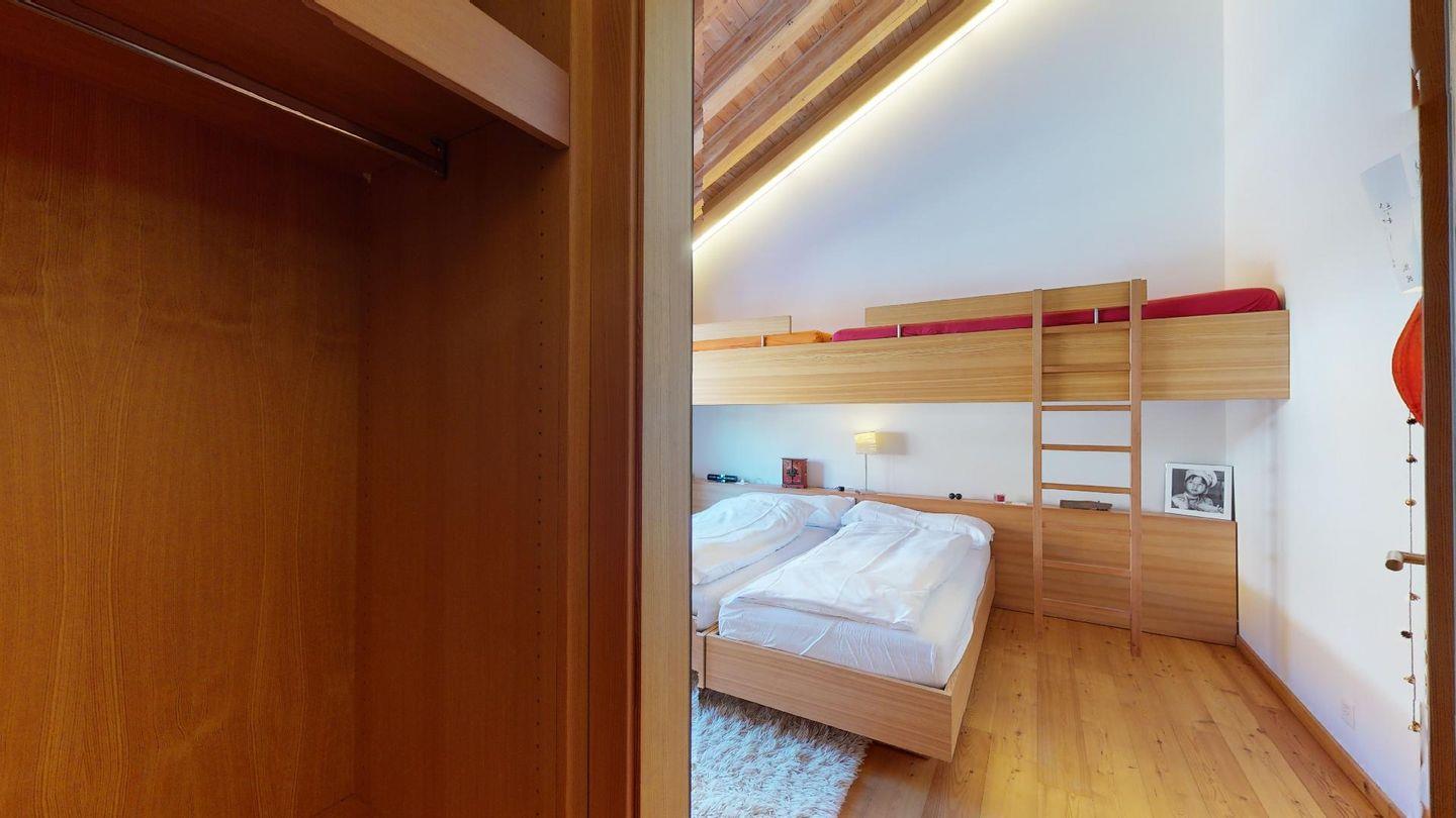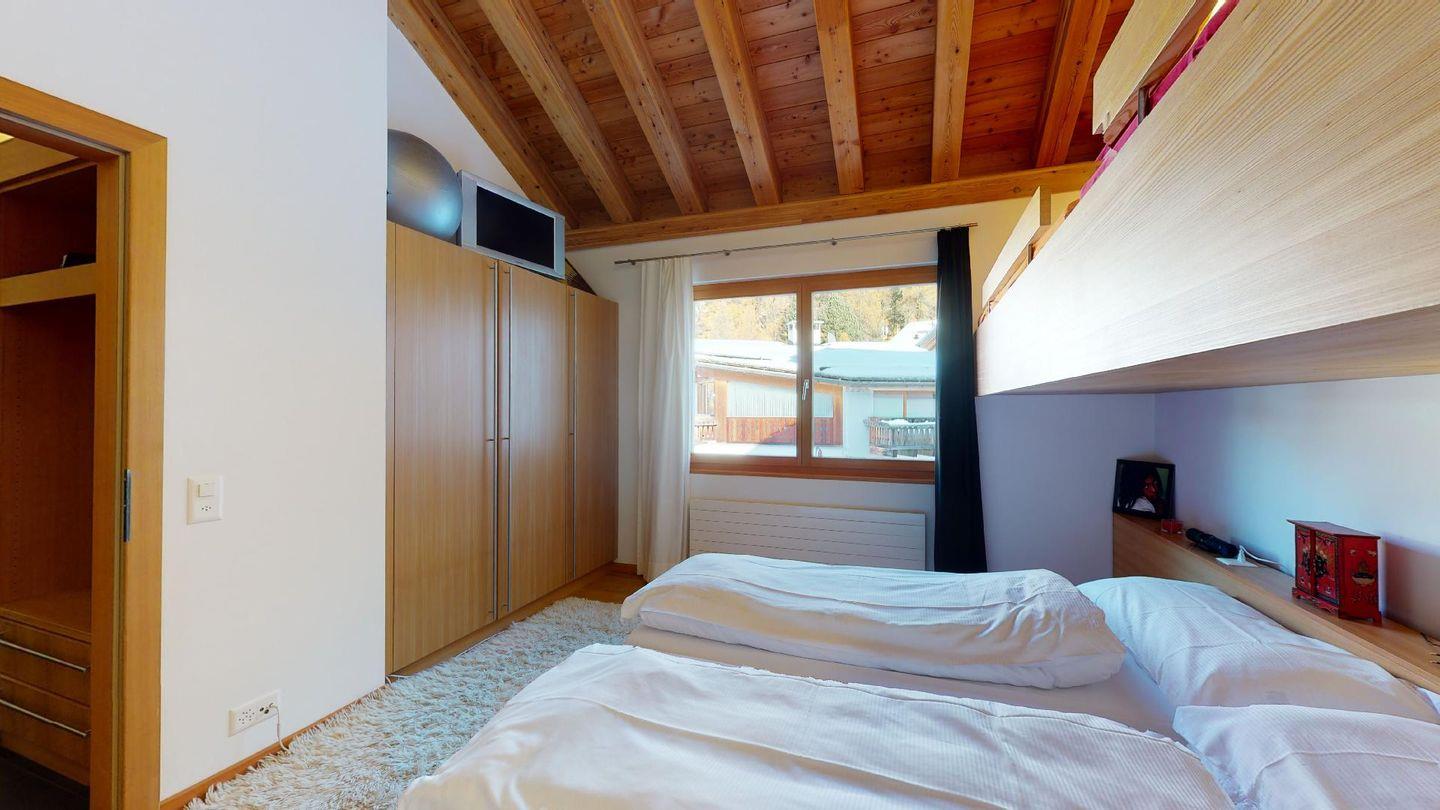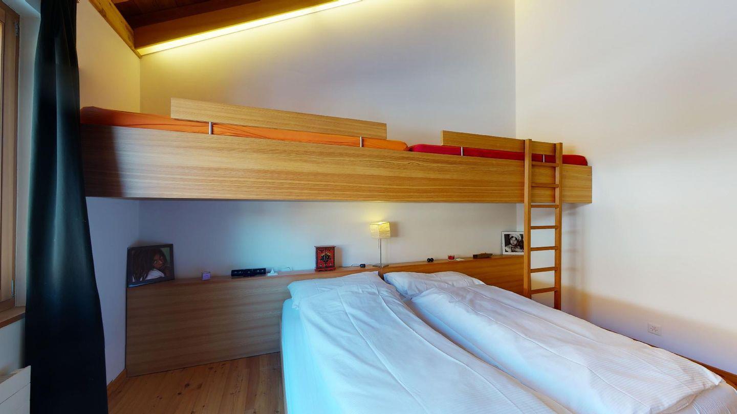 Grosse 3-½ Zimmermaisonette Wohnung im 2. Stock. Eingang mit grosser Garderobe. Ein Doppelschlafzimmer mit eigenem Badezimmer. Ein Schlafzimmer mit zwei Einzelbetten und zwei Hochbetten. Badezimmer mit Dusche. Obere Etage mit offener Küche mit Kühlschrank, Tiefkühler, Herd, Ofen, Mikrowelle und Geschirrspüler, Essecke sowie Balkon. Wohnzimmer mit TV und Kamin. Gemeinschaftliche Waschmaschine. 2 Parkplätze in der Tiefgarage. Haustiere sind nicht erlaubt.