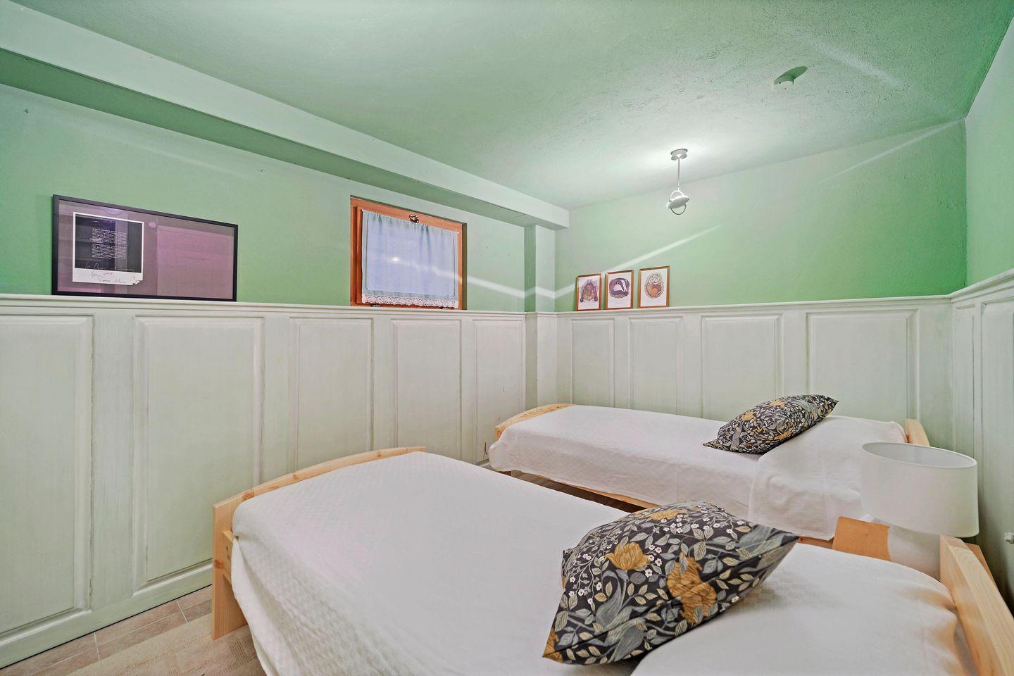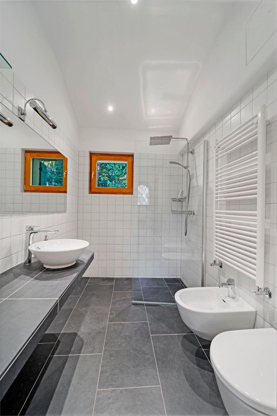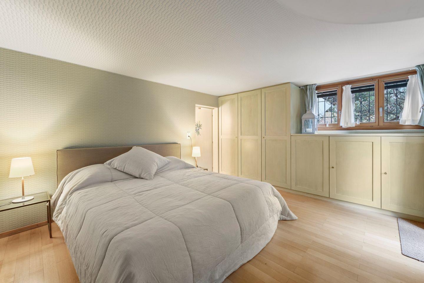Im Untergeschoss: Doppelzimmer mit Schlafcouch und direktem Zugang zum Garten. Doppelzimmer mit 2 Einzelbetten. 2 Badezimmer mit Dusche/WC/Bidet und Lavabo.